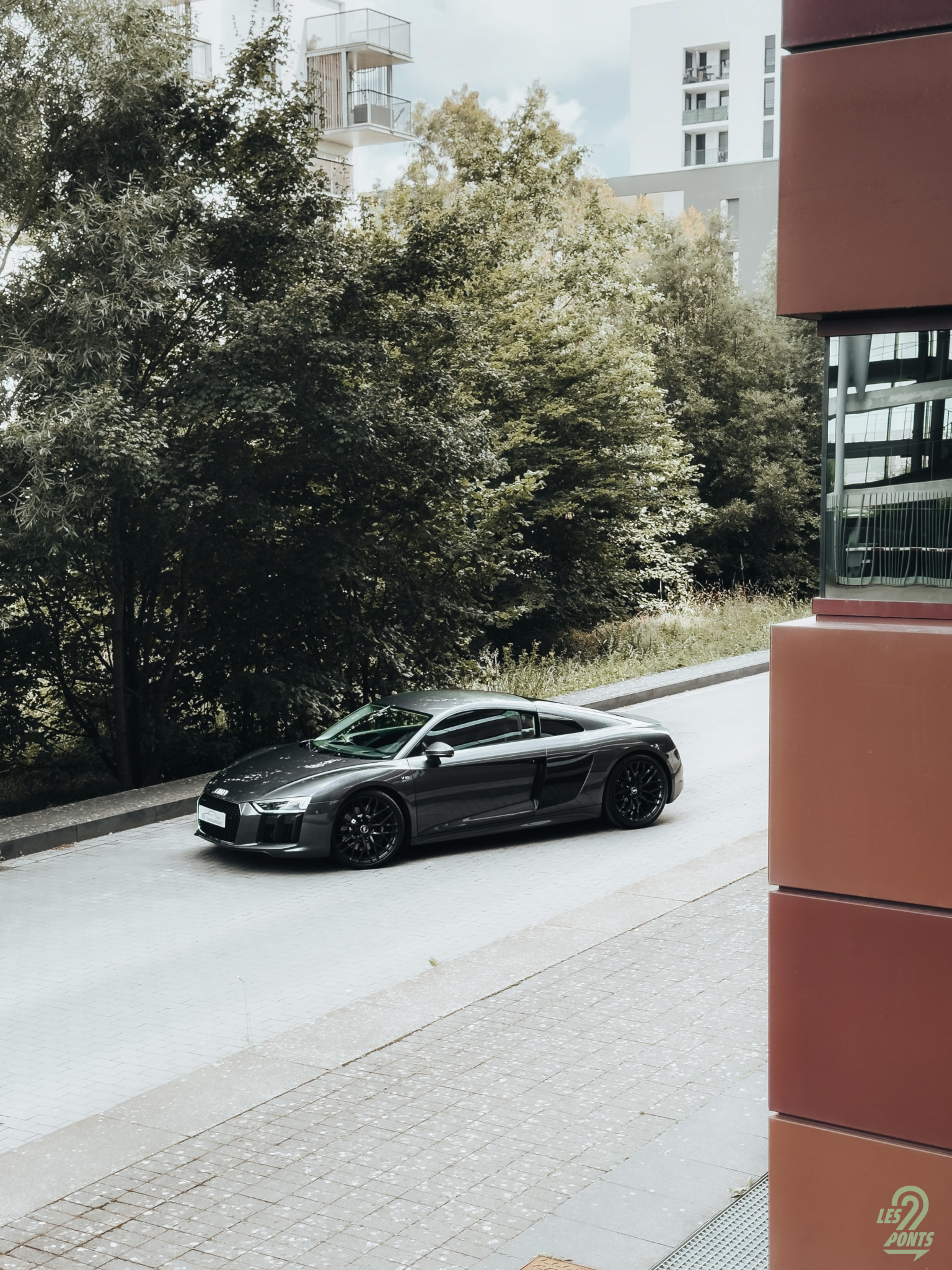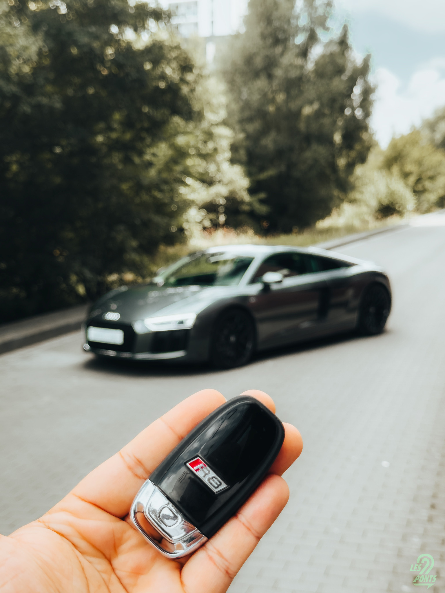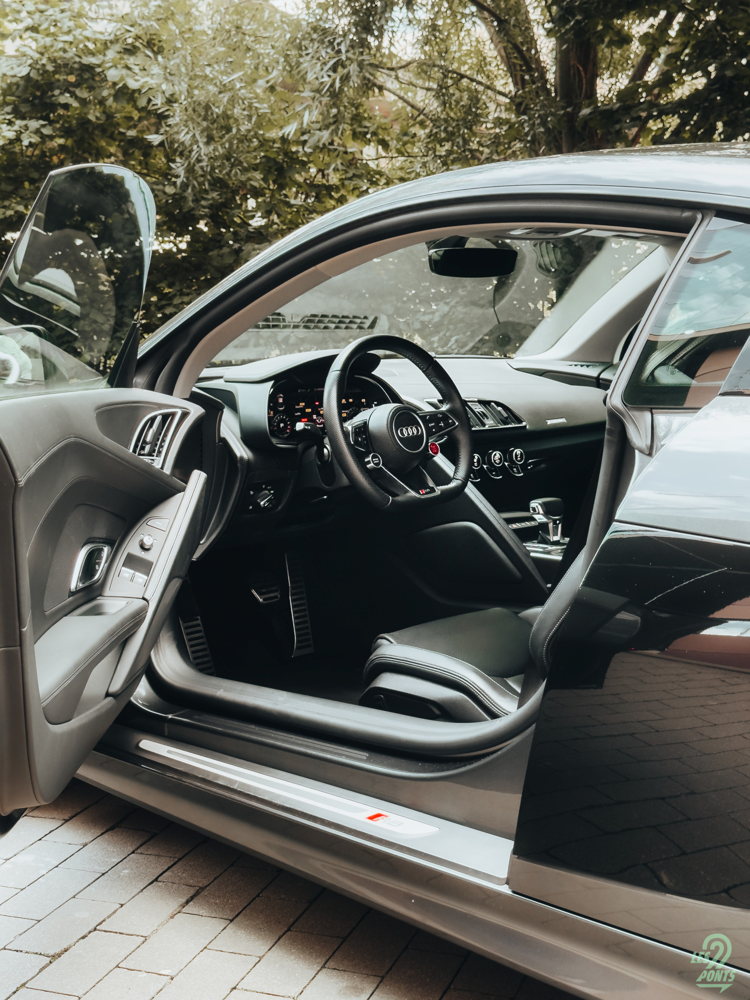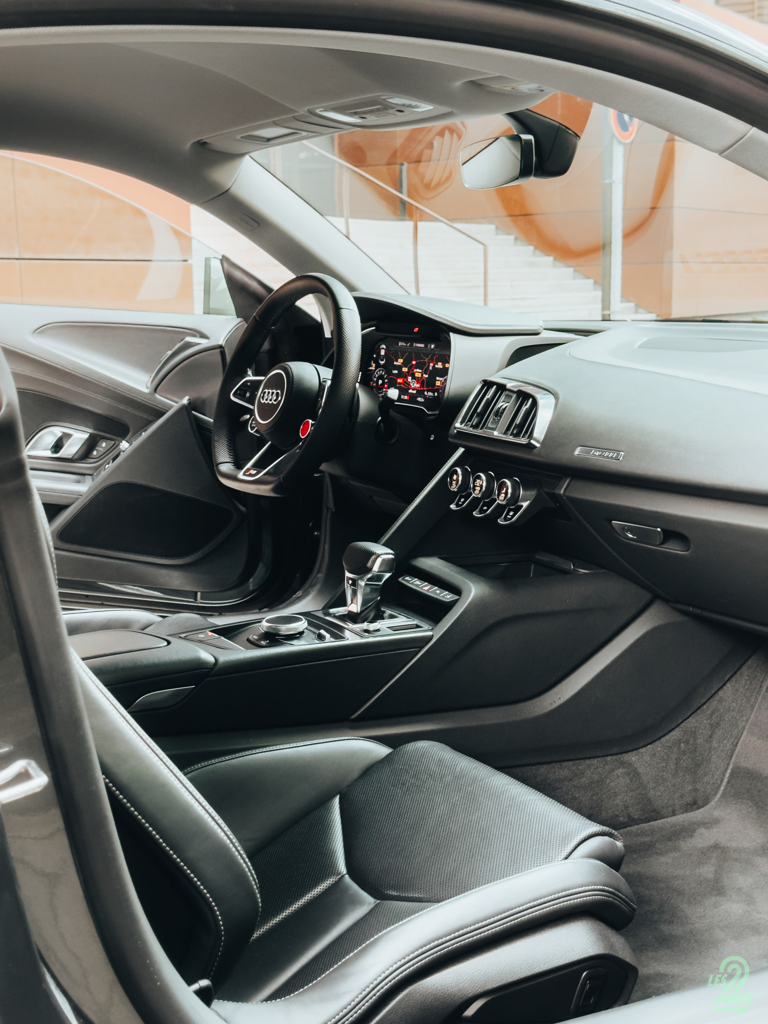 J’ouvre la portière, je glisse dans les baquets pour prendre place dans le cockpit de l’Audi R8. On découvre un intérieur très épuré notamment par l’adoption du virtual cockpit et son écran de 12,3 pouces, la planche de bord est devenue plus qualitative et sa finition est désormais au même niveau d’excellence que les modèles haut de gamme de la marque avec l’option cuir étendu. On en retrouve donc également le dessus du tableau de bord, les accoudoirs, le cache d’airbag sur le volant et la partie inférieure de la console centrale. Les seuls plastiques qui subsistent sont par ailleurs de qualité toute germanique. Alors comme souvent chez Audi, les intérieurs sont assez austères, mais l’ergonomie est impeccable. En termes d’options, elle est moins équipée que sa version Quattro pour ne conserver que l’essentiel. Dans l’habitacle, seule une plaque « 1 of 999 » face au passager vient rappeler que l’on n’est pas assis dans n’importe quelle R8. Pour le côté pratique, Audi n’a pas oublié d’installer plusieurs petits espaces de rangement, cependant, ça reste uniquement pratique sans pour autant apporter beaucoup de polyvalence.
