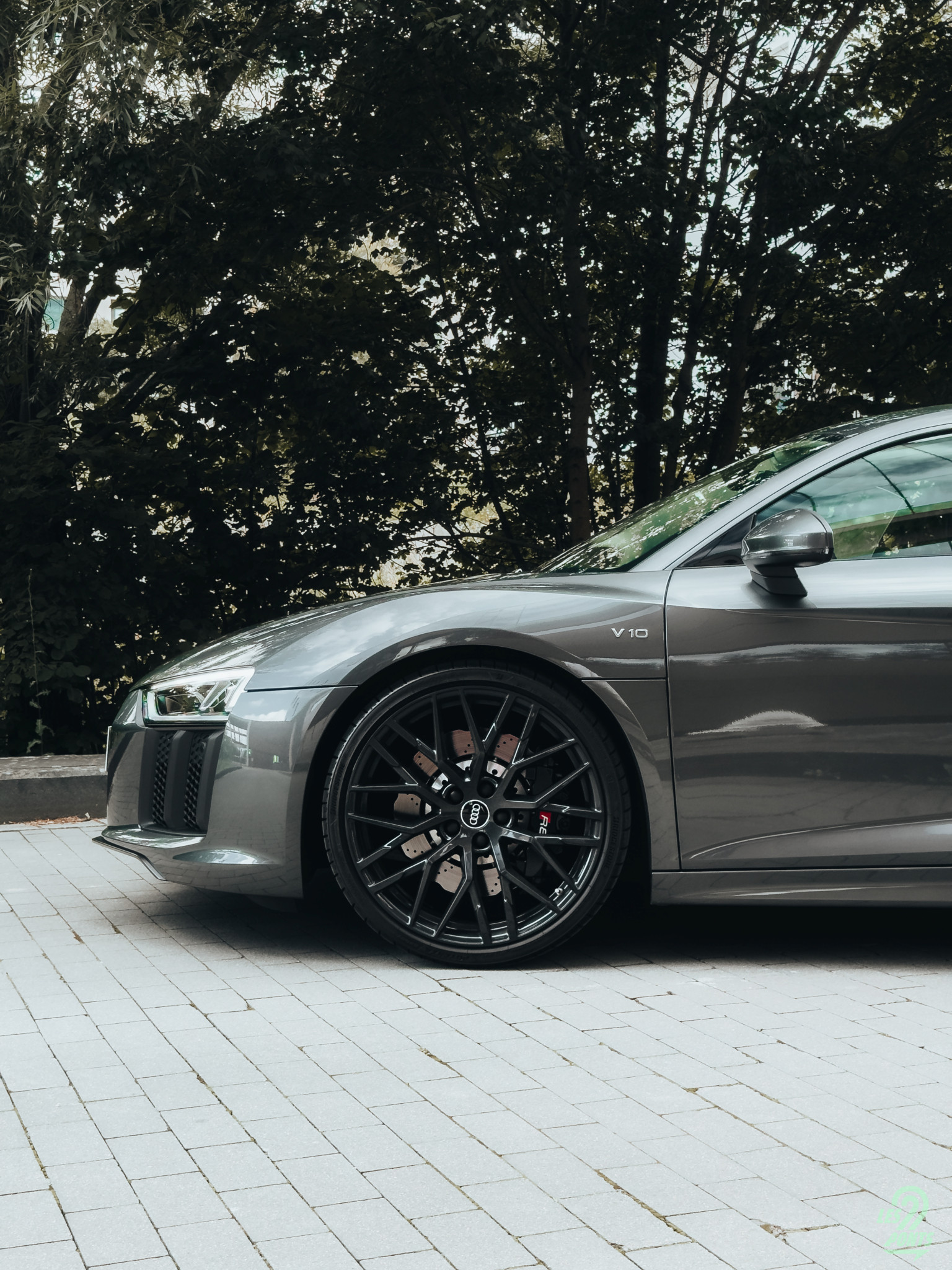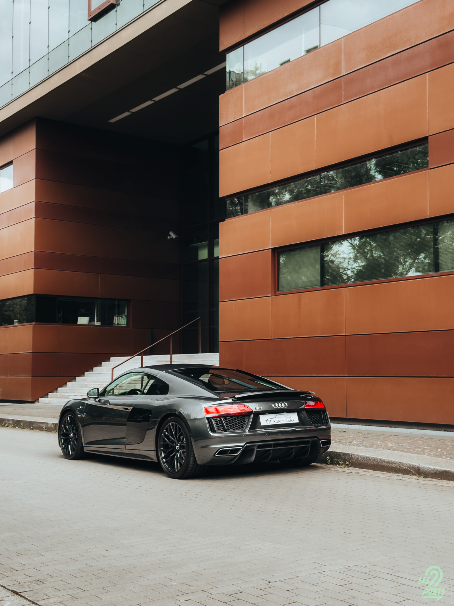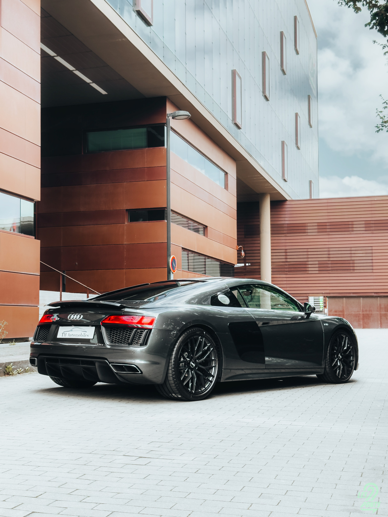 Cette version de l’Audi R8 perd 50 kilos sur la balance et un arbre de transmission. En réalité, les ingénieurs d’Audi Sport ne se sont pas contentés de faire l’ablation de la transmission intégrale : ils ont également modifié l’angle de carrossage arrière, ajuster la raideur de la barre antiroulis avant, revu le tarage des amortisseurs, afin d’adapter le châssis à la nouvelle répartition des masses et enfin, pour rendre l’ensemble plus docile, l’assistance de direction a été recalibrée, tandis que les lois de l’ESP ont été adaptées. Maintenant, faisons le tour de notre belle allemande.