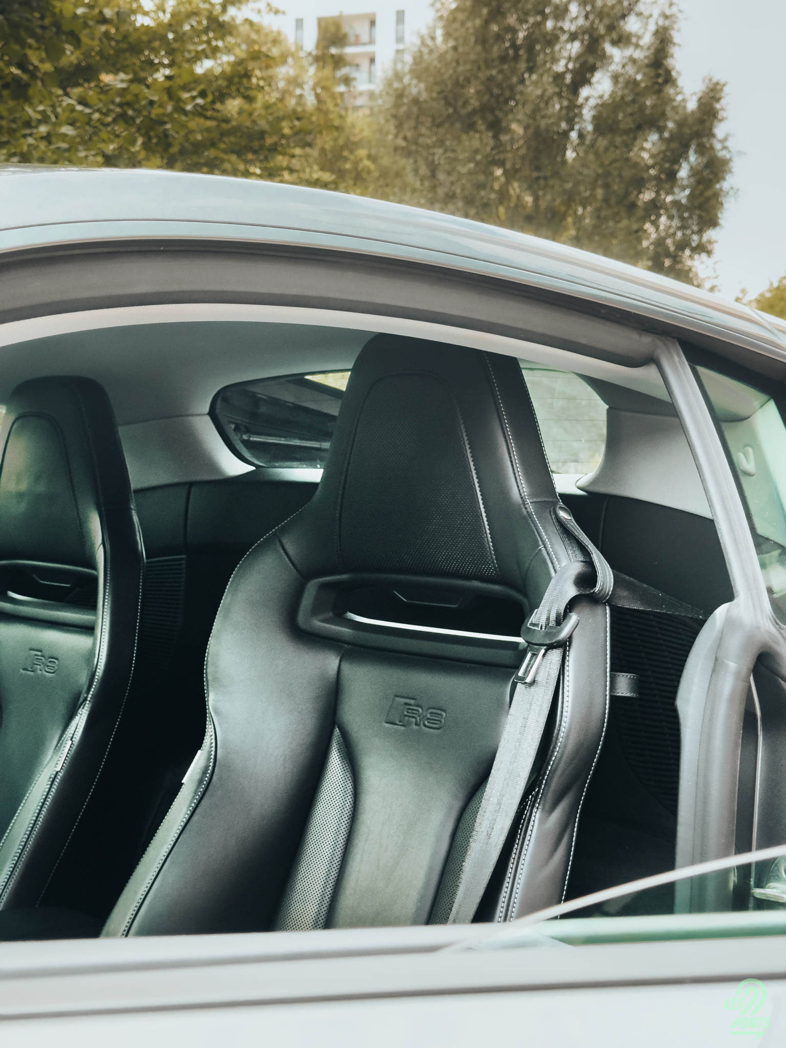 La première chose qui saute aux yeux en faisant le tour de la voiture, c’est le diamètre des deux énormes sorties d’échappement. On reconnait bien le dessin original de la R8, qui a subtilement évolué pour accueillir le style en vigueur de la marque tout en conservant son avant ramassé et plongeant, au porte-à-faux prononcé, alors que l’arrière, plus trapu, accueille ses roues presque à son extrémité. Comment différencier esthétiquement une R8 Quattro d’une RWS ? Déjà, nous avons le logo Audi Sport qui vient remplacer le « Quattro » sur la calandre, les sideblades noirs, les jantes de 19 pouces noires et de manière optionnelle, une bande rouge partant de la calandre jusqu’aux feux arrière.