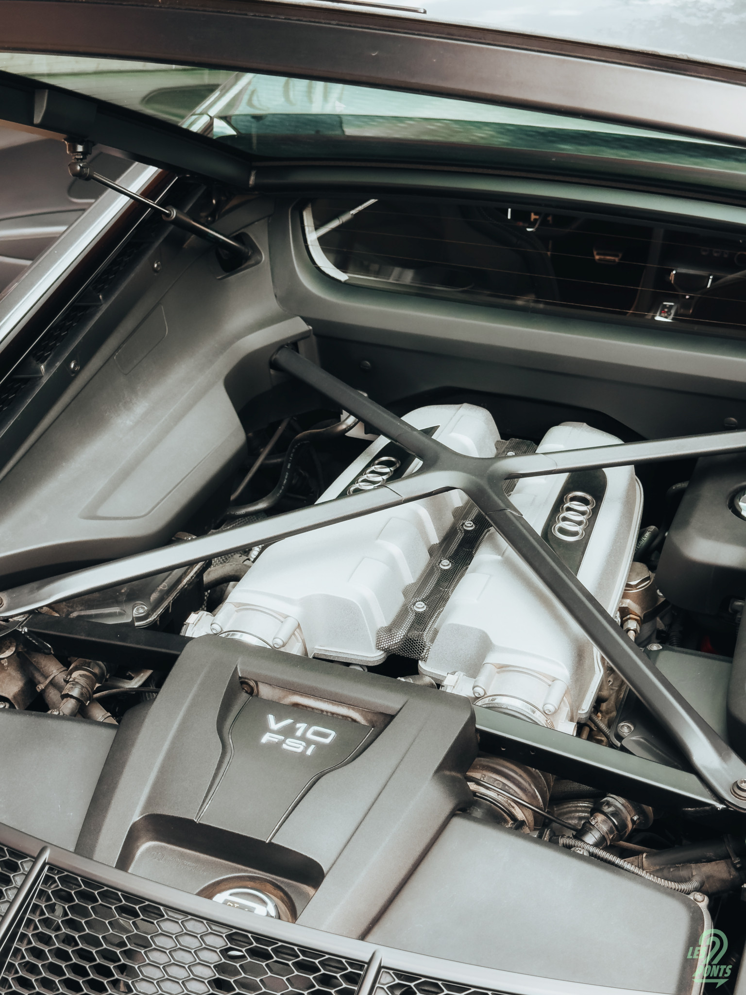 Lors de notre arrêt photo, dans une zone d’activités de Saint-Jacques-de-la-Lande, on en profite pour faire une petite pause et découvrir le moteur de la belle allemande. Pour ouvrir le petit capot vitré, il faut appuyer sur un bouton qui actionnera électriquement l’ouverture de celui-ci. On a beau bien connaître ce fameux V10, on est toujours impressionné par son timbre de voix. Il s’agit ici de la version classique avec une cylindrée de 5.2L, qui affiche déjà 540 chevaux pour 540 nm de couple. Le V10 ne ménage pourtant pas ses efforts, avec une double injection directe et indirecte, la désactivation d’un banc de cylindres à faible charge, un mode « roue libre » et bien sûr un start/stop. Une mécanique d’anthologie, hélas en voie de disparition, alors autant en profiter tant qu’il est là, et savourer son caractère exubérant.