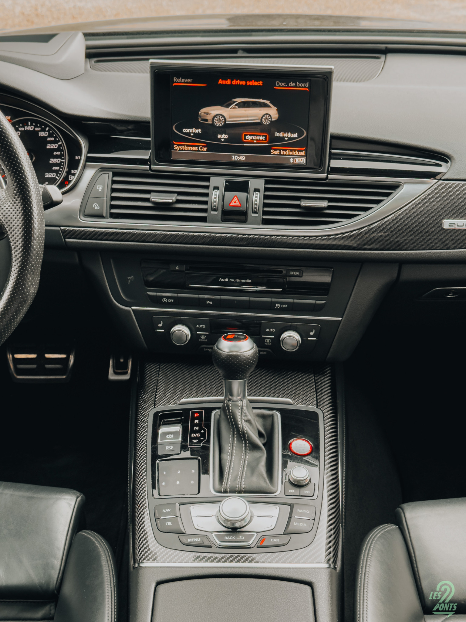 Les premières courbes révèlent l’incroyable équilibre de la voiture. Le différentiel central piloté, combiné au Quattro, gomme totalement le survirage que l’on pouvait craindre. La direction est précise, communicative, et la RS6 répond à chaque micro-correction avec un naturel surprenant pour un engin de deux tonnes. Petit point noir, le réglage Dynamic rend la RS6 sautillante sur un bitume dégradé, un véritable shaker. La suspension contrôle la caisse en réduisant un maximum le roulis. C’est un break, mais ça se conduit comme une sportive. La boîte, en mode automatique, gère les changements de rapports avec fluidité, mais en manuel, elle est parfaitement synchronisée avec le rythme du moteur.