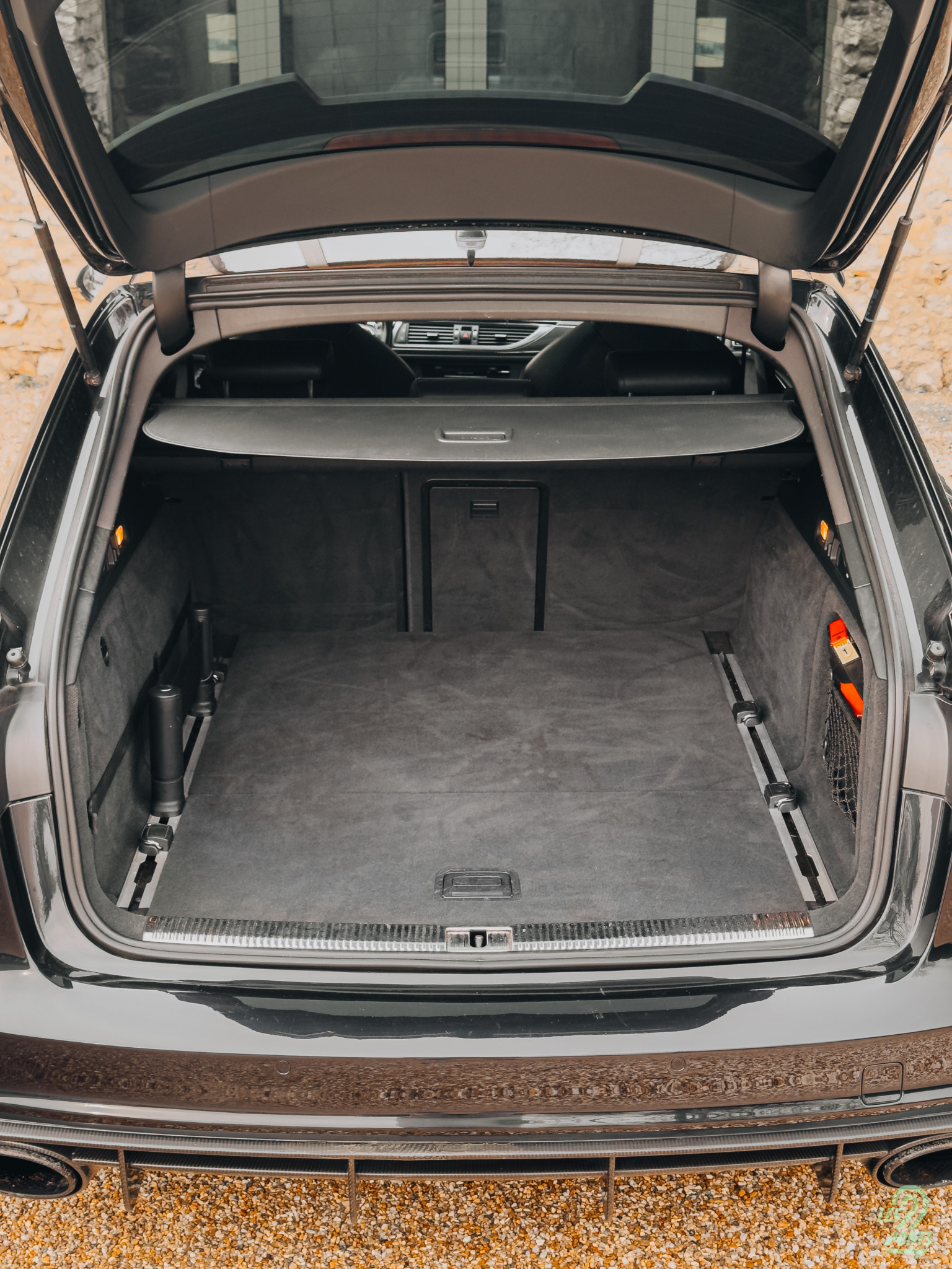 Une fois à l’arrière, la RS6 dévoile une autre facette de son caractère. Le bouclier spécifique intègre un diffuseur imposant, encadrant les deux énormes sorties d’échappement ovales, signature visuelle incontournable du modèle. Elles ne cherchent pas à se cacher, bien au contraire. Les feux arrière LED étirent la largeur. Je termine mon tour en ouvrant le hayon. Et là, le paradoxe RS6 prend tout son sens : malgré son allure de supercar sous stéroïdes, elle reste un break, un vrai. Le coffre offre un volume généreux de 434 litres prêt à accueillir bagages, matériel ou vie quotidienne, sans jamais renier son statut d’icône sportive. La capacité maximale est de 1680 litres !