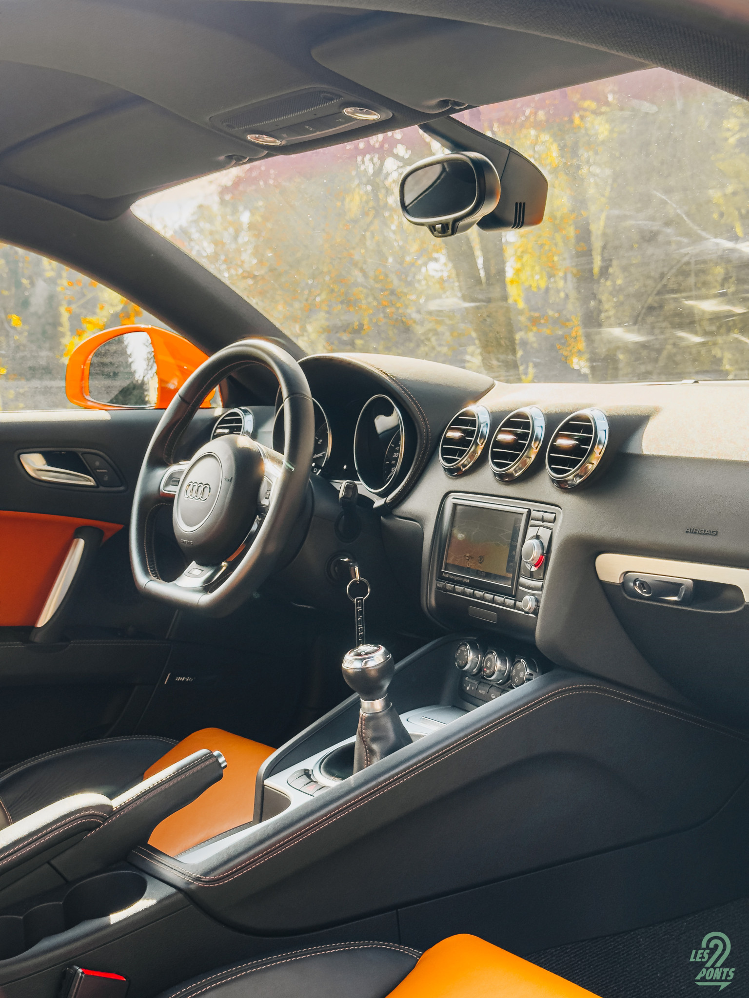 La première sensation qui m’envahit, c’est cette impression d’être dans une voiture faite pour moi. L’assise est confortable, bien creusée en maintenant parfaitement le corps. Posé derrière le volant, la position de conduite est quasi parfaite : assez basse pour se sentir intégré dans la voiture, mais suffisamment haute pour voir le capot et toujours avoir le gabarit en vue. Face à moi, le volant à méplat gainé de cuir est frappé du logo TTS en bas. Il est fin et la prise en main est agréable. Le combiné d’instruments fait dans l’efficacité avec deux gros cadrans pour le régime et la vitesse et entre les deux, un petit ordinateur de bord avec des informations supplémentaires comme l’autonomie restante, la température extérieure, ou le média en cours de lecture. Au-dessus du petit écran, deux petites jauges pour la température d’eau et le niveau de carburant. Mention spéciale pour le petit logo TTS placé dans le cadran de gauche, un clin d’œil subtil à la version que j’ai entre les mains.