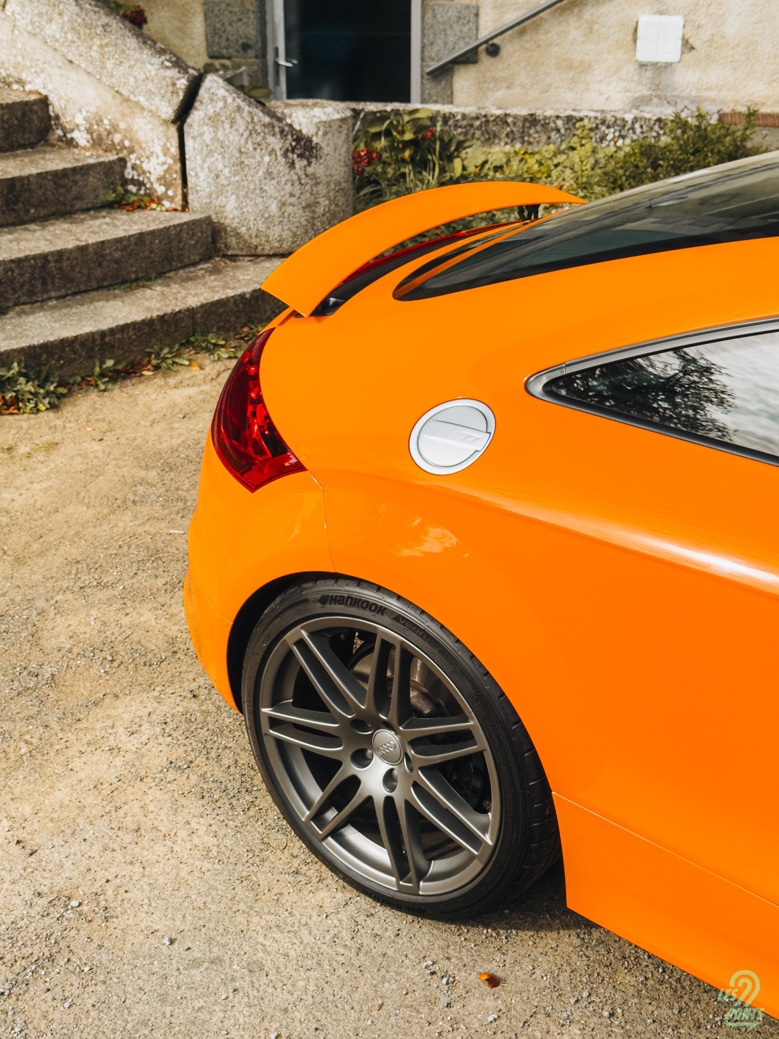 De profil, le coupé se révèle sous son vrai jour : la ligne ramassée et trapue qui a fait le succès du premier TT est identifiable instantanément. Les traits se sont toutefois un peu tendus pour rendre la ligne plus dynamique et désirable. En scrutant les détails, je remarque que la trappe à carburant arbore une couleur chrome, une signature distinctive de cette version, comme les rétroviseurs habituellement, bien qu’il soit possible de les opter en couleur carrosserie comme ici. Ces derniers intègrent des répétiteurs de clignotants fins et élégants. Les arches de roues sont généreusement sculptées, soulignant la musculature de la voiture. Les jantes optionnelles à 7 doubles branches de 19 pouces en alliage remplissent bien ces dernières. Le contraste entre le gris anthracite des jantes et le orange de la carrosserie est vraiment saisissant. On distingue le système de freinage qui est composé de disques ventilés de 340 mm à l’avant et 310 mm à l’arrière, l’ensemble est pincé par des étriers mono piston.