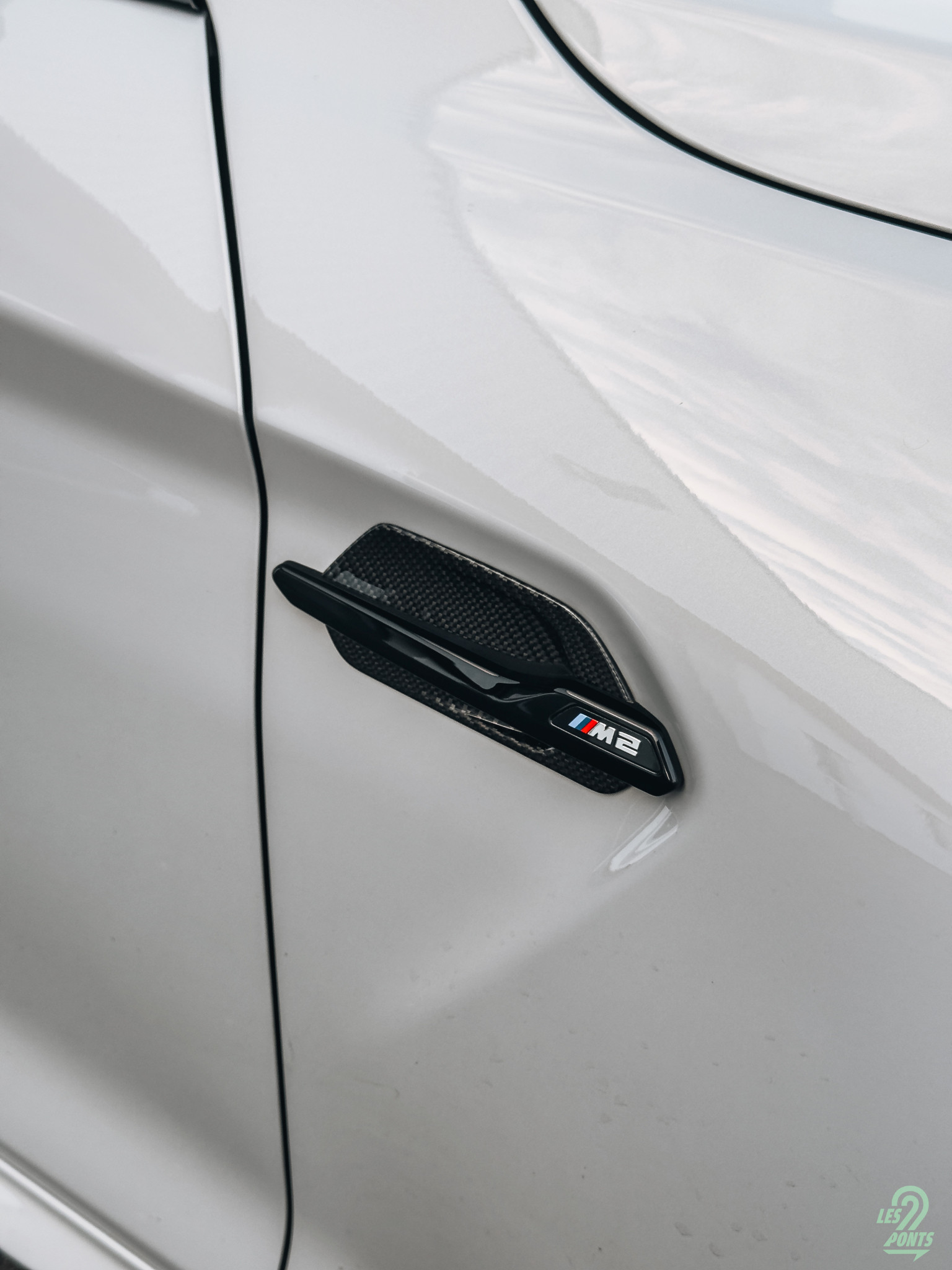 Les optiques acérées et les angels eyes confèrent à la M2 un regard menaçant. Le nez reste sobre, sans chercher à en faire trop, mais l’intention est claire. L’insigne BMW trône fièrement au-dessus des doubles haricots en carbone, plus anguleux et reliés par leur partie centrale, un subtil clin d’œil aux BMW d’antan, celles au caractère affirmé. Le logo M2 trouve sa place sur le côté droit de la calandre. Quant au bouclier, agressif et largement ajouré, il assure un refroidissement optimal de la mécanique et des freins, tandis qu’une petite lame en carbone vient parfaire l’ensemble sur la partie inférieure.