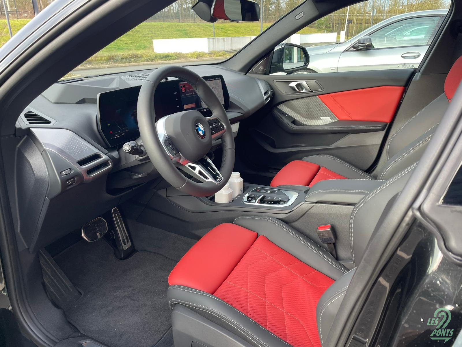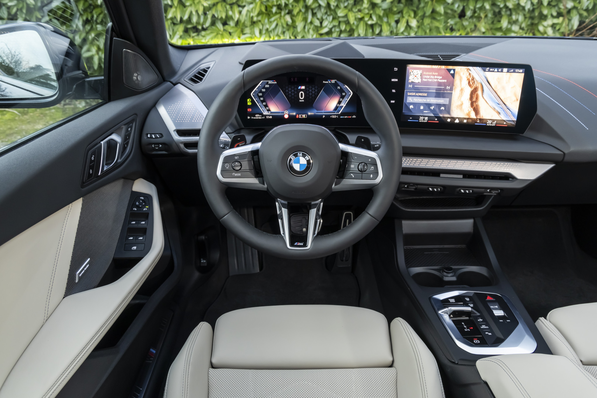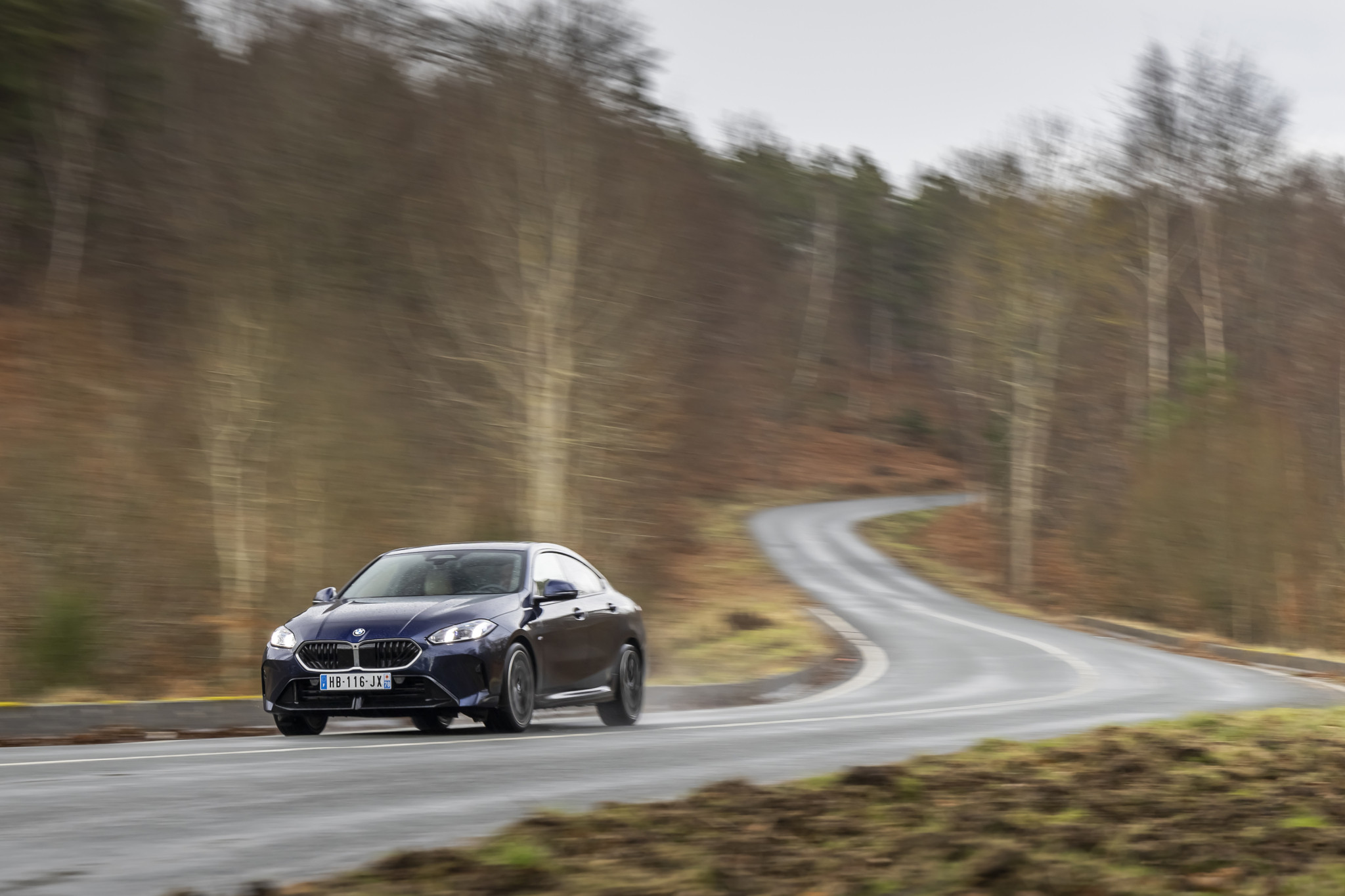 Si le 3 cylindres 1.5 s’ébroue dans un grondement peu mélodieux, une fois lancé, le bruit du moteur se fait vite oublier. En mode Efficient, la micro-hybridation nous invite à ne pas trop solliciter la pédale de frein. Et très vite, on se prend au jeu de cette conduite apaisée. Les suspensions, dotées avec la finition M Sport d’amortisseurs fréquentiels à compression variable, absorbent parfaitement les aspérités du bitume. Seule ombre au tableau : au-delà de 100 km/h, les bruits d’air nous ont semblé un peu plus présents que sur la cousine Série 1. Peut-être une conséquence de la présence du toit ouvrant qui, même fermé, peut nuire au confort acoustique.
