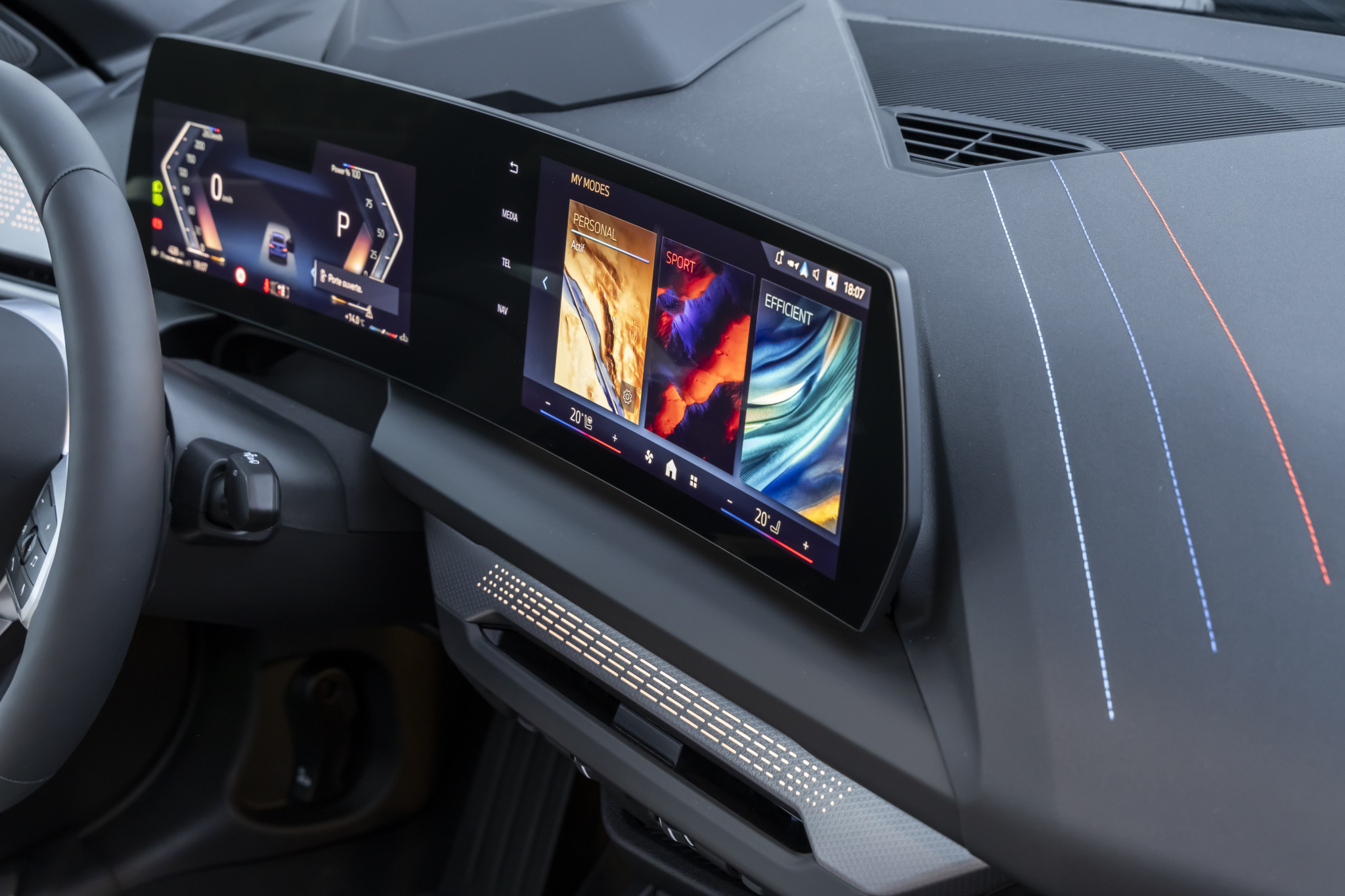 À l’intérieur, le principal changement réside dans l’adoption d’un long écran incurvé, rassemblant sur sa moitié gauche les compteurs et sur sa moitié droite, l’interface tactile d’infodivertissement.