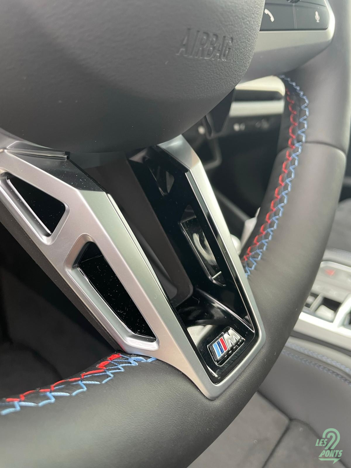 Concernant les finitions, BMW a voulu « simplifier » son catalogue (spoiler : vous aurez le temps de finir votre café avant qu’on en ait fait le tour). Pour faire « simple » donc : les amateurs de look sportif opteront pour la finition M Sport Design (+ 1 300 €) qui reprend les éléments extérieurs de la finition M Sport (facturée 3 450 €) mais pas les éléments intérieurs, à savoir un sublime volant M équipé de palettes, des sièges sport où l’alcantara se mêle à une sellerie « Veganza », un ciel de pavillon anthracite, des surpiqûres aux couleurs M, etc. etc. Notons également que la finition M Sport comprend des suspensions Adaptive M, absentes sur la M Sport Design.