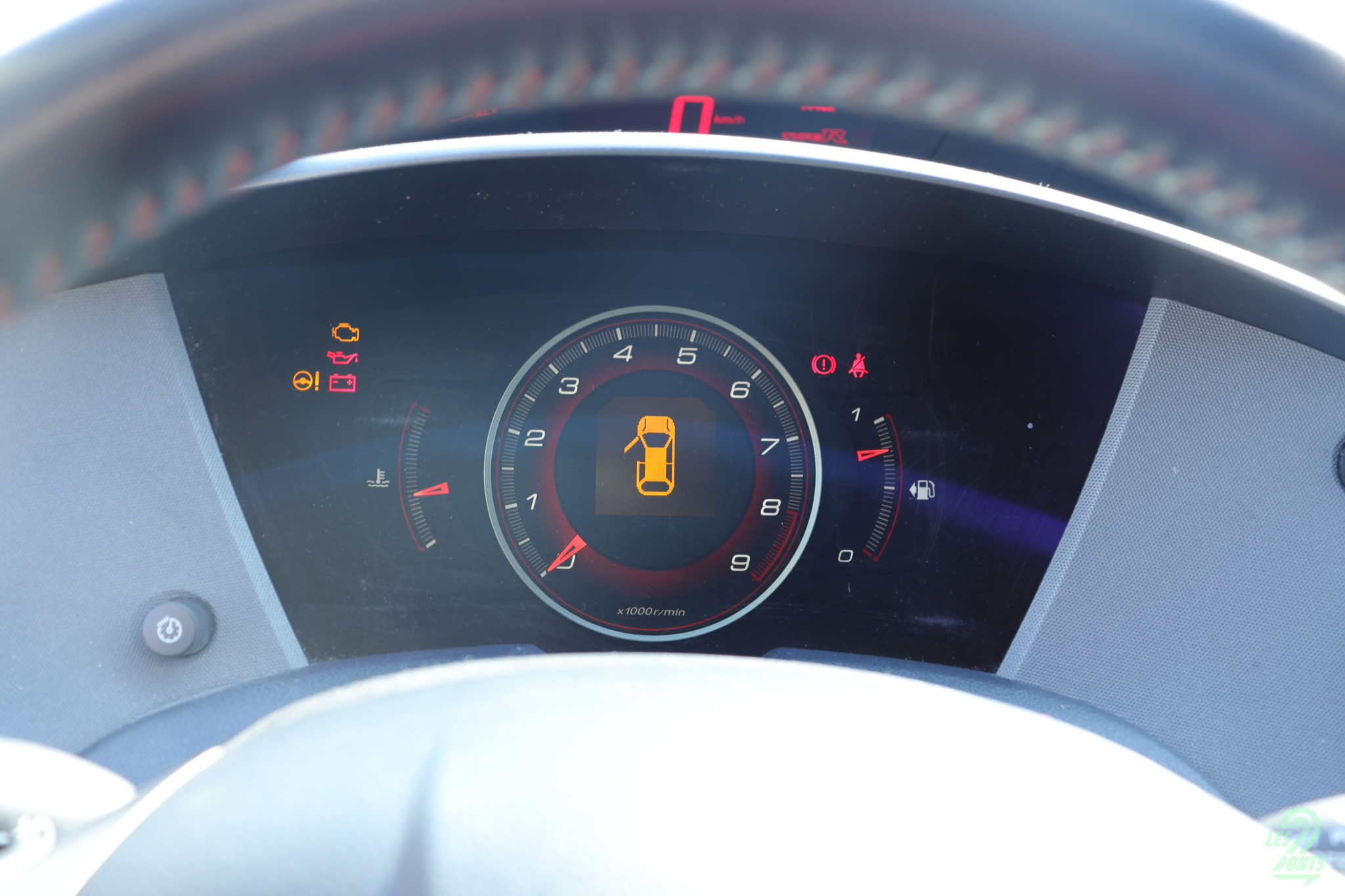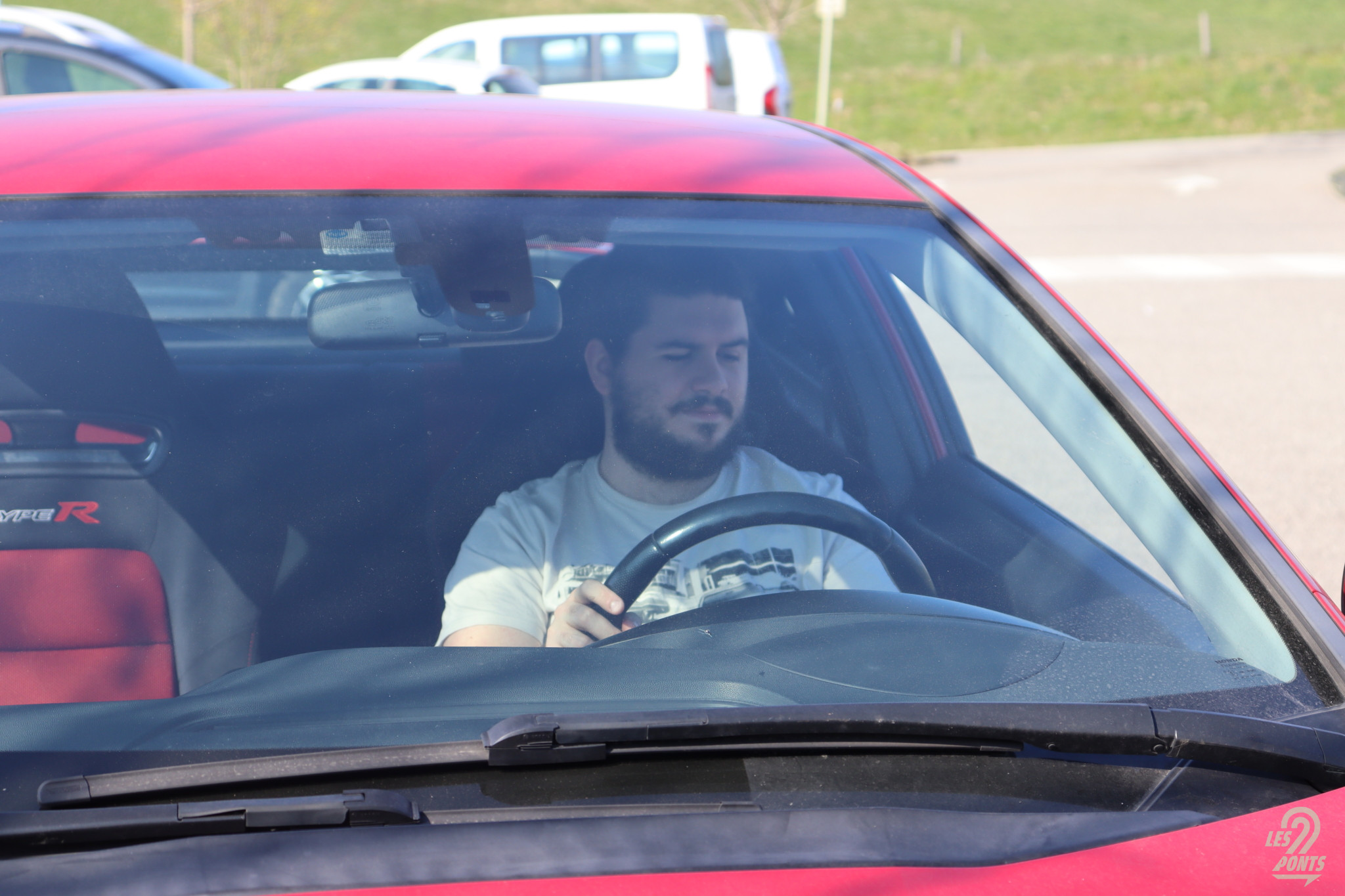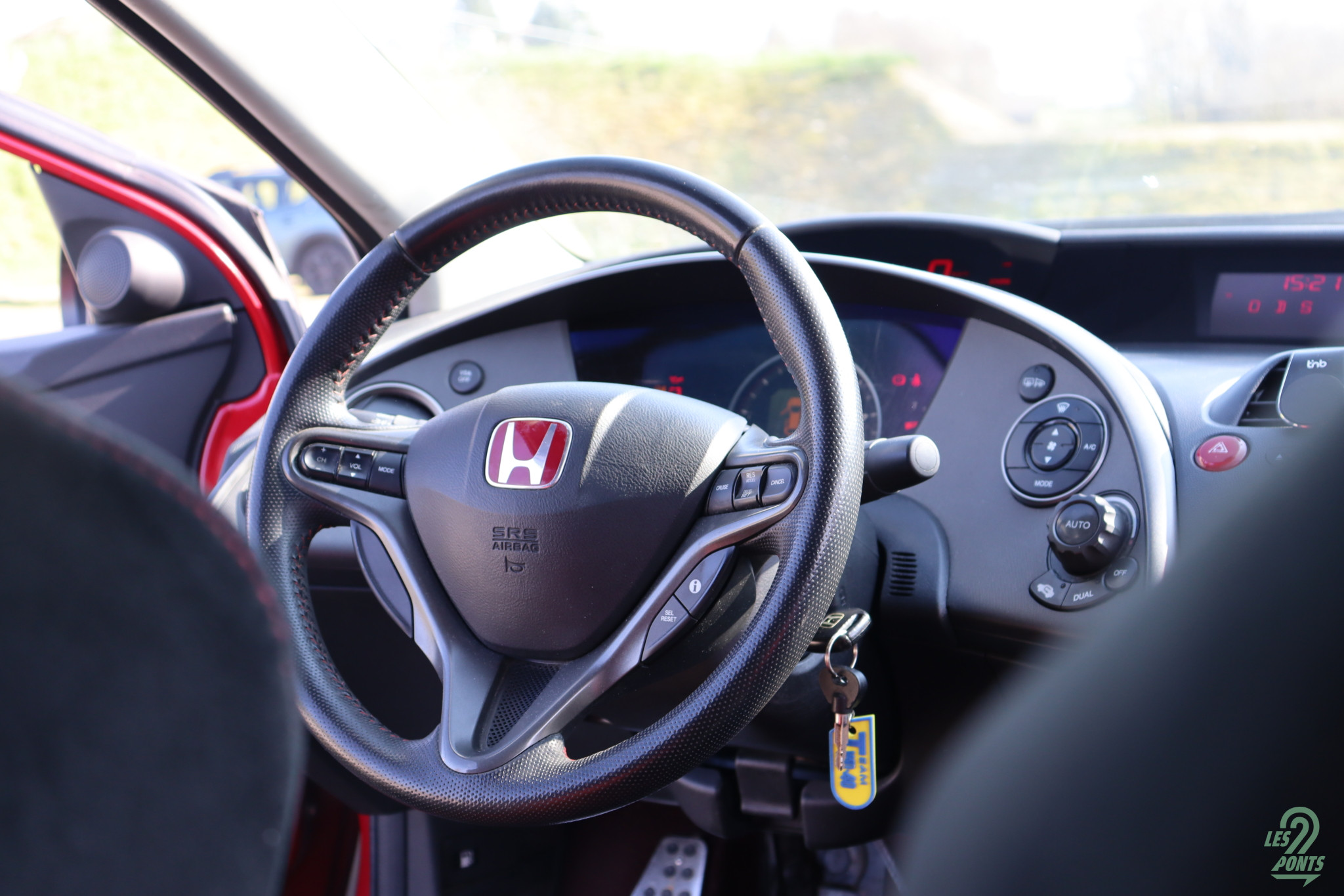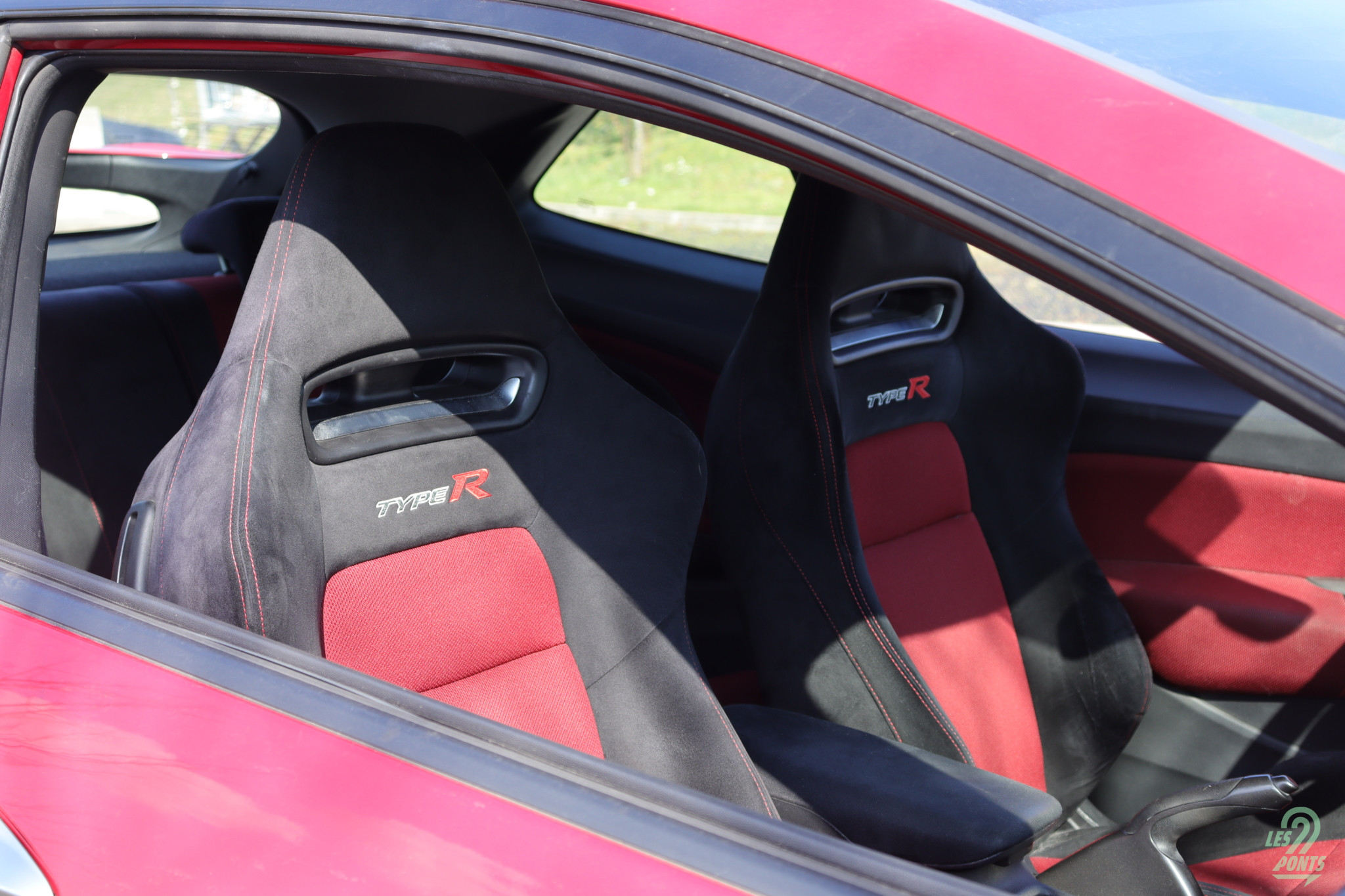 Lorsque l’on s’installe à bord de la Civic FN2, beaucoup de choses sautent aux yeux au premier abord. Le tableau de bord est résolument futuriste, avec une forme générale rappelant presque un vaisseau spatial et des instruments de bord tournés vers le conducteur. Les sièges baquets siglés Type-R, en alcantara et tissu rouge, enveloppent parfaitement les occupants. Ayant une carrure un peu plus large que la moyenne, j’arrive à m’installer confortablement à bord, bien que je doive pencher la tête pour éviter de me cogner contre le toit. La voiture est en effet particulièrement rabaissée, mais une fois assis, on a de la place au dessus de la tête grâce à une habitabilité repensée par rapport à la génération précédente.