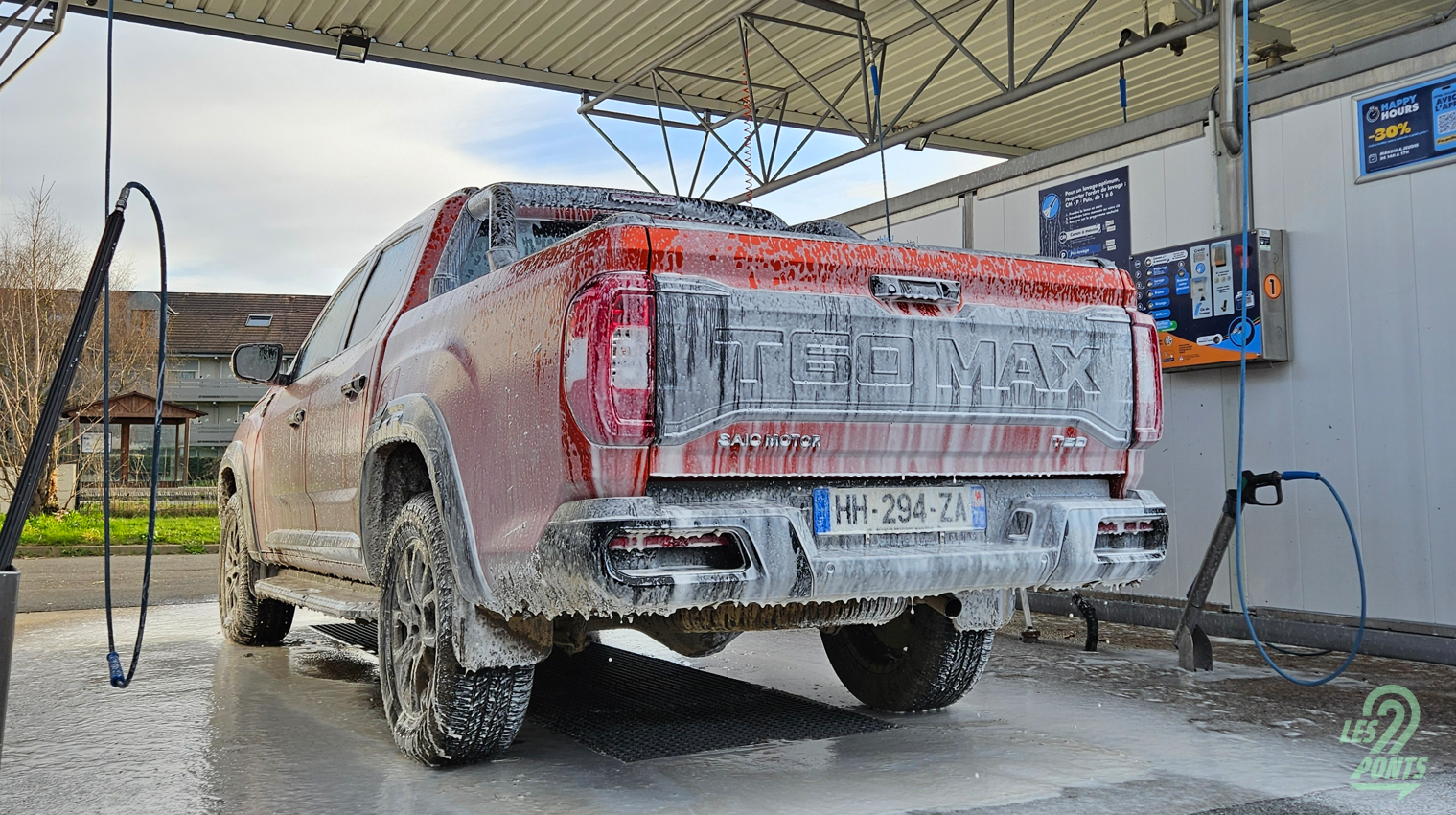 La tablette centrale n’est peut-être pas la plus réactive, mais l’utilisateur concentré sur la route n’y verra pas un problème. Les touches et autres boutons du volant permettent d’augmenter le son – une action difficile à réaliser pour le passager –, de changer la musique ou encore d’activer le régulateur de vitesse. Le volant est d’ailleurs chauffant, tout comme les sièges avant. Dommage qu’il n’y ait qu’un unique niveau de chauffe, mais il n’est pas difficile de s’en contenter en hiver. Franchement, quand on goûte au volant chauffant, il devient impossible de s’en passer. L’habitacle est tout aussi accueillant du côté de la banquette arrière. Pas de sièges chauffants, mais un bel espace aux jambes pour les deux occupants – le petit siège central n’est pas fonctionnel, ce qui permet au T60 Max de ne pas avoir de malus écologique malgré sa double cabine. Pompon sur la Garonne : leur assise n’est pas si verticale, pour un pick-up.