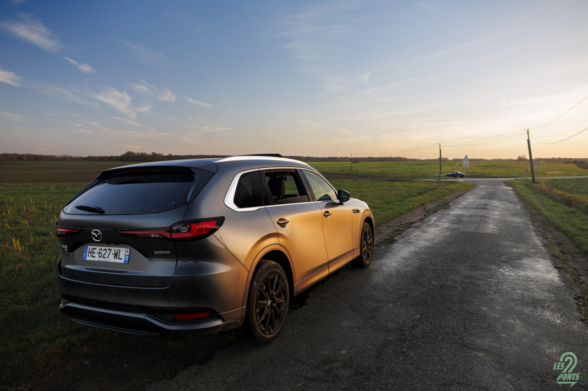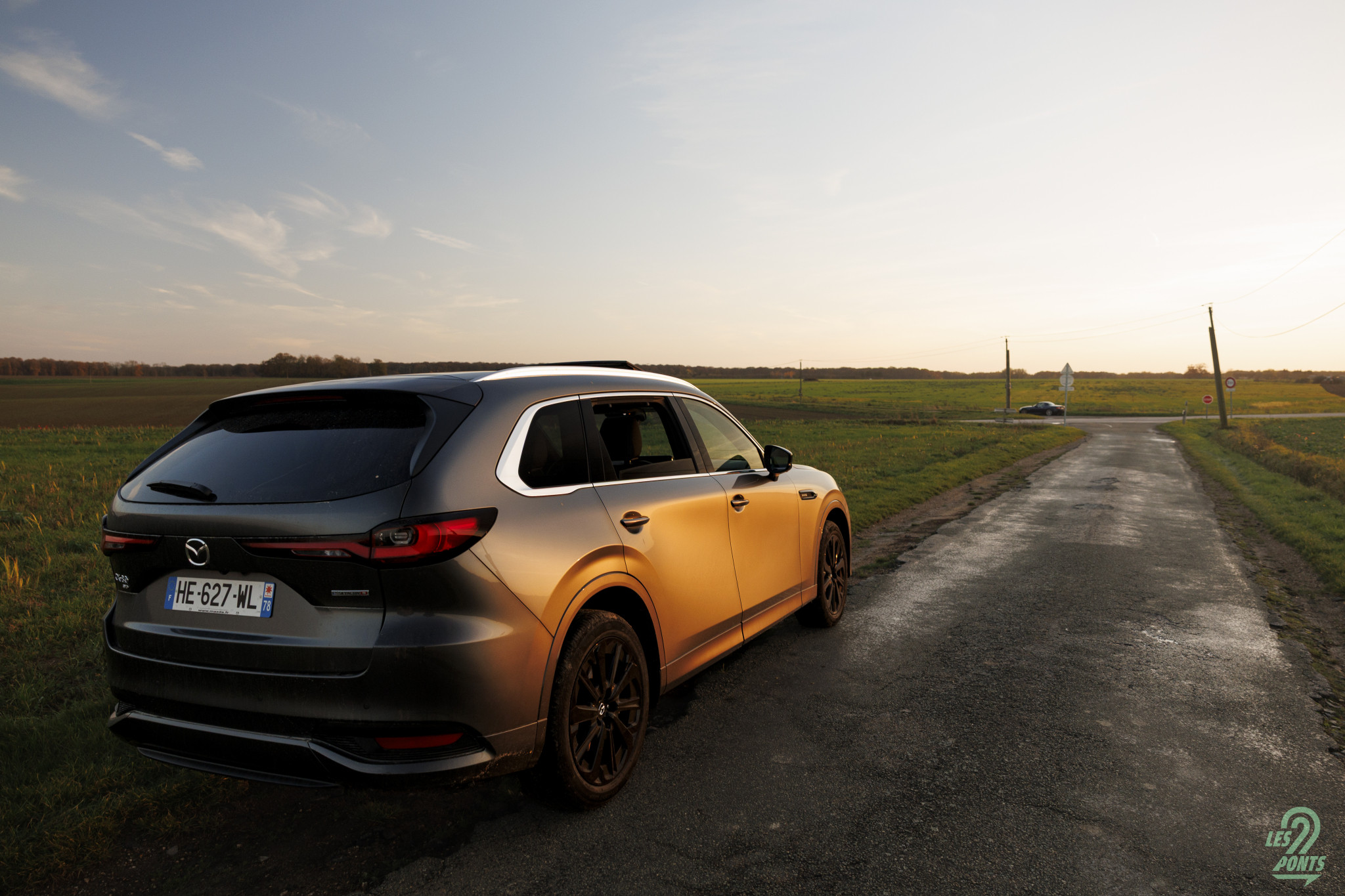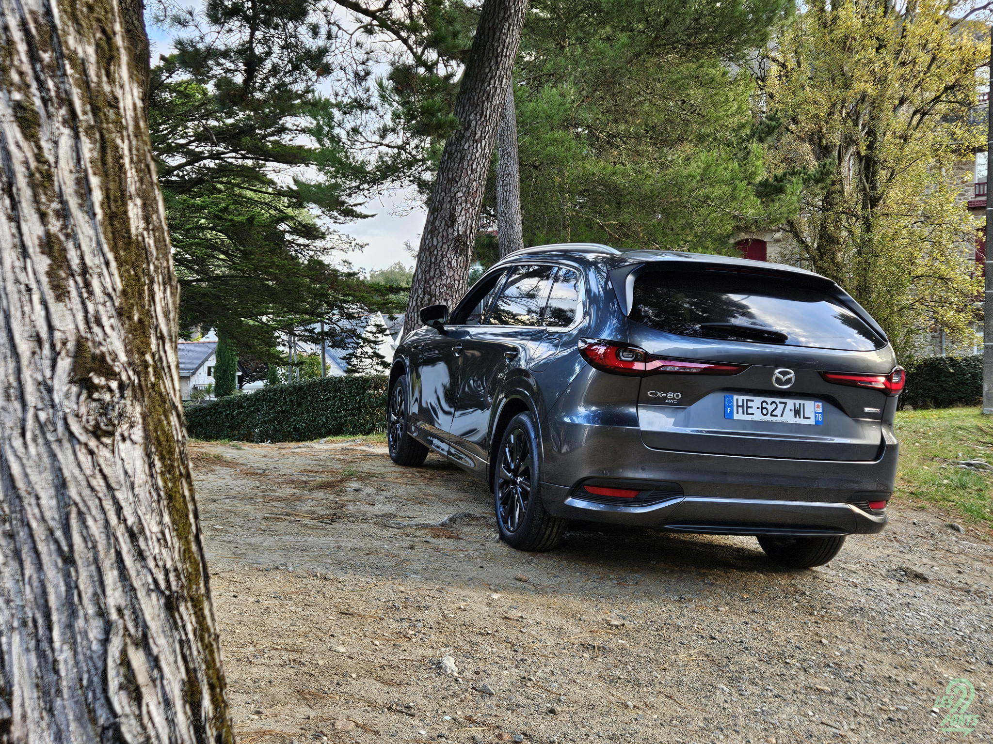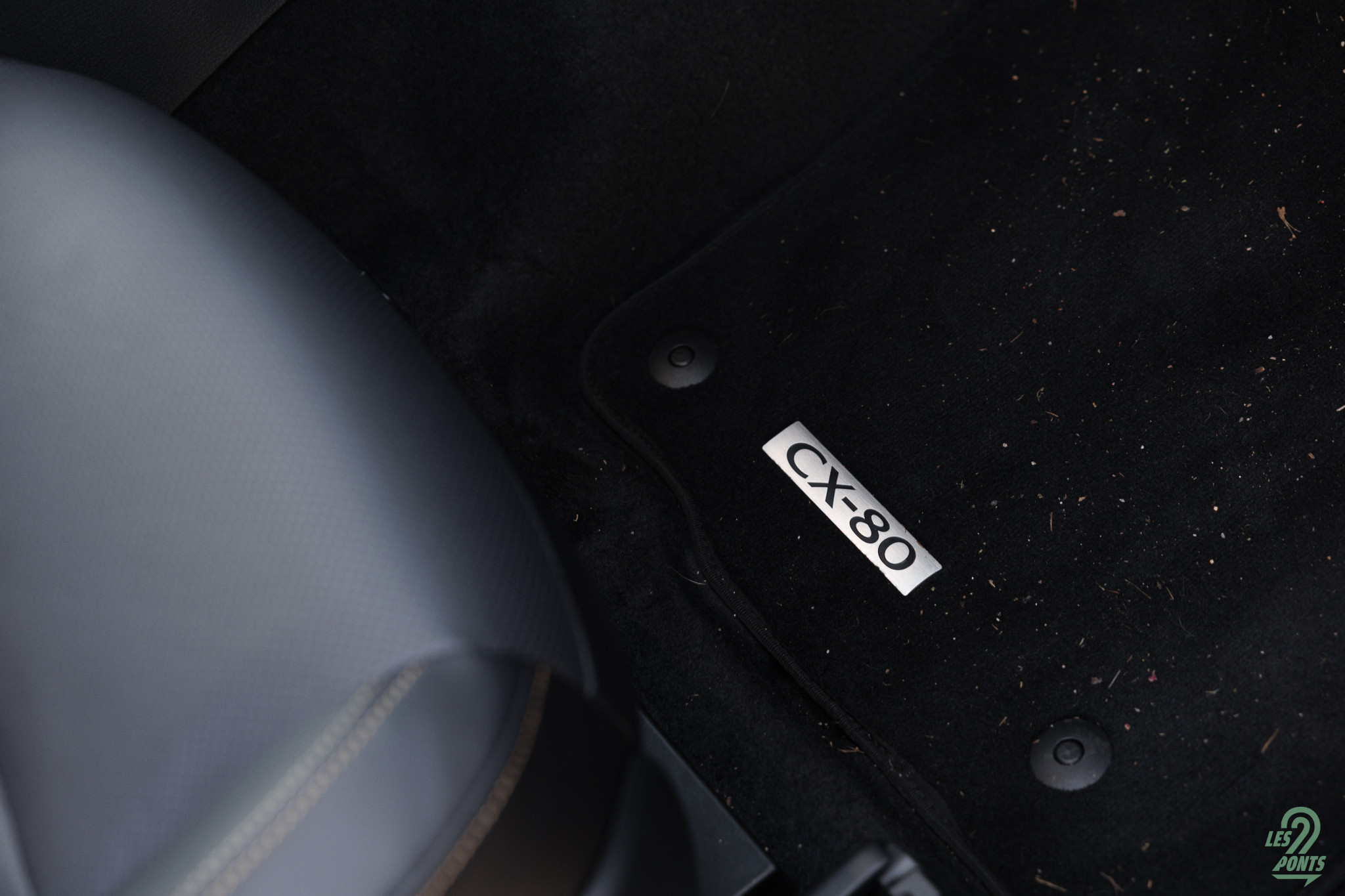Sur routes départementales, le CX-80 peut se laisser tenter par quelques incursions dynamiques dans des courbes assez larges. La sensation de roulis est bien présente mais le SUV affronte les virages sans broncher. Le conducteur trouvera probablement ses limites avant que les lois de la physique ne les lui rappellent. Mode sport activé, conduite adaptée aux circonstances, la consommation tend rapidement vers les 11 l/100 km. Ce n’est évidemment pas l’usage qui lui est attribué, mais il convient d’essayer. Mention spéciale pour les pneus Goodyear EfficientGrip Performance SUV en 235/50 R20, capables de transmettre couple et puissance sans patiner même sur chaussées humides. Il faudra activer le mode Off-Road pour ne pas faire crisser les gommes sur les pentes de terre. Mais là encore, quatre roues motrices ou pas, ce n’est pas l’usage approprié. Le Mazda CX-80 ne pense qu’à la route. Un parfait allié des vacances, avec attelage rétractable et coffre de toit en options.