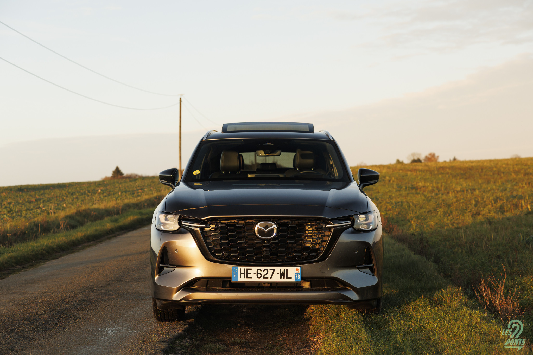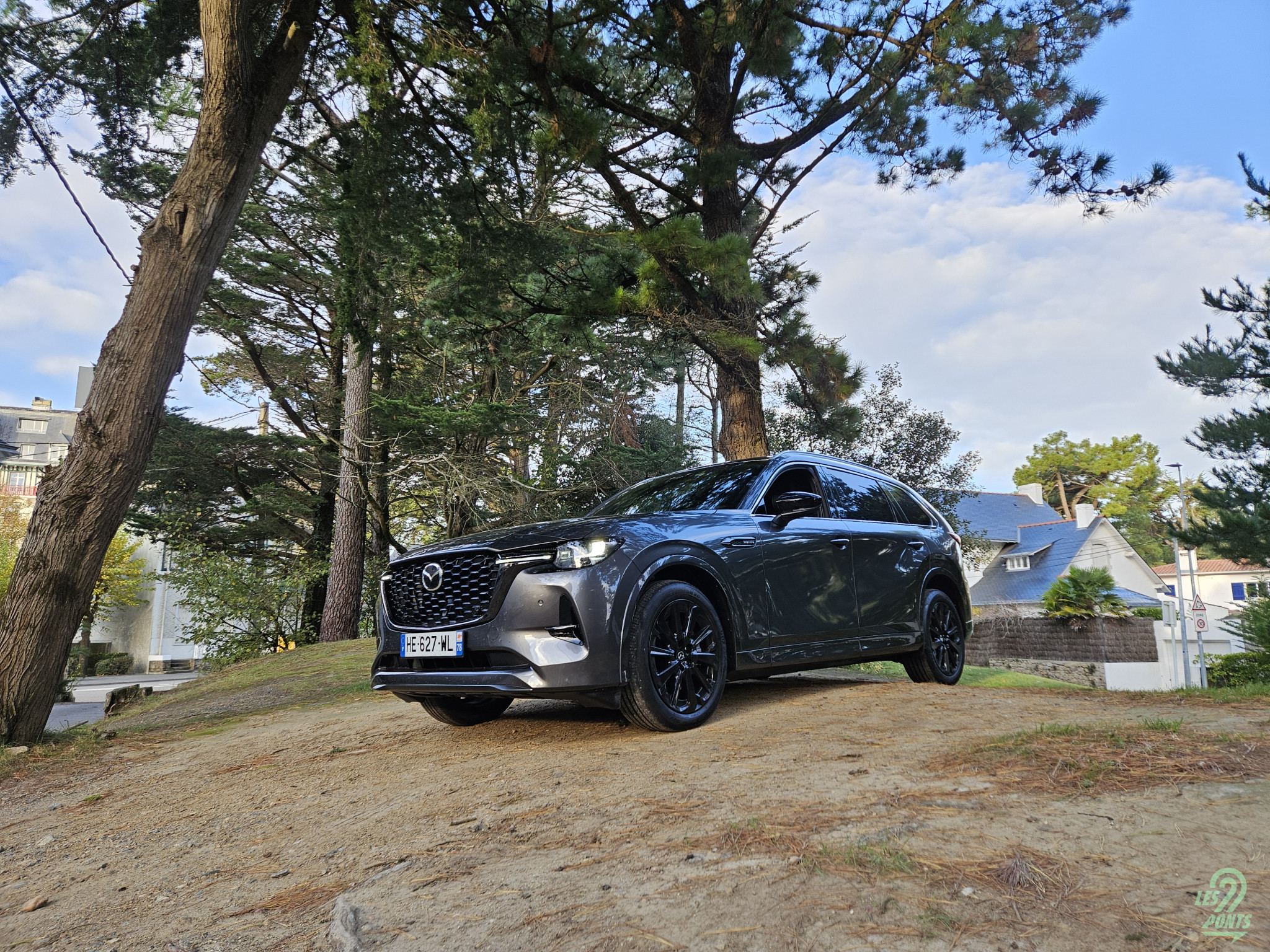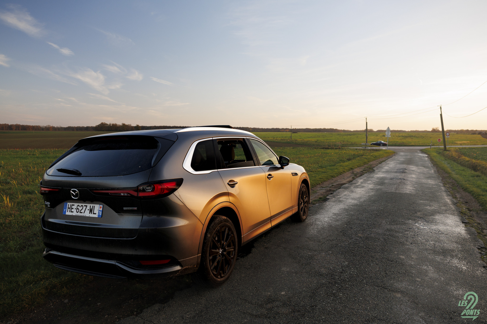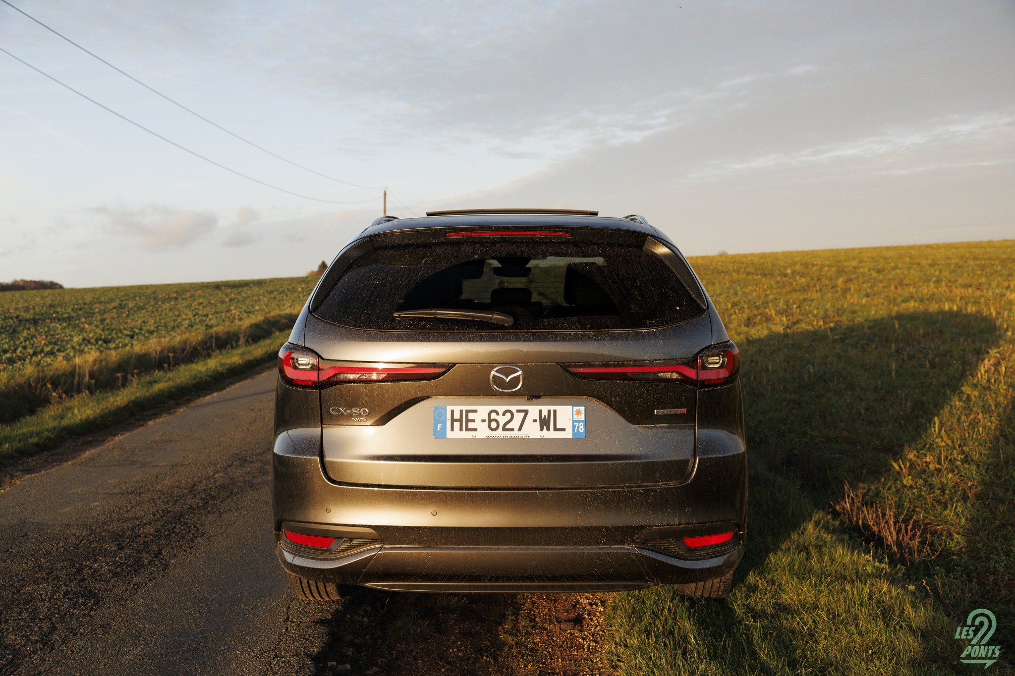 Sur routes départementales, le CX-80 peut se laisser tenter par quelques incursions dynamiques dans des courbes assez larges. La sensation de roulis est bien présente mais le SUV affronte les virages sans broncher. Le conducteur trouvera probablement ses limites avant que les lois de la physique ne les lui rappellent. Mode sport activé, conduite adaptée aux circonstances, la consommation tend rapidement vers les 11 l/100 km. Ce n’est évidemment pas l’usage qui lui est attribué, mais il convient d’essayer. Mention spéciale pour les pneus Goodyear EfficientGrip Performance SUV en 235/50 R20, capables de transmettre couple et puissance sans patiner même sur chaussées humides. Il faudra activer le mode Off-Road pour ne pas faire crisser les gommes sur les pentes de terre. Mais là encore, quatre roues motrices ou pas, ce n’est pas l’usage approprié. Le Mazda CX-80 ne pense qu’à la route. Un parfait allié des vacances, avec attelage rétractable et coffre de toit en options.