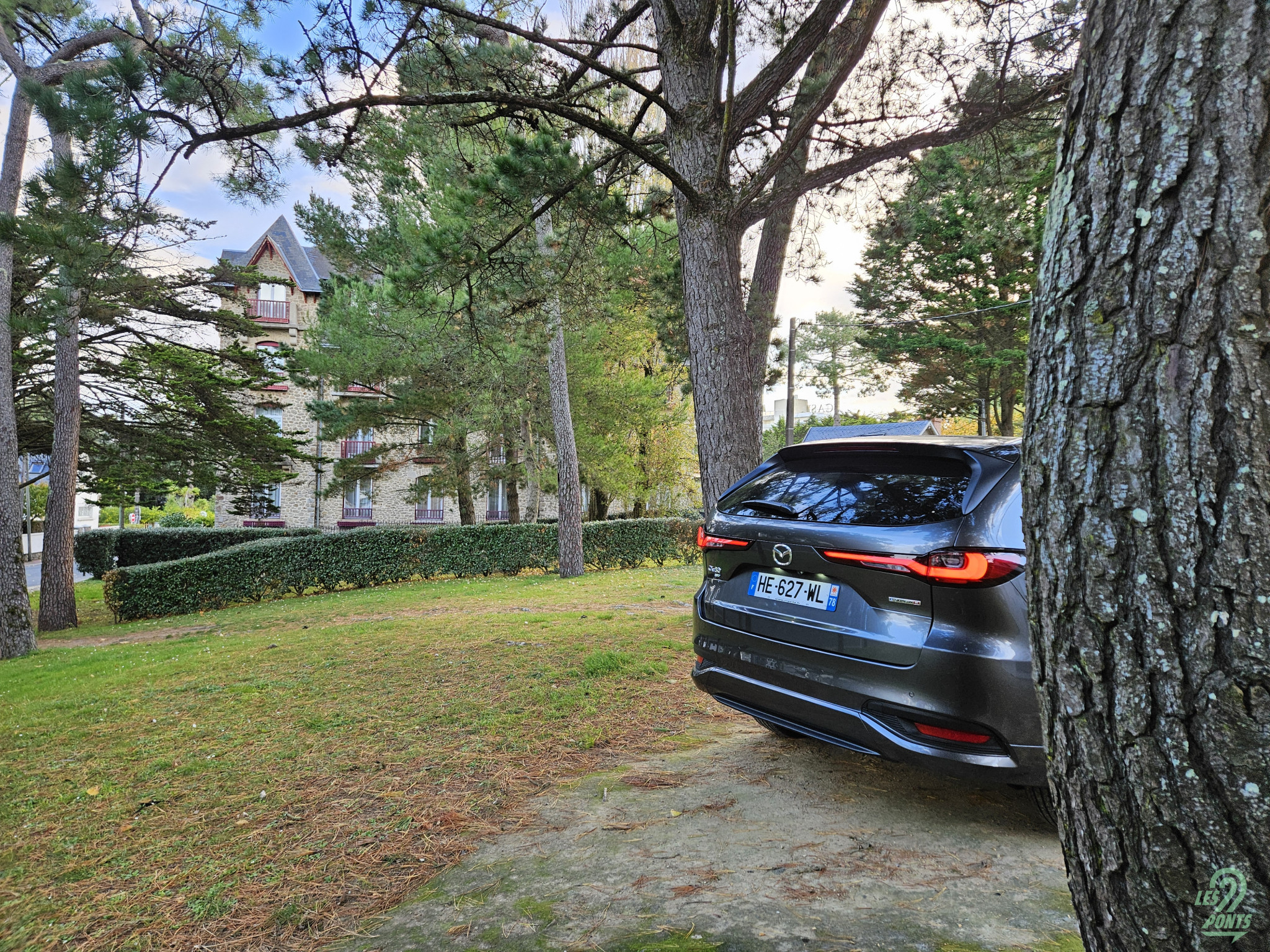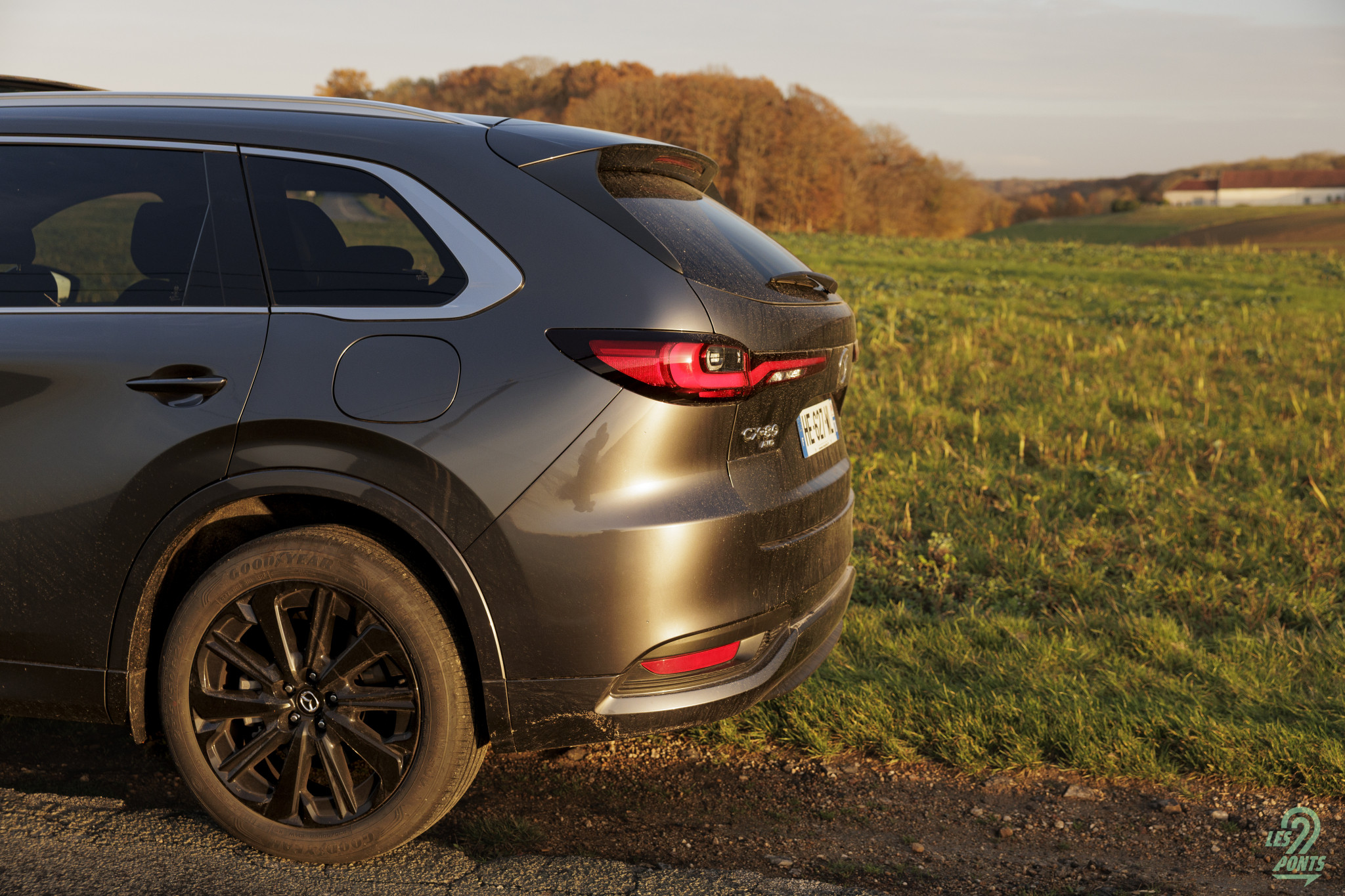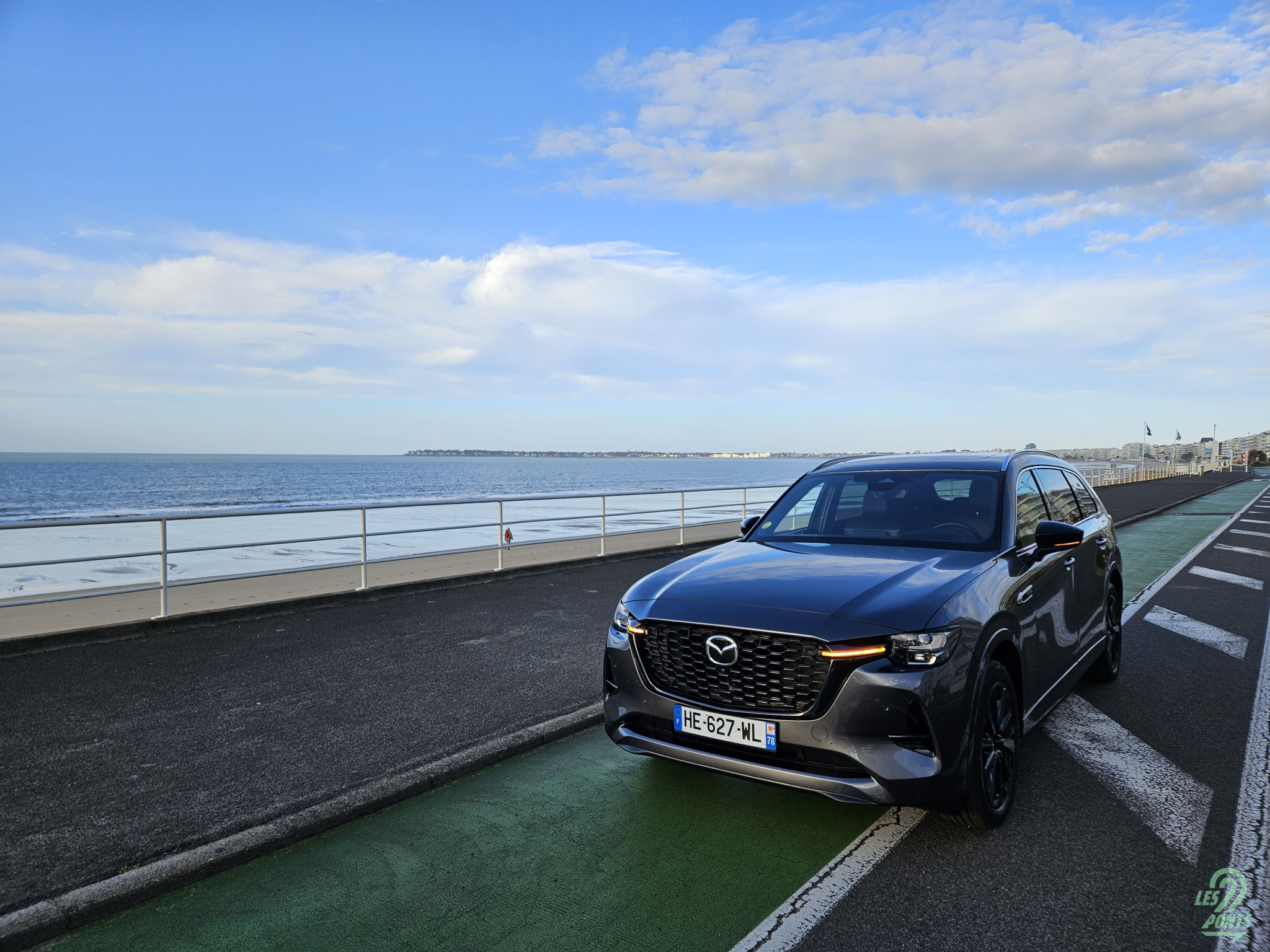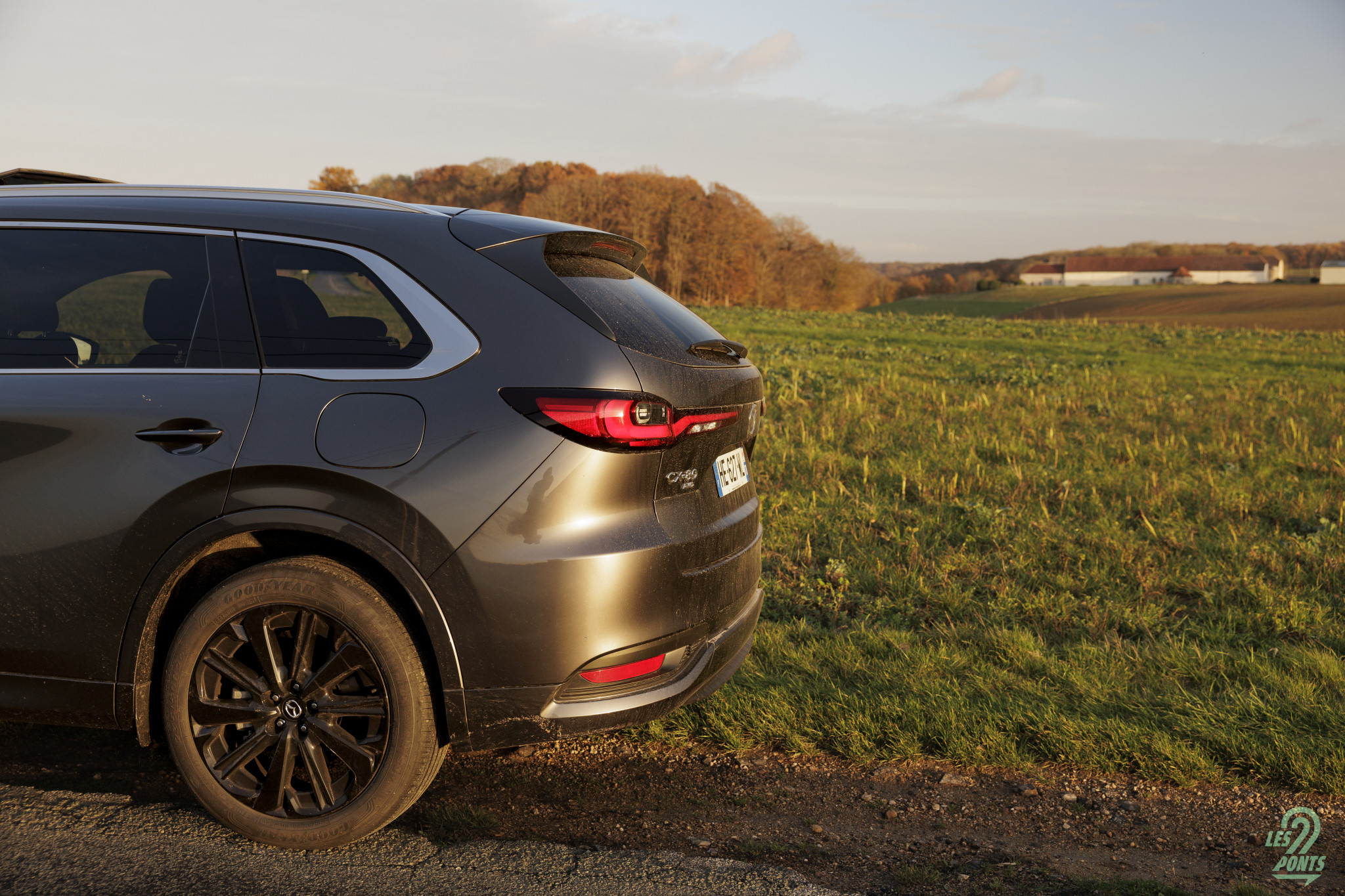 Sur routes départementales, le CX-80 peut se laisser tenter par quelques incursions dynamiques dans des courbes assez larges. La sensation de roulis est bien présente mais le SUV affronte les virages sans broncher. Le conducteur trouvera probablement ses limites avant que les lois de la physique ne les lui rappellent. Mode sport activé, conduite adaptée aux circonstances, la consommation tend rapidement vers les 11 l/100 km. Ce n’est évidemment pas l’usage qui lui est attribué, mais il convient d’essayer. Mention spéciale pour les pneus Goodyear EfficientGrip Performance SUV en 235/50 R20, capables de transmettre couple et puissance sans patiner même sur chaussées humides. Il faudra activer le mode Off-Road pour ne pas faire crisser les gommes sur les pentes de terre. Mais là encore, quatre roues motrices ou pas, ce n’est pas l’usage approprié. Le Mazda CX-80 ne pense qu’à la route. Un parfait allié des vacances, avec attelage rétractable et coffre de toit en options.