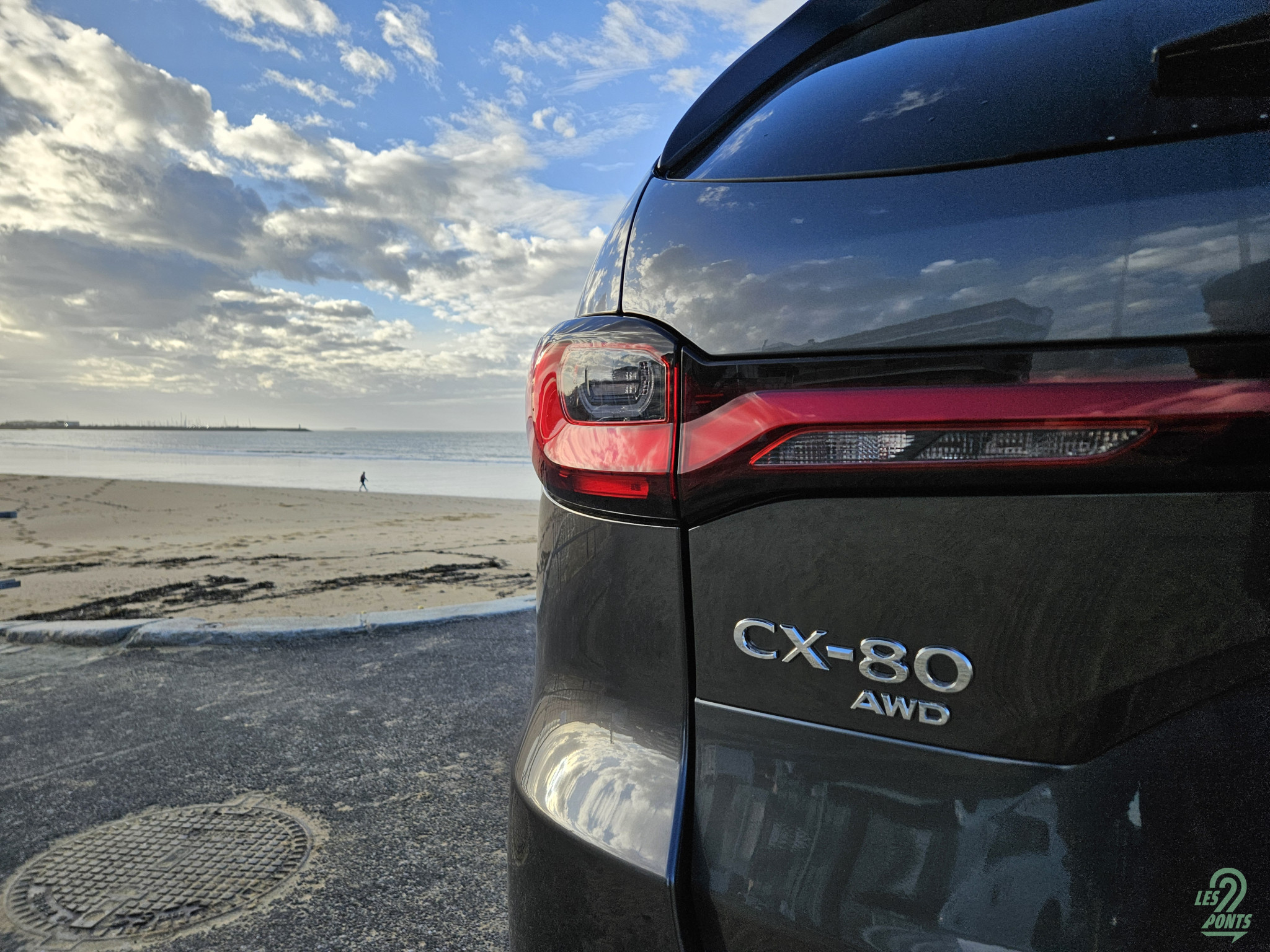Le Mazda CX-80 affiche de nombreux badges sur sa carrosserie, faisant état de sa transmission intégrale, de sa micro-hybridation ou encore de la présence d’un moteur six cylindres en ligne. Le point le plus important, dîtes-vous ?