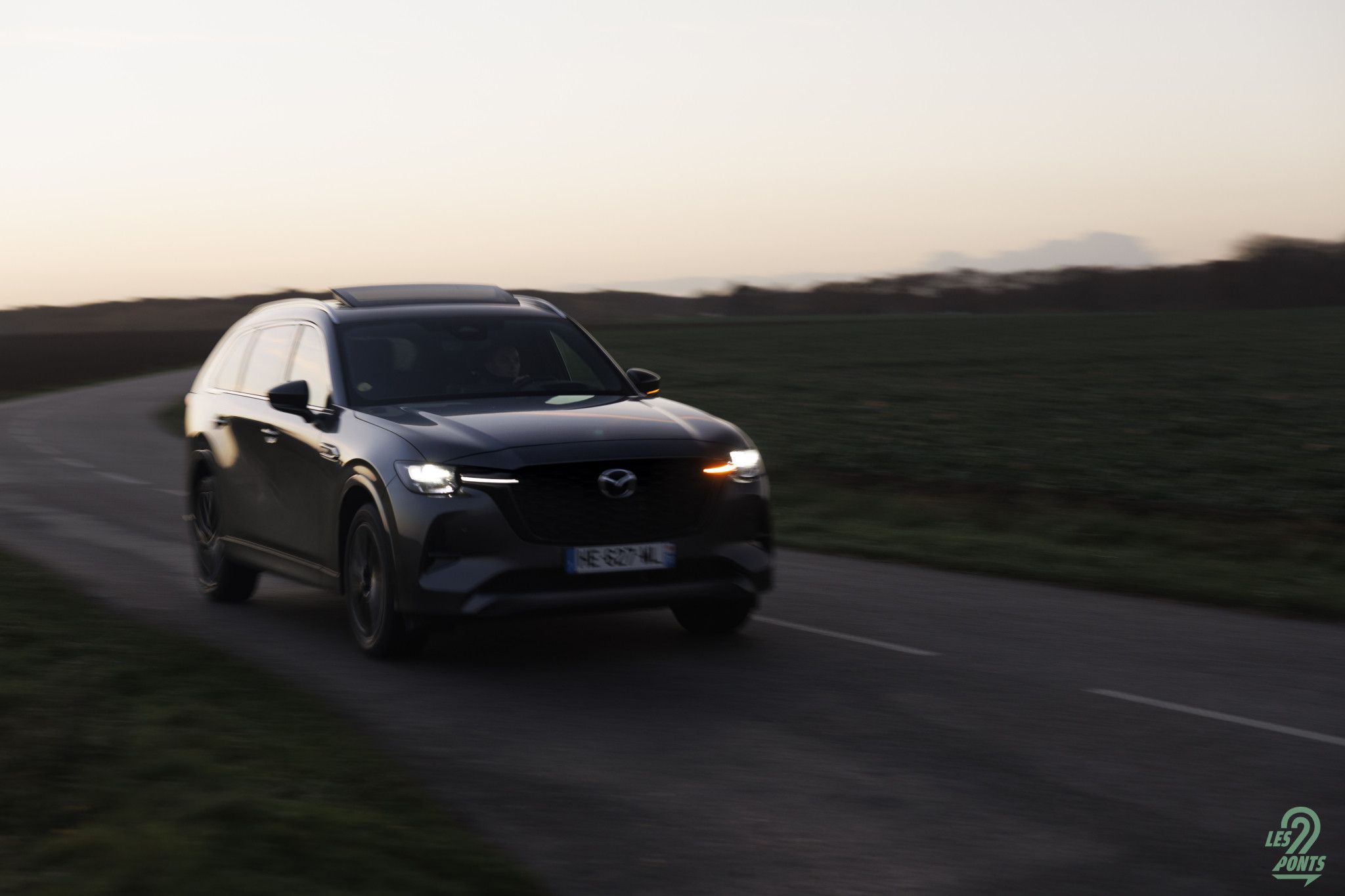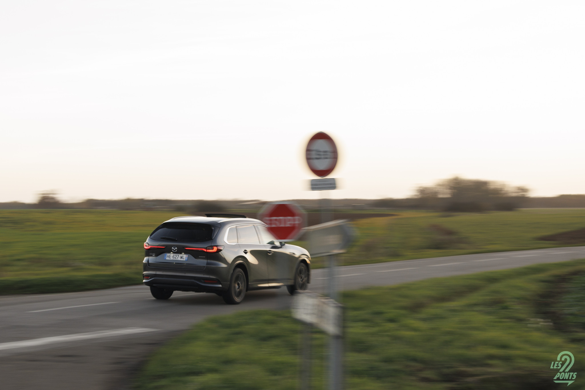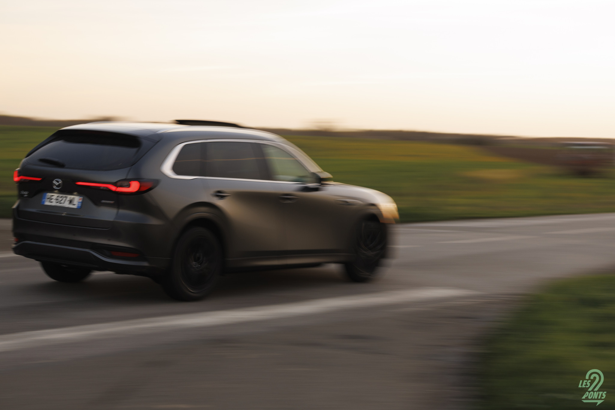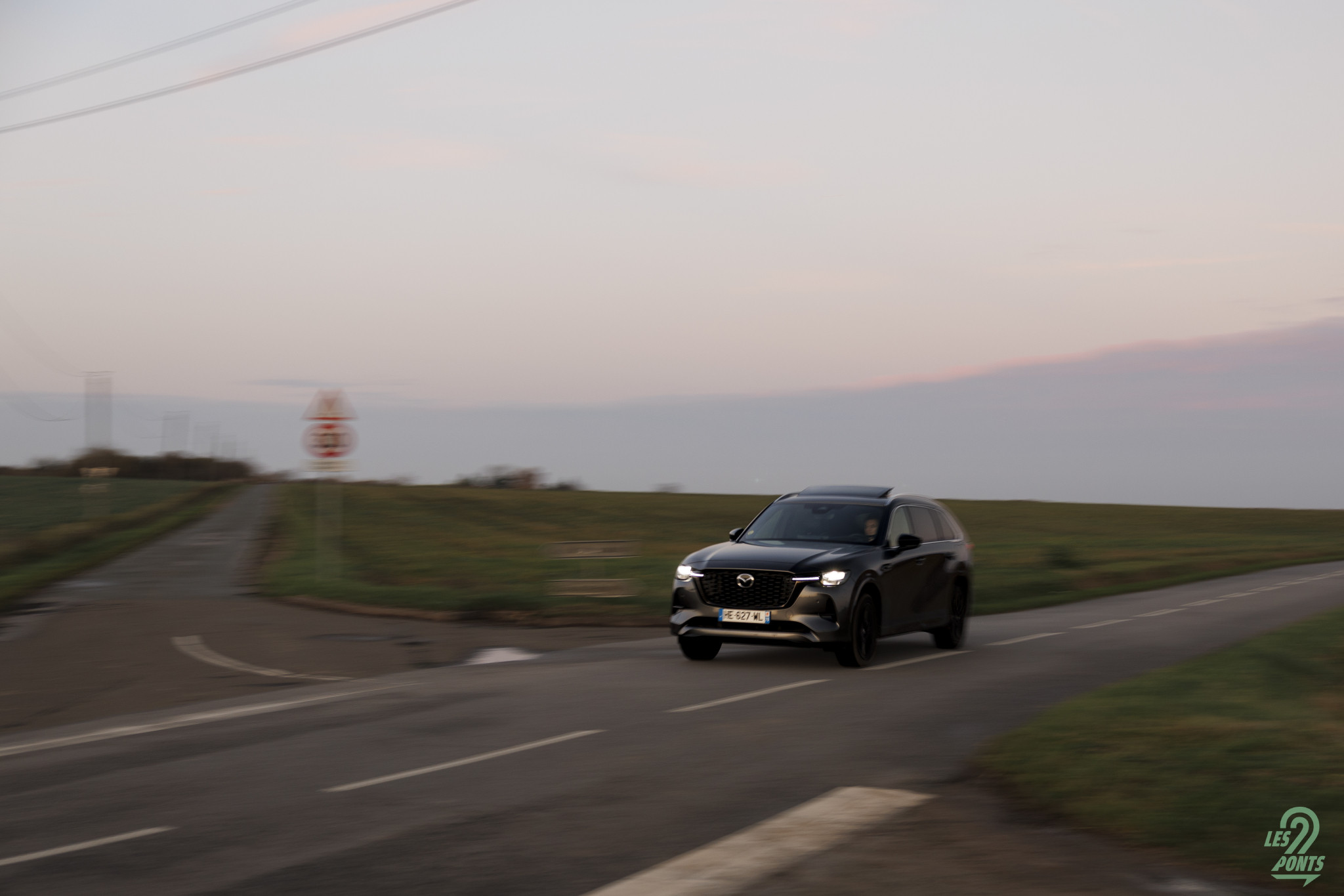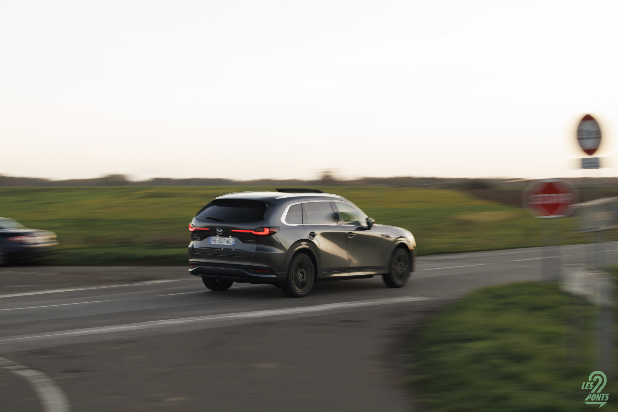 Particulièrement et volontairement souple, la boîte de vitesses à huit rapports Skyactiv-Drive fait son travail en tout discrétion. Le moteur 3,3L e-Skyactiv D ronronne telle une version plus discrète du six-cylindres en ligne biturbo diesel BMW B57, ne s’immisçant réellement dans l’habitacle qu’en forte accélération. Pour cela, il est conseillé de passer en mode Sport : l’interface rougit et la boîte gagne soudainement en réactivité. Le contraste est assez saisissant. Forcément, avec ses près de deux tonnes sur la balance, le Mazda CX-80 n’est pas un foudre de guerre pour autant. Ses 254 chevaux, transmis aux quatre roues (bien que l’essieu arrière semble concentrer la quasi-totalité de l’effort) auraient bien besoin du renfort d’une petite cinquantaine d’équidés. Le 0 à 100 km/h est annoncé en 8,4 secondes, pour une vitesse maximale théorique de 219 km/h, que le SUV est capable de dépasser de quelques unités sur autobahn.
