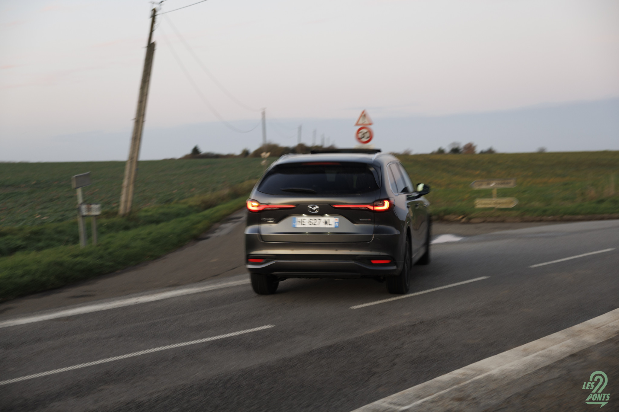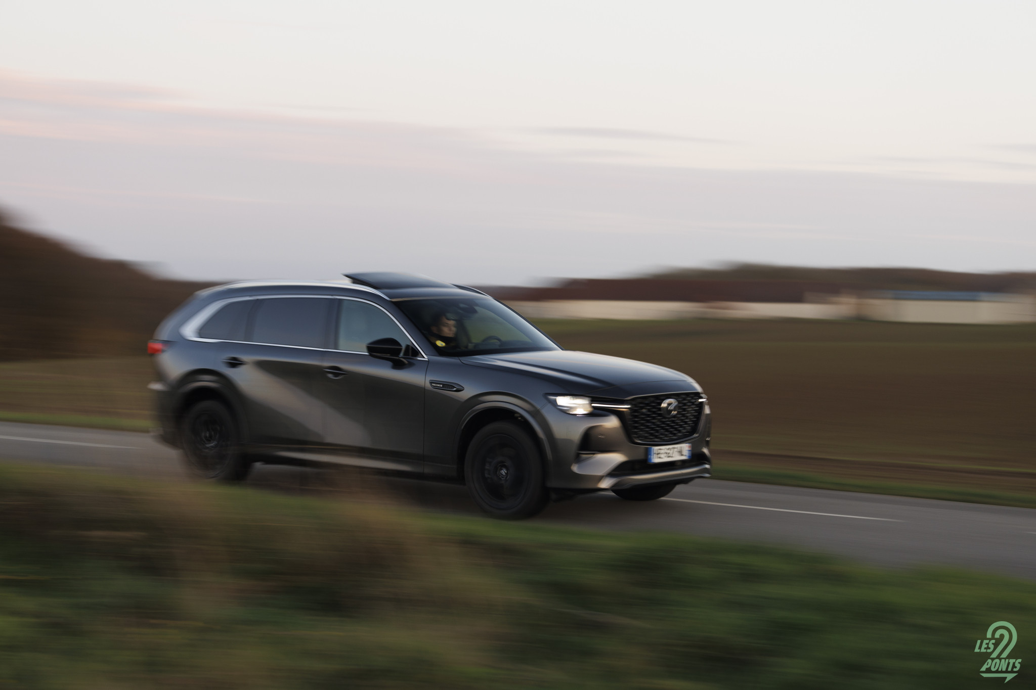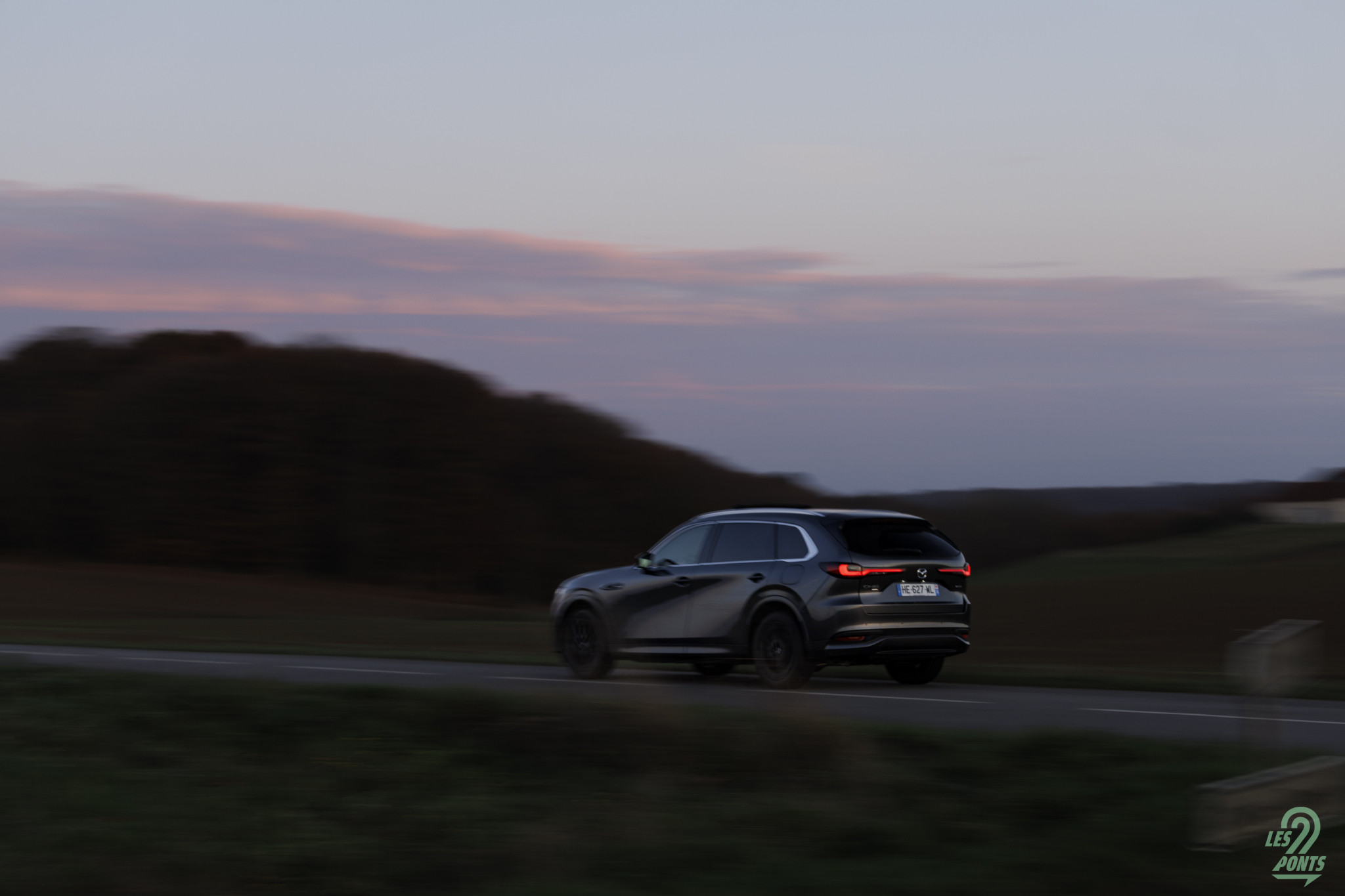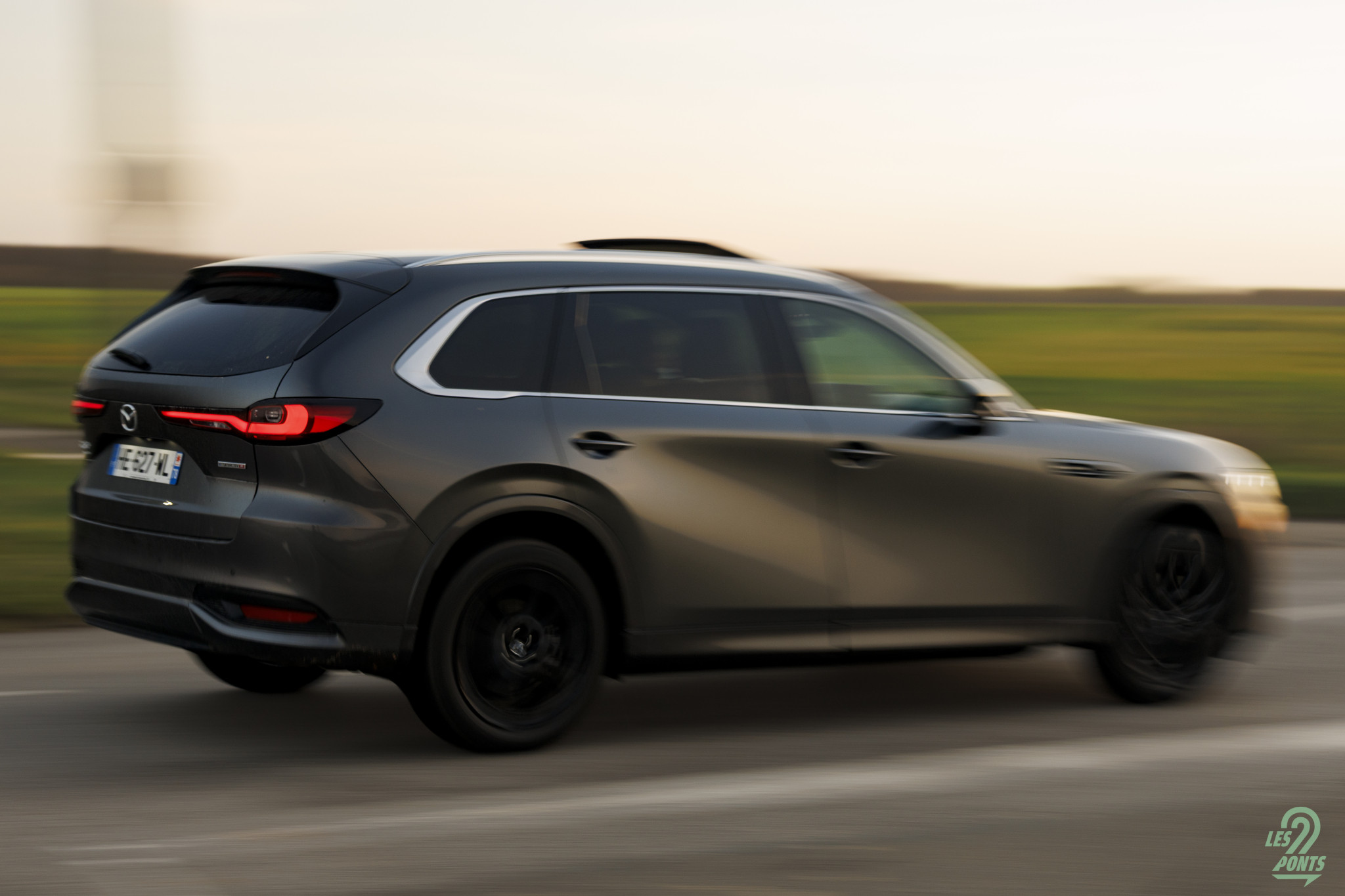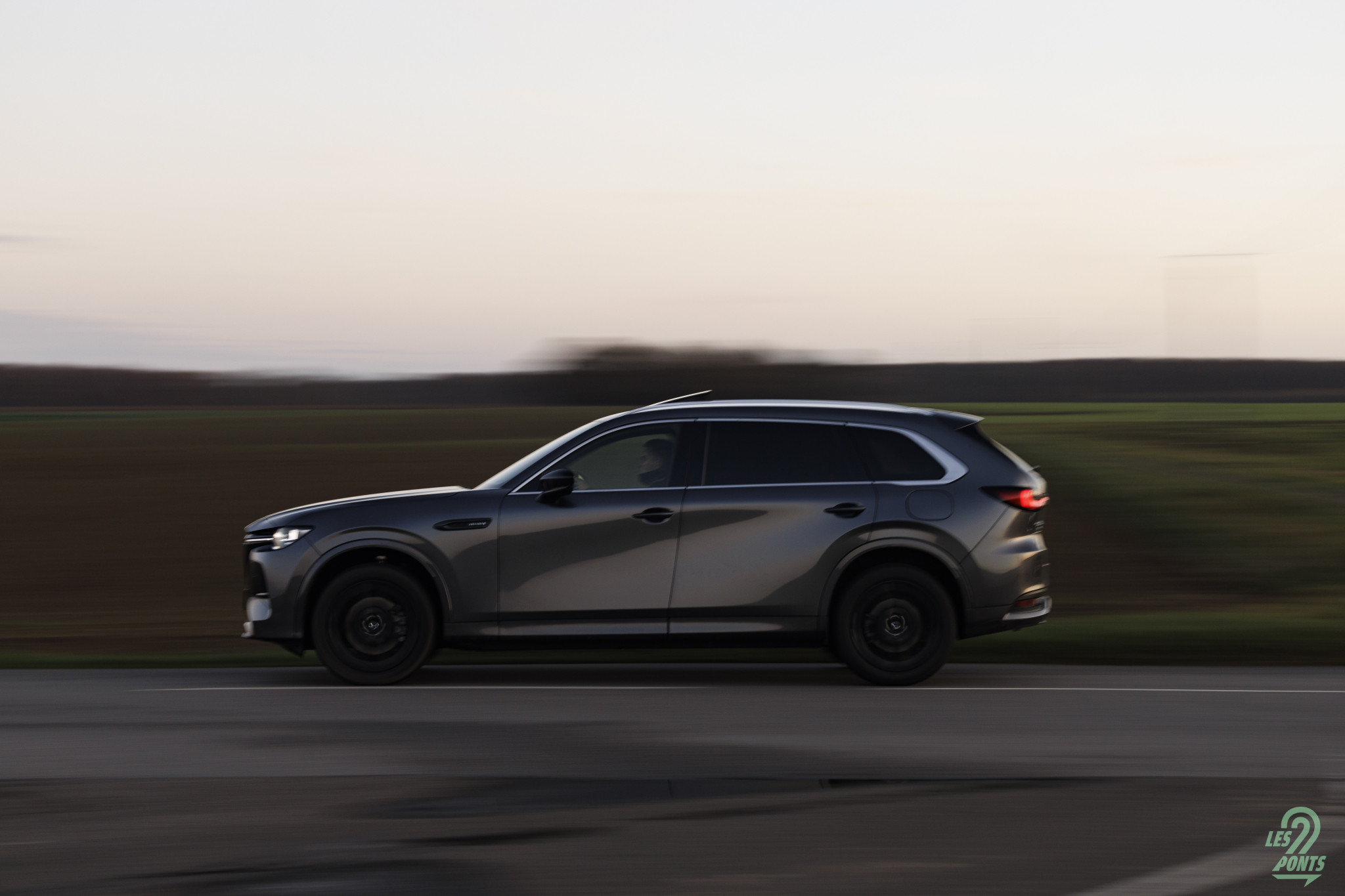 Le gros des tests autoroutiers a été effectué avec deux adultes et une quantité réduite de bagages. Avec cette charge minime, le Mazda CX-80 n’est que peu sollicité. La voie rapide est son terrain idéal. Le confort de suspension paraît presque ferme par rapport à une Citroën C5 Aircross, mais le compromis est finalement trouvé : pas de douleurs au postérieur après 5 heures de route. Le conséquent réservoir de 72 litres est idéal pour traverser la France. Avec un vent défavorable, régulateur adaptatif activé à 135 km/h, le SUV affiche une consommation de 7,5 l/100 km ; moyenne qui baissera de 0,5 litre dans le sens inverse. Mouvoir plus de deux tonnes – avec passagers – dans un véhicule aussi imposant demande un gros travail aérodynamique. Voilà sûrement la raison de sa hauteur rabaissée par rapport aux rivaux allemands. Amusez-vous à rabattre les rétroviseurs et vous entendrez immédiatement les flux d’air.