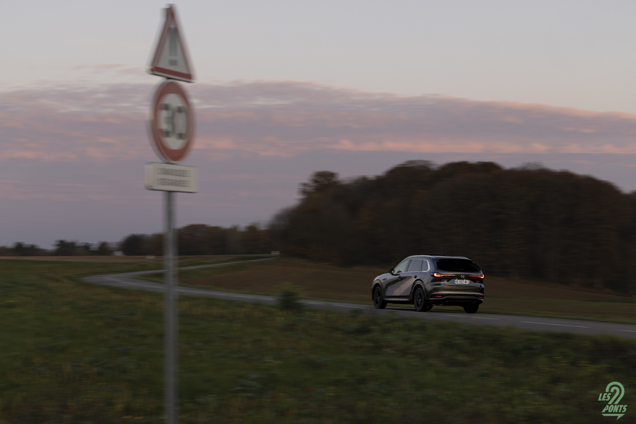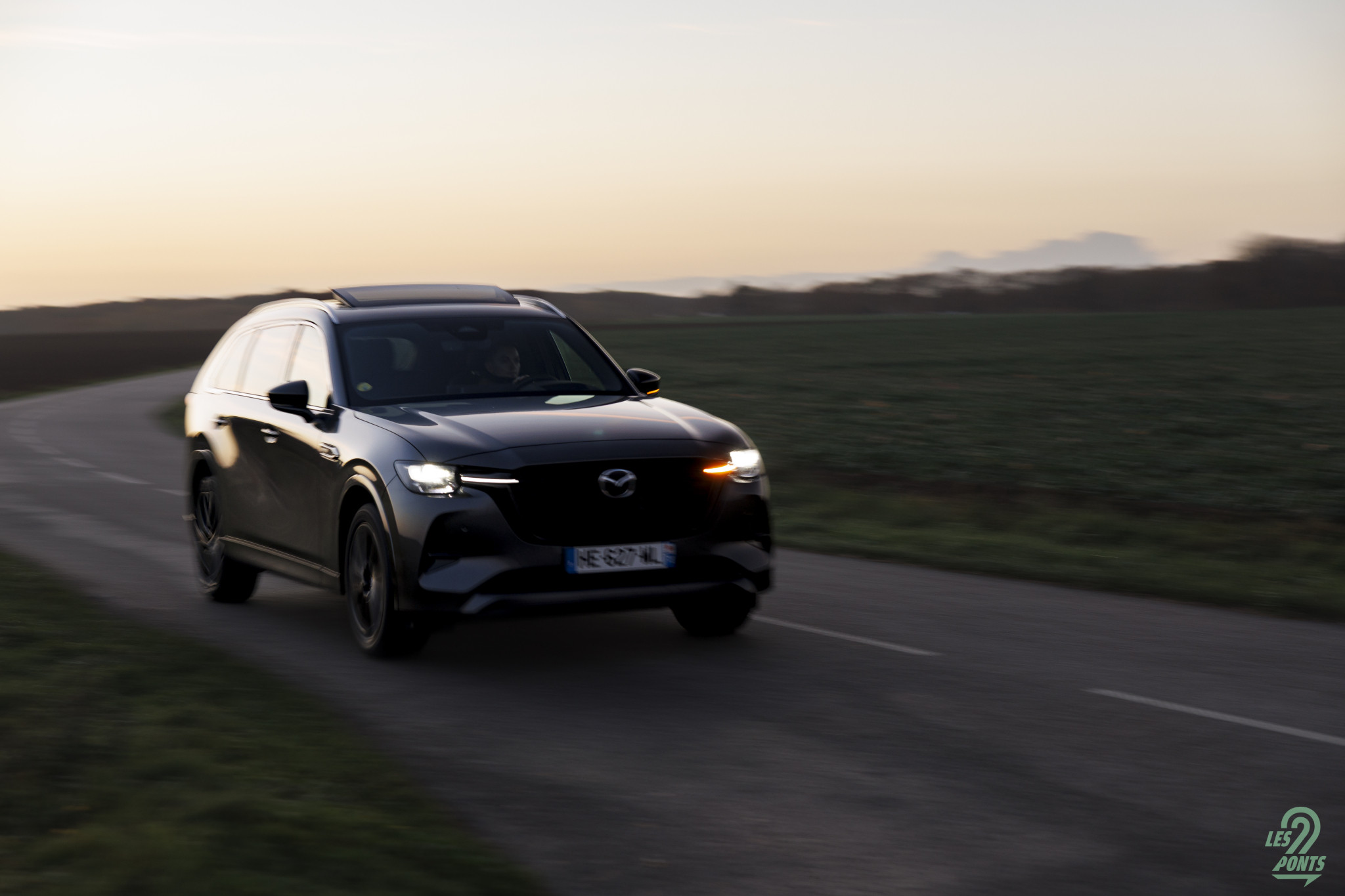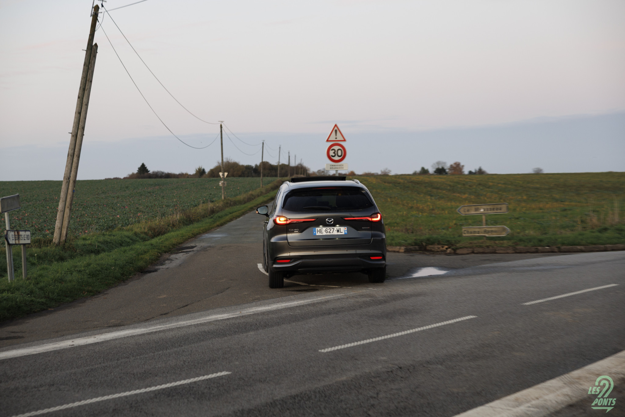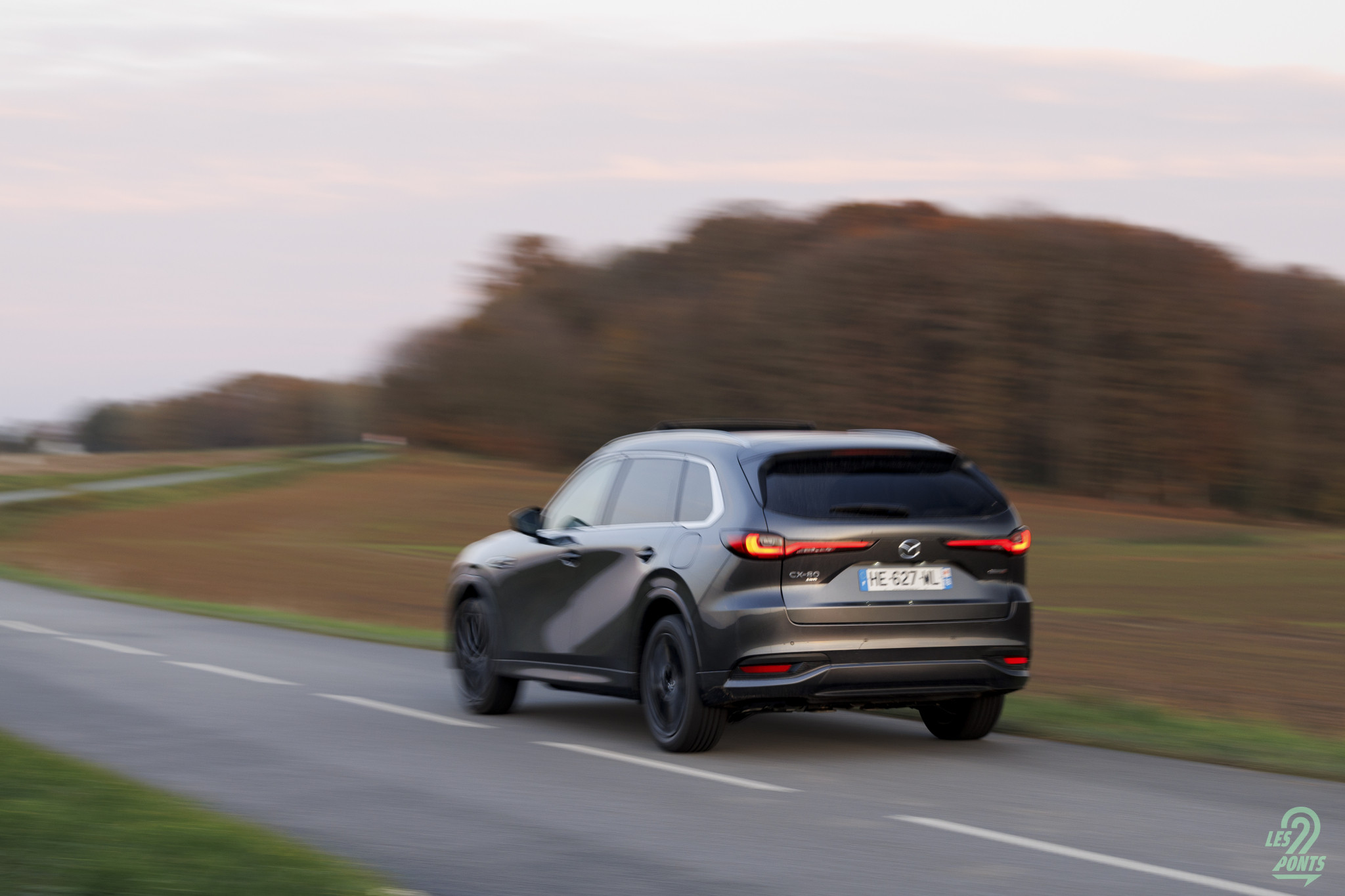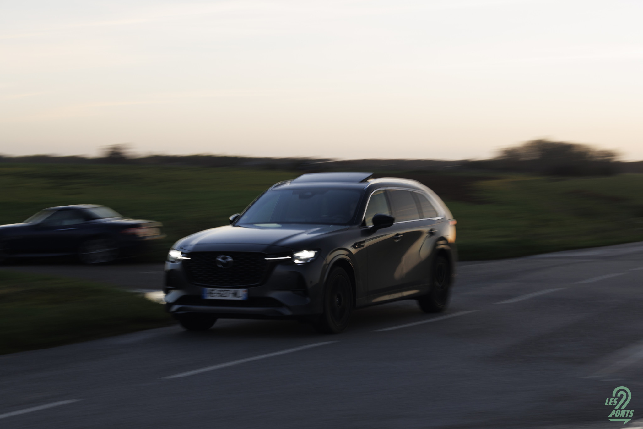 Le gros des tests autoroutiers a été effectué avec deux adultes et une quantité réduite de bagages. Avec cette charge minime, le Mazda CX-80 n’est que peu sollicité. La voie rapide est son terrain idéal. Le confort de suspension paraît presque ferme par rapport à une Citroën C5 Aircross, mais le compromis est finalement trouvé : pas de douleurs au postérieur après 5 heures de route. Le conséquent réservoir de 72 litres est idéal pour traverser la France. Avec un vent défavorable, régulateur adaptatif activé à 135 km/h, le SUV affiche une consommation de 7,5 l/100 km ; moyenne qui baissera de 0,5 litre dans le sens inverse. Mouvoir plus de deux tonnes – avec passagers – dans un véhicule aussi imposant demande un gros travail aérodynamique. Voilà sûrement la raison de sa hauteur rabaissée par rapport aux rivaux allemands. Amusez-vous à rabattre les rétroviseurs et vous entendrez immédiatement les flux d’air.