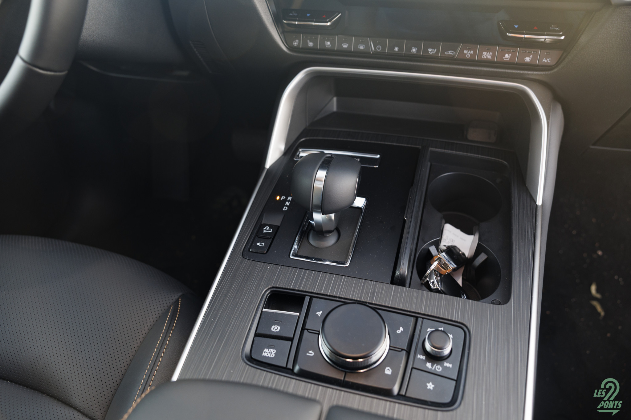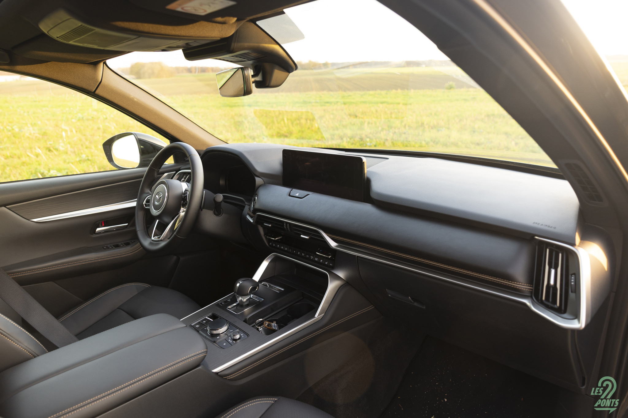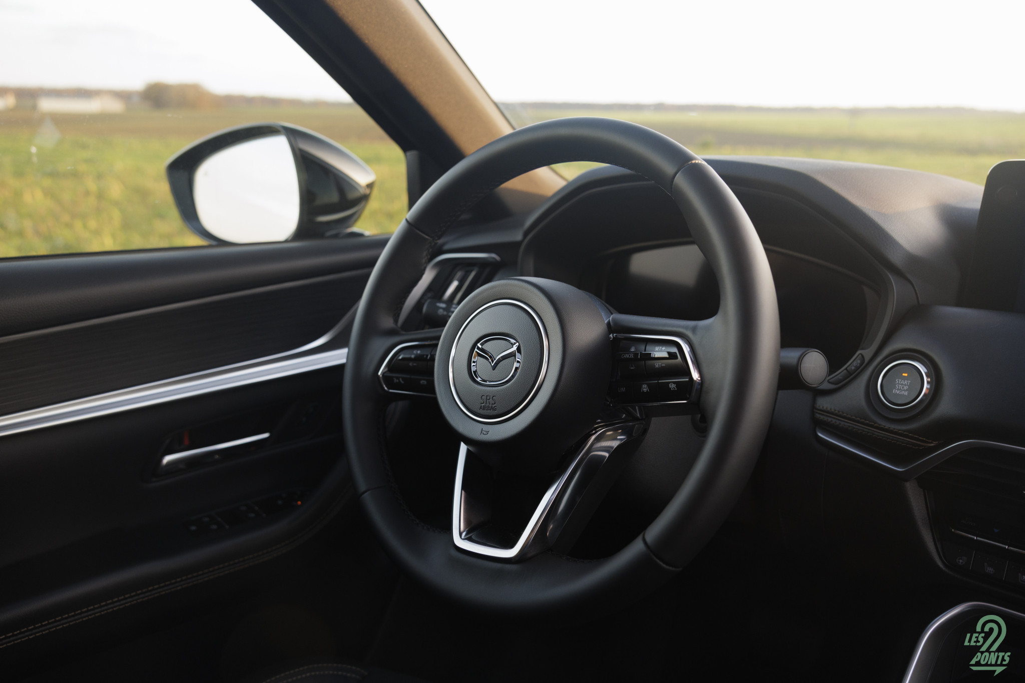 L’habitacle des Mazda CX-60 et CX-80 est quasiment identique. En finition Homura Plus, la version 7 places embarque une sellerie Nappa en cuir noir. C’est beau, encore une fois discret, et peut-être un poil plus triste que l’intérieur blanc proposé sur les versions Takumi et Takumi Plus. Cela ne change rien au confort de l’assise et au côté rassurant d’un habitacle ayant choisi de conserver de nombreux boutons physiques. Sur la console centrale, sous l’habillage en film aluminium noir brossé des contre-portes, sur le volant… il y en a partout, jusqu’au tableau de bord ! Il convient de mémoriser les différents raccourcis programmés, et menus cachés, pour profiter pleinement des possibilités de l’auto. À trois branches, le volant est d’ailleurs particulièrement doux. Le puriste, qui en demande toujours plus, regrettera l’absence d’un rappel du badge « Inline 6 » sur la partie basse. On glisse l’idée là, comme ça.