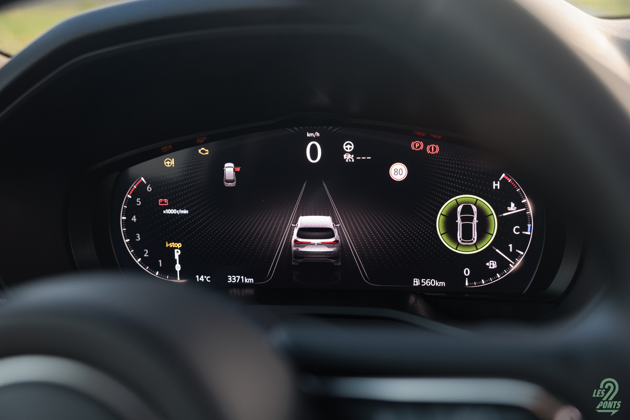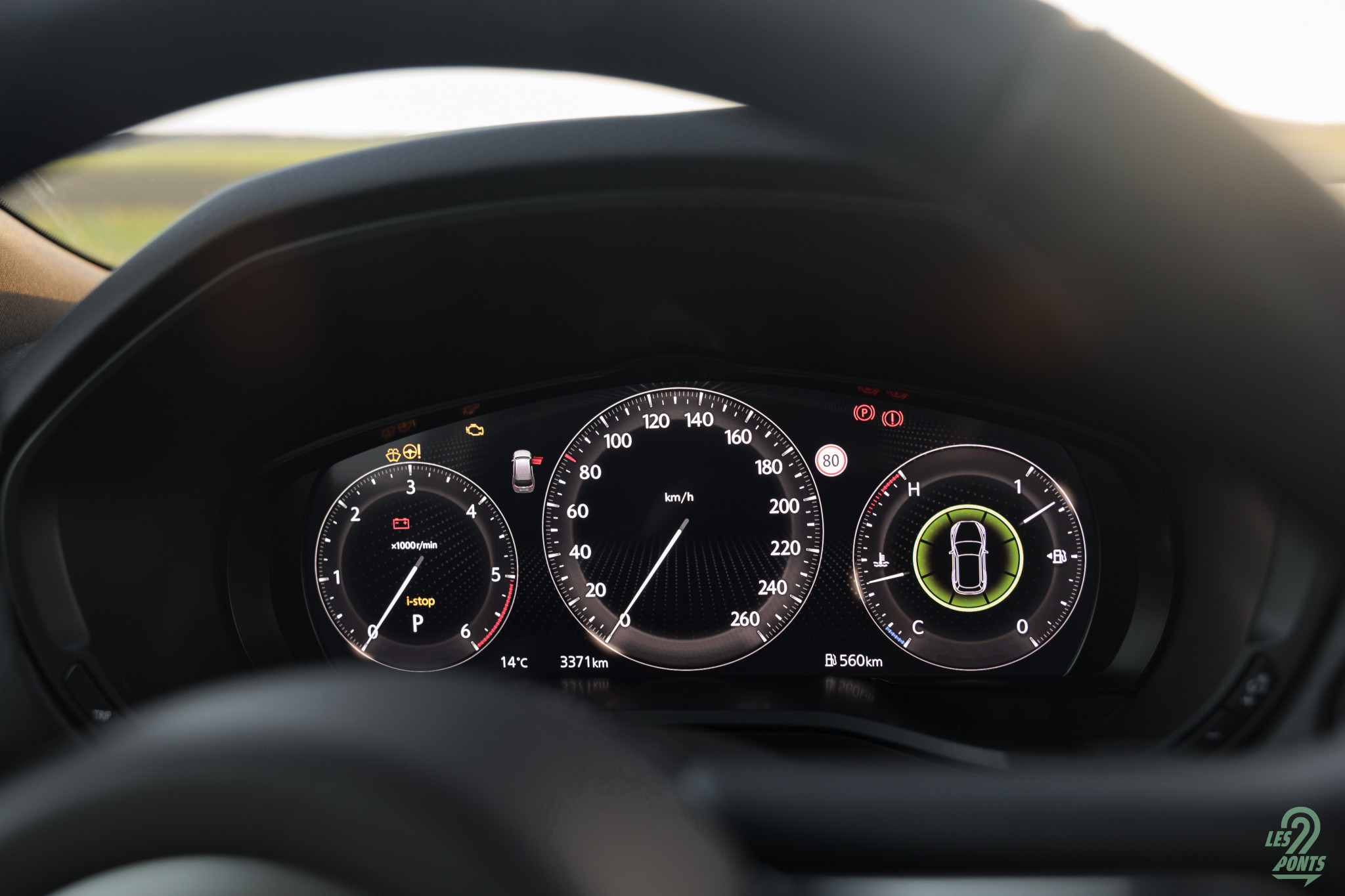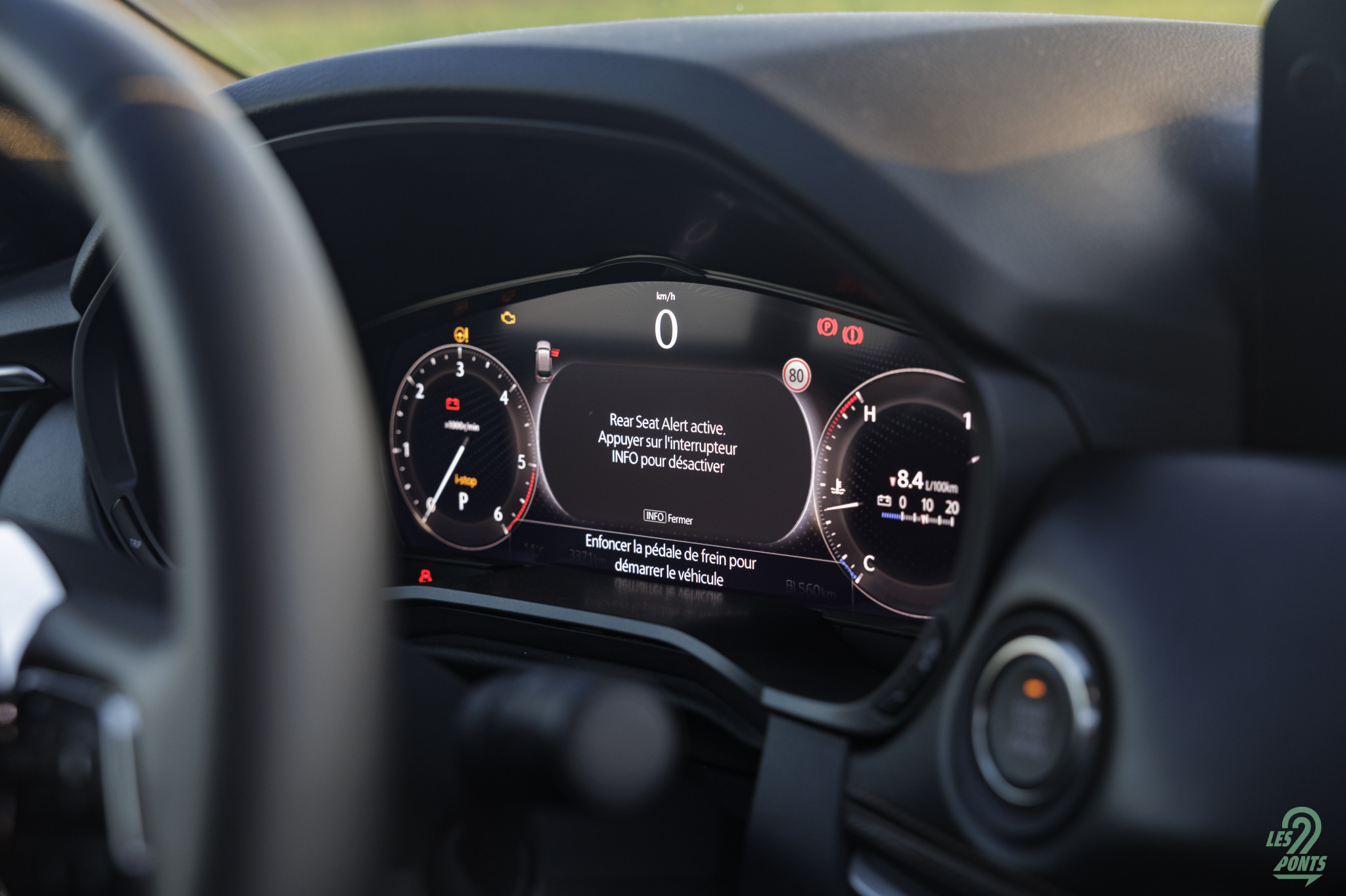 Conforme aux normes GSR-II obligatoires, le Mazda CX-80 propose de couper les avertisseurs sonores d’excès de vitesse grâce à un bouton, à la gauche du volant, devenant rapidement un rituel de passage à chaque démarrage.