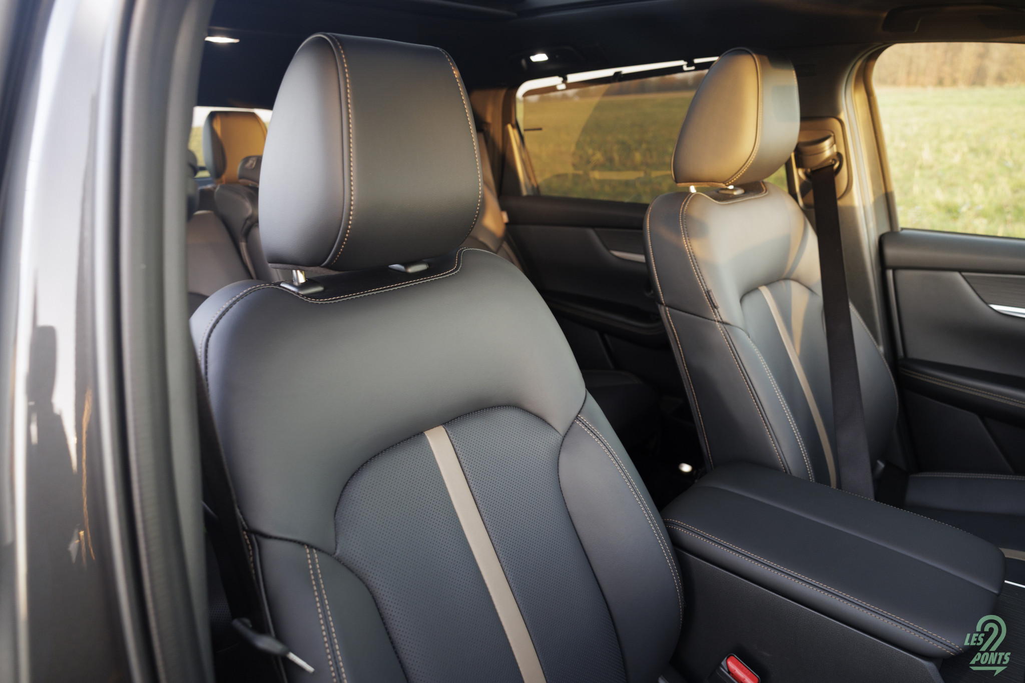 Une fois bien appréhendée, l’ergonomie de l’habitacle est très appréciable. L’écran de 12,3” est idéal, il n’y a pas besoin de plus grand. On retrouve rapidement les commandes nécessaires pour un trajet connecté, avec des prises UBS-C et un chargeur à induction forcément plutôt lent. Notons néanmoins que les éléments plastiques ou tapissés sur lesquels nous pourrions poser un smartphone le temps de sa charge ont tendance à considérablement chauffer, tout comme les sièges, à l’avant et au rang 2, ainsi que le volant. Inutile de préciser à quel point cela peut être agréable en automne. Evoquons également le toit vitré panoramique et les excellentes enceintes Bose, crachant des basses timides – même au niveau maximal – mais à la sonorité très maîtrisée. S’il ne reste que 258 litres de volume de coffre avec les 7 places (566 litres en 5 places), l’espace intérieur est suffisant, et très bien fini.