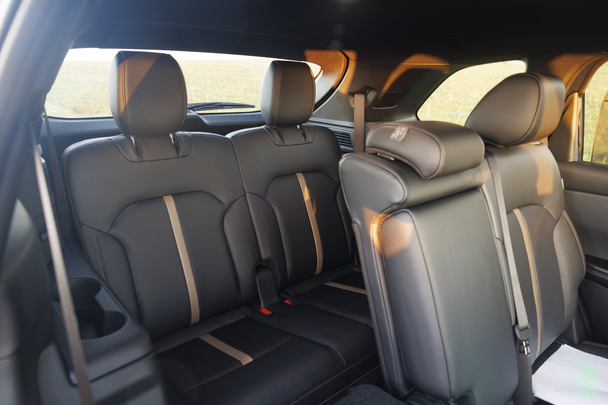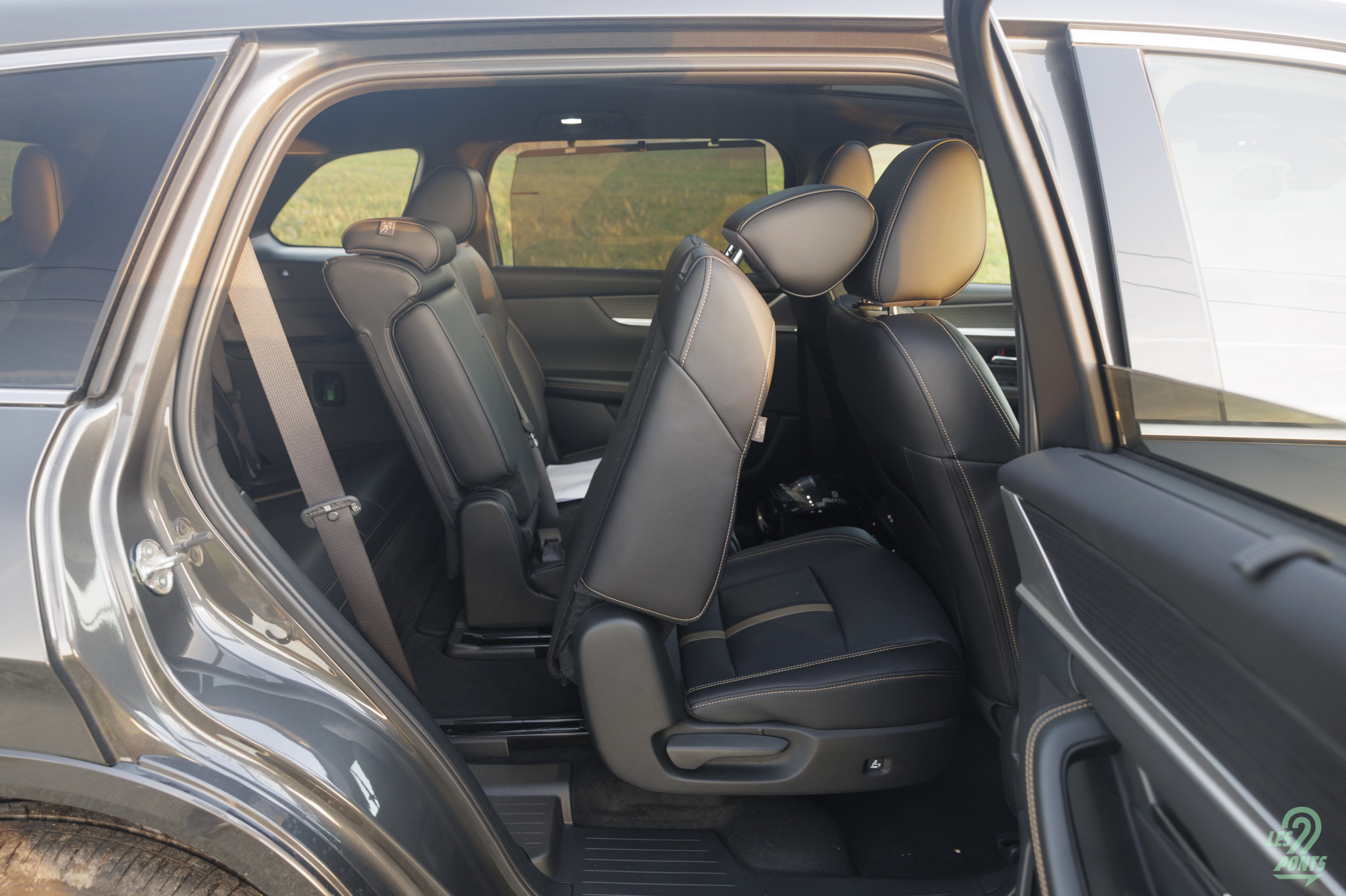 Le Mazda CX-80 peut aisément prétendre au titre de SUV 7 places le plus long commercialisé en Europe … quand la MX-5 est des plus petites autos de grande production ! Avec ses 4,995 mètres, il dépasse le Mercedes GLE (4,92 mètres) et le Volvo XC90 (4,95 mètres). Il n’y a qu’à essayer de faire un créneau avec pour s’en apercevoir : il faut de la place. Fort heureusement, le SUV japonais est bien fourni en caméras proposant une vue d’ensemble autour du véhicule. Il faut maîtriser la perspective de celle dévoilant l’arrière, mais elles permettent de manœuvrer avec bien plus de facilité. Même les réfractaires s’y mettront, encore plus si la troisième rangées de sièges est occupée. Moins haut que ses rivaux cités plus tôt, le CX-80 renforce l’impression d’avoir un capot gigantesque. Ce dernier n’obstrue pourtant pas la visibilité. Au contraire, dans une moindre mesure, des énormes rétroviseurs.