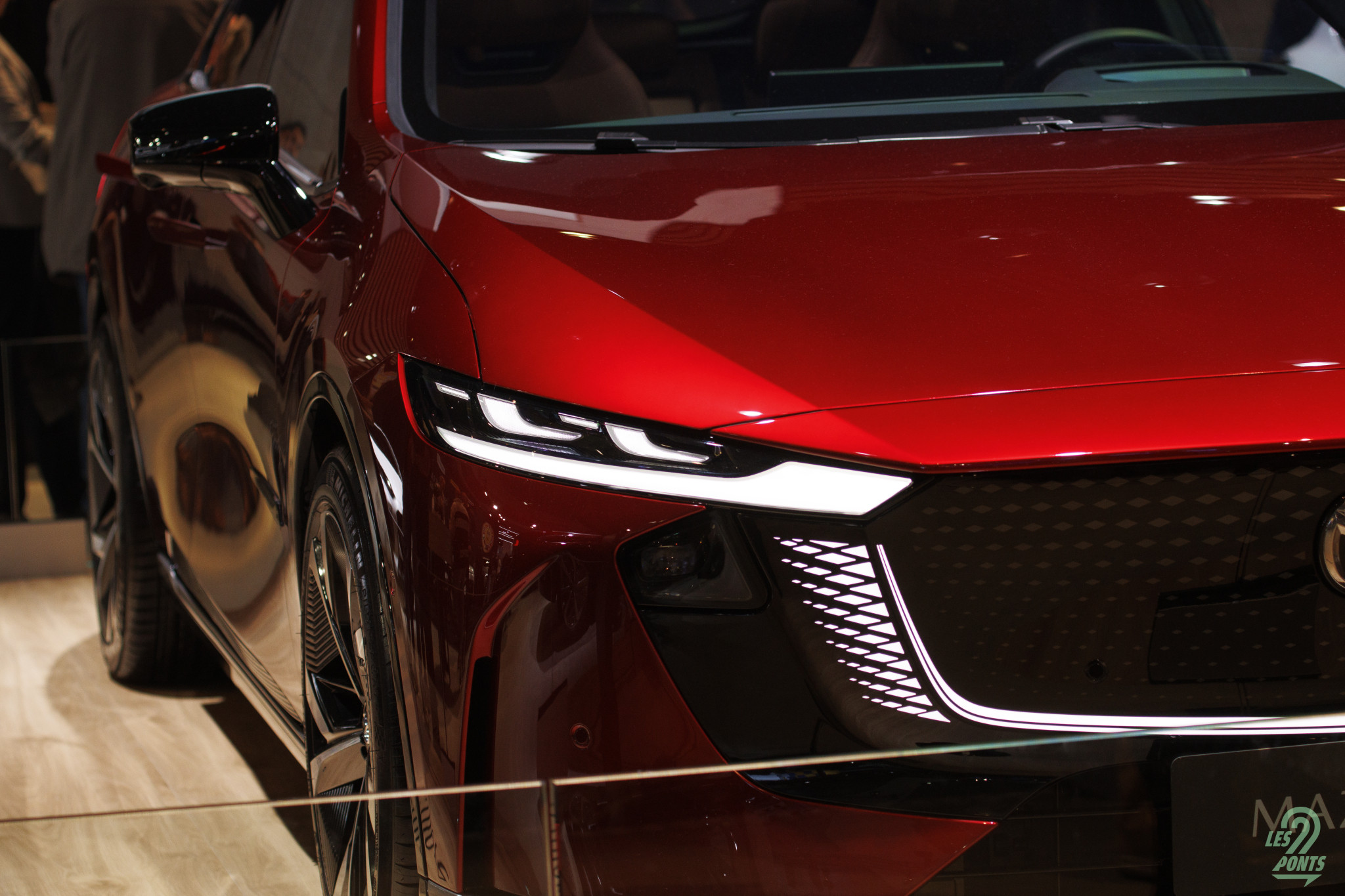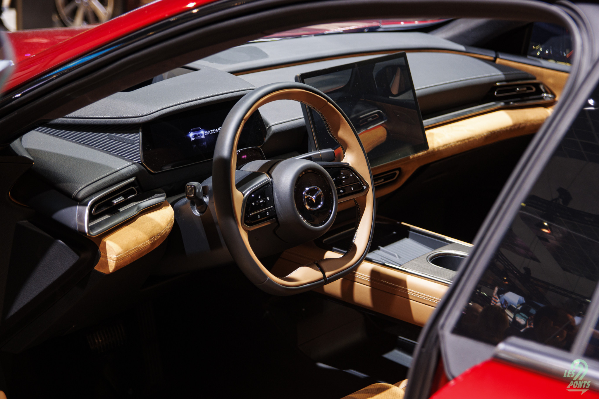 Jérémy vous parlait de la configuration un peu terne de sa version Homura Plus : justement la gamme 2026 intègrera une nouvelle sellerie cuir matelassée “Tan”, sur ces finitions Homura et Homura Plus ! L’ensemble s’associe à un volant bicolore, des vitres acoustiques à l’avant et une planche de bord garnie d’une suédine façon Alcantara. Un tel intérieur nous rappelle largement la configuration de présentation de la récente sœur berline électrique 6e. Une bonne chose en tout cas ! En revanche, ces finitions gardent forcément les jantes teintées noires …