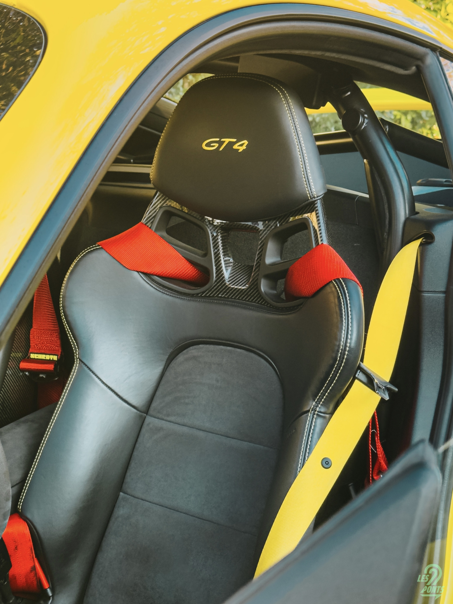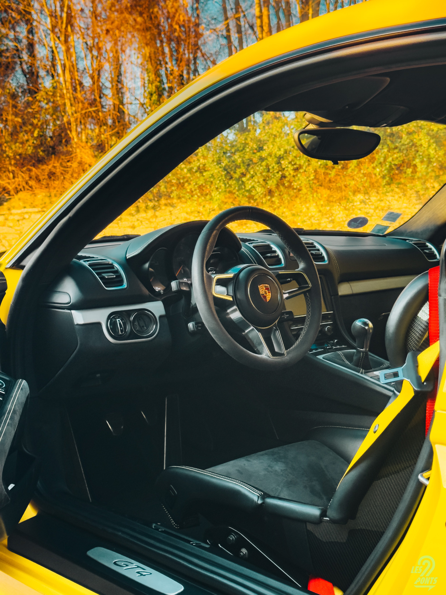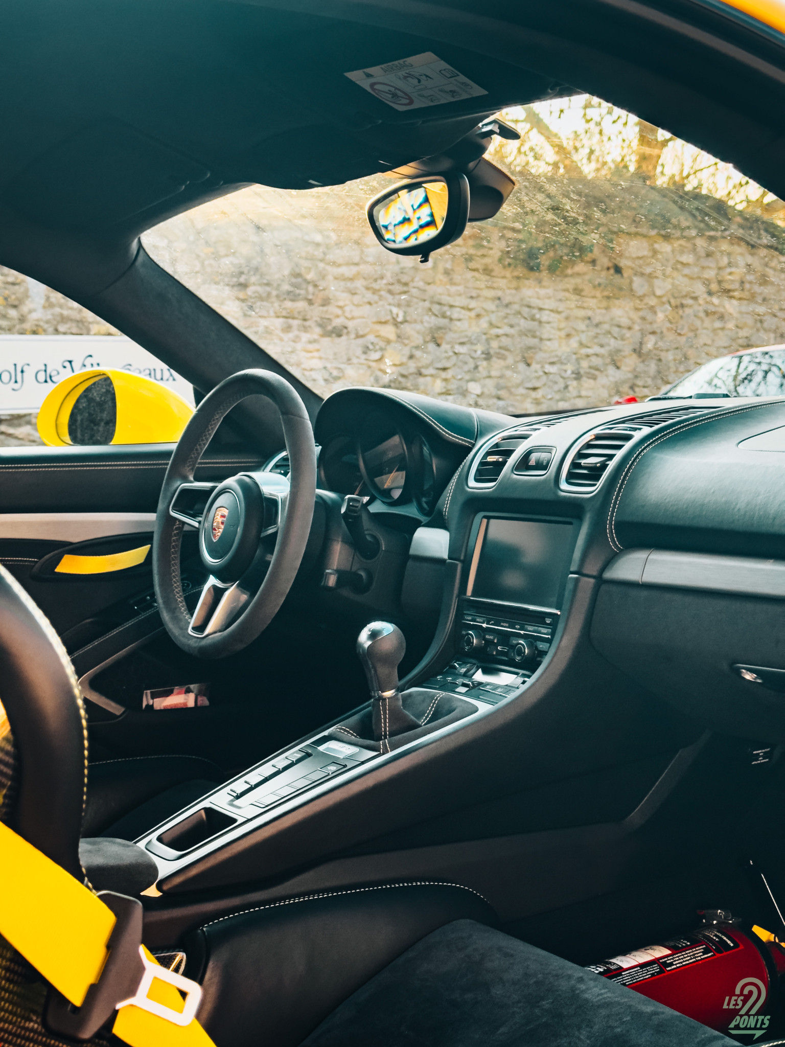 J’ouvre la portière conducteur. Mon regard est immédiatement attiré par le seuil de porte en aluminium brossé, gravé du logo GT4. Une autre signature de l’orientation piste du modèle, les boucles en textile jaune qui remplacent les poignées conventionnelles. Je m’installe dans les baquets carbone issus de la 918 Spyder dont le maintien est parfait. Ils sont habillés de cuirs surpiqués en jaune, comme le monogramme GT4 brodé sur l’appui-tête, et d’alcantara sur la partie centrale. Derrière les sièges, on trouve l’arceau du pack Clubsport qui souligne la radicalité de la GT4. Les harnais six points n’attendent plus qu’à être attachés, et un extincteur est disposé côté passager, prêt à intervenir en cas de besoin. Le ciel de toit en alcantara termine ce tableau, donnant à l’habitacle un sentiment d’enveloppement et de concentration totale sur la route.