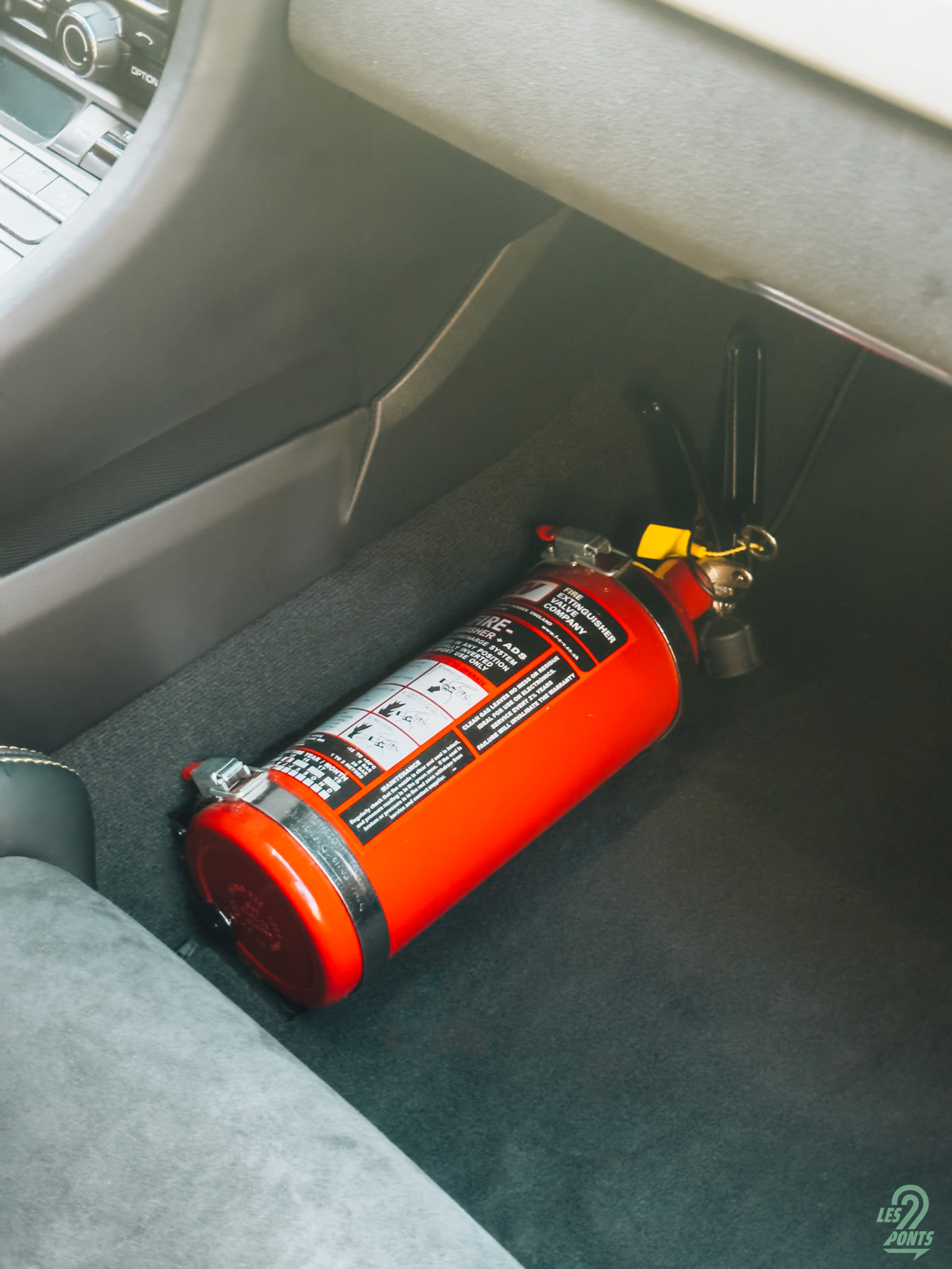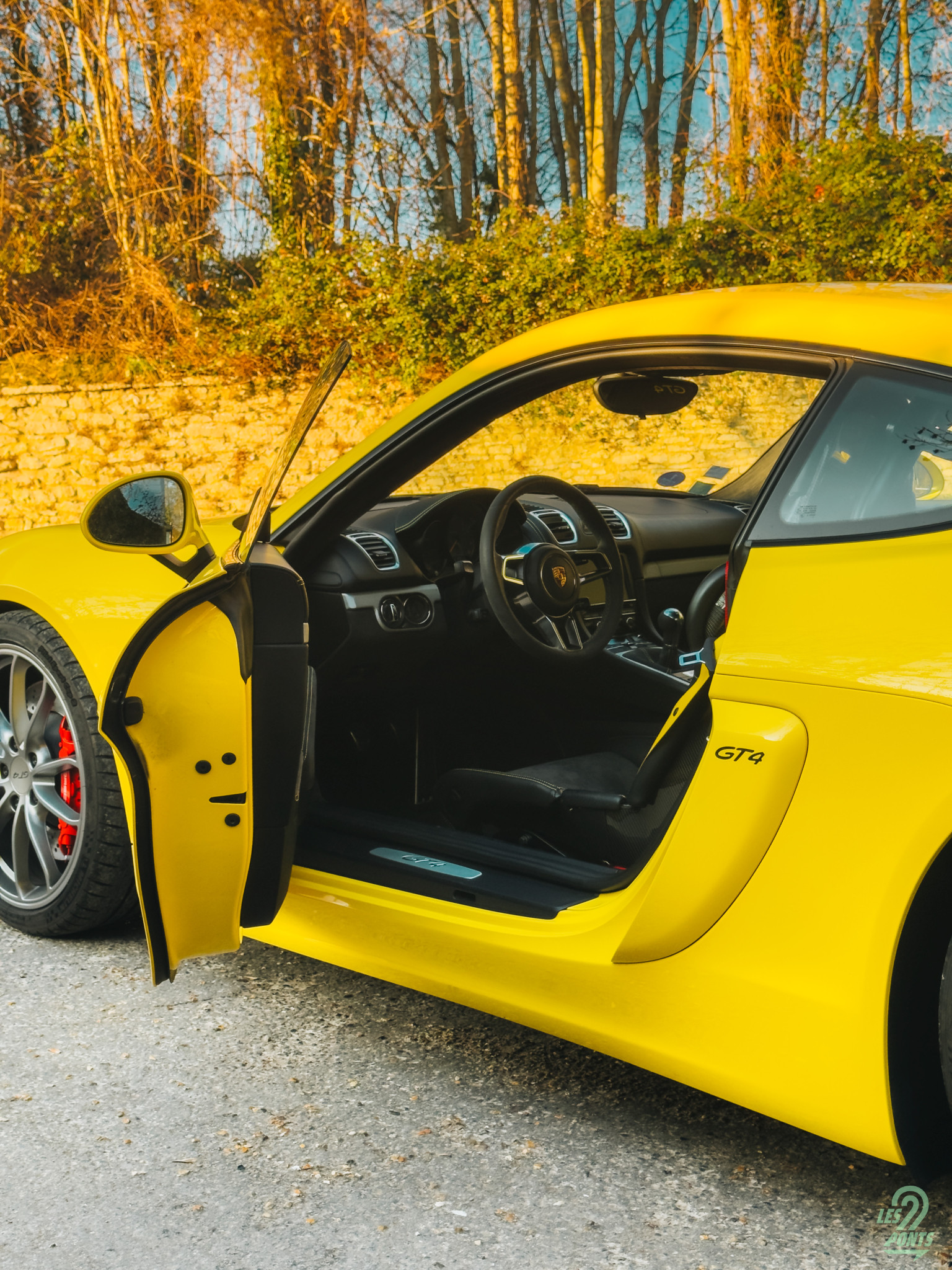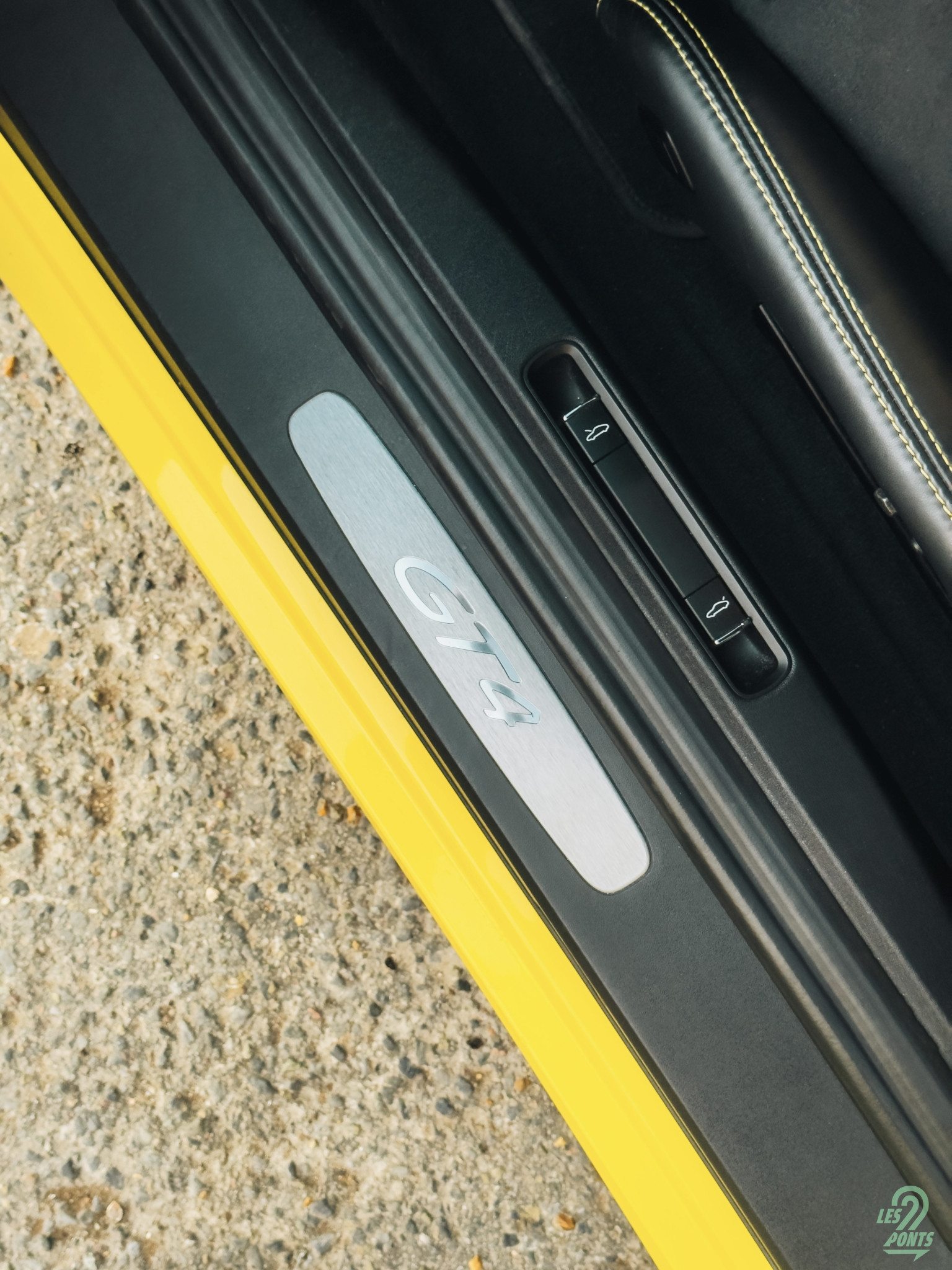 J’ouvre la portière conducteur. Mon regard est immédiatement attiré par le seuil de porte en aluminium brossé, gravé du logo GT4. Une autre signature de l’orientation piste du modèle, les boucles en textile jaune qui remplacent les poignées conventionnelles. Je m’installe dans les baquets carbone issus de la 918 Spyder dont le maintien est parfait. Ils sont habillés de cuirs surpiqués en jaune, comme le monogramme GT4 brodé sur l’appui-tête, et d’alcantara sur la partie centrale. Derrière les sièges, on trouve l’arceau du pack Clubsport qui souligne la radicalité de la GT4. Les harnais six points n’attendent plus qu’à être attachés, et un extincteur est disposé côté passager, prêt à intervenir en cas de besoin. Le ciel de toit en alcantara termine ce tableau, donnant à l’habitacle un sentiment d’enveloppement et de concentration totale sur la route.