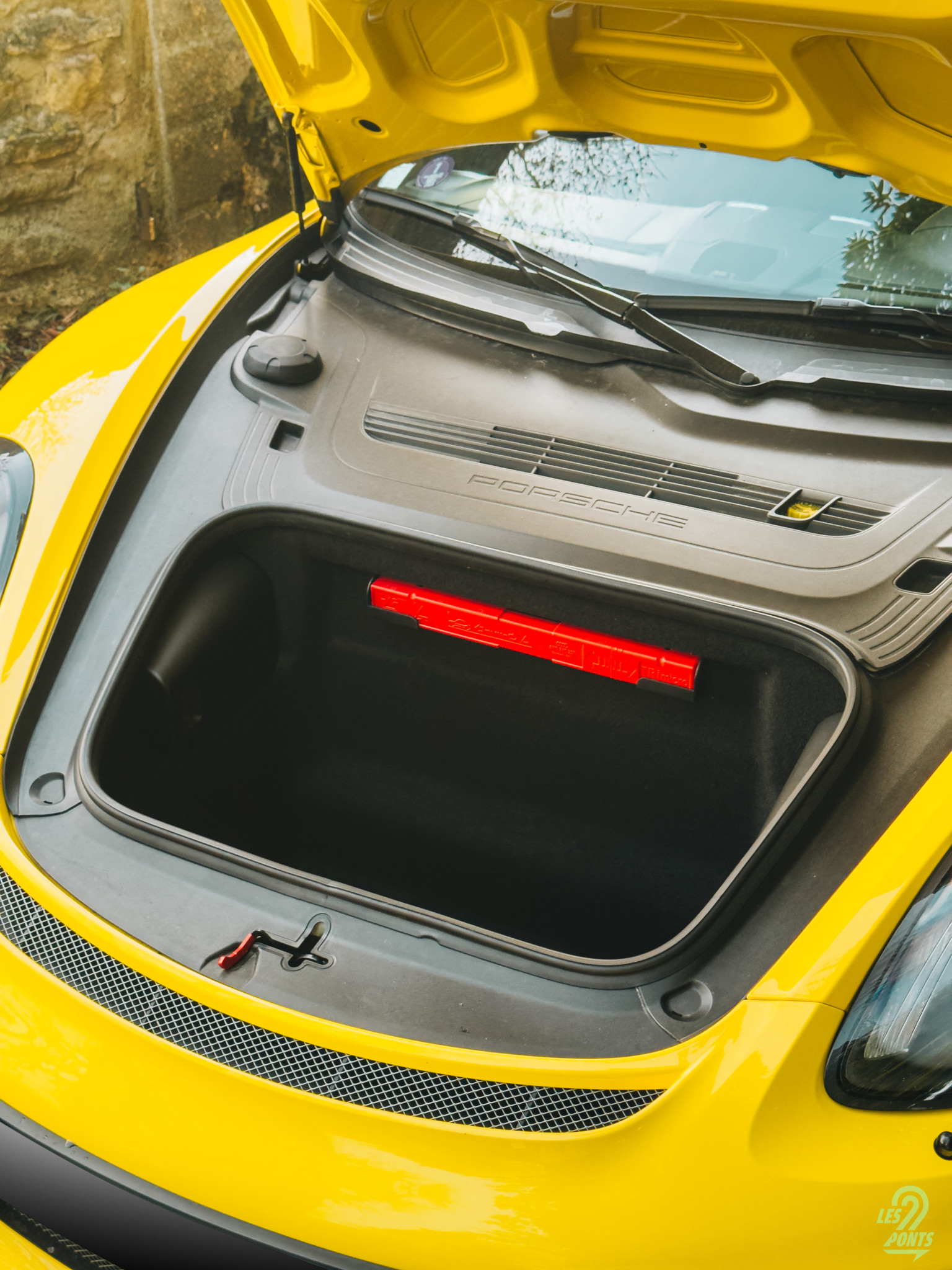 À l’arrière, l’aileron fixe et large, est une signature immédiate de la GT4. Sous cet aileron, les optiques arrière rouges offrent une signature visuelle très identifiable. Au milieu, un becquet discret, un peu façon ducktail prend place. Le logo Porsche, inscrit en toutes lettres, et l’écusson GT4 sont en noirs, offrant un contraste saisissant avec le jaune de la carrosserie. Sur la partie inférieure, les doubles sorties d’échappement centrales murmurent déjà la promesse d’une sonorité envoûtante. Elles sont encadrées par le diffuseur noir qui participe lui aussi à l’aérodynamisme. J’en profite pour ouvrir le hayon, révélant une capacité de chargement convaincante de 300 litres. Vu la configuration, il y a de quoi accueillir sans problème un sac de clubs de golf, par exemple. Associée au coffre avant, la capacité totale atteint 425 litres, une polyvalence plutôt rare pour une voiture à vocation piste. Dans le coffre à l’arrière, on peut faire l’appoint d’huile moteur et le contrôle et l’appoint du niveau de liquide de refroidissement.