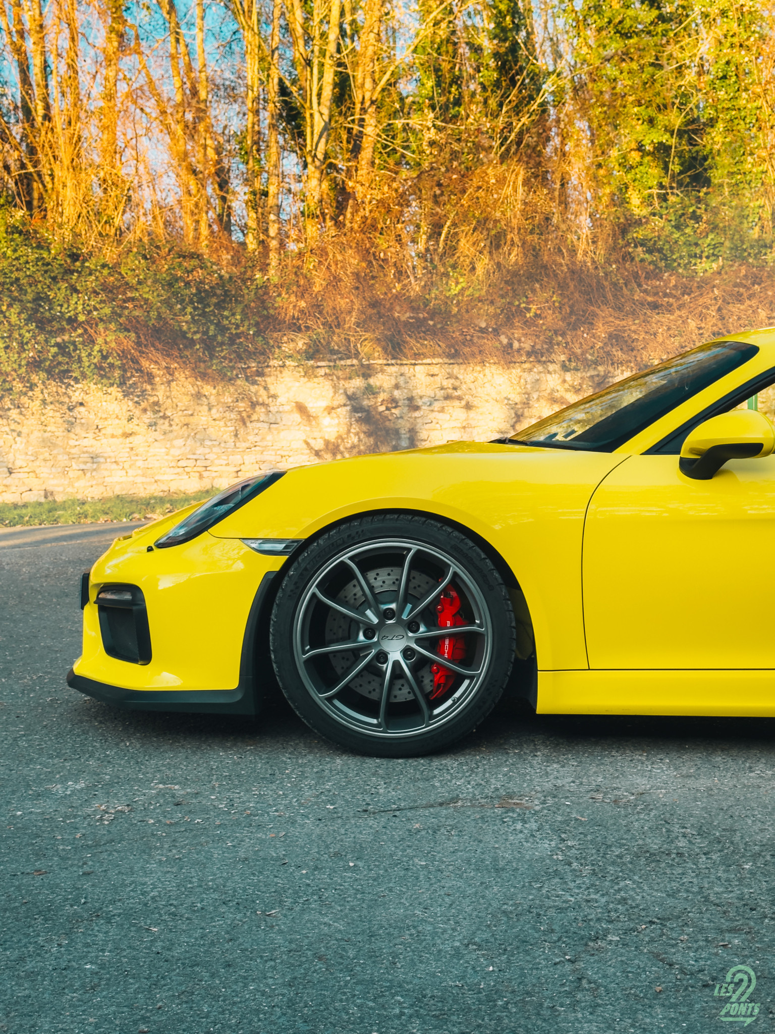 Nous sommes en plein cœur du Vexin, à Chaussy, au Golf de Villarceaux. Il fait beau, et le soleil de la fin d’après-midi est encore capté par le Racing Yellow de la GT4. A l’instar de la GT3, impossible pour elle de passer inaperçue, la Cayman GT4 affiche clairement ses ambitions de reine des circuits. De face, je remarque immédiatement son bouclier avant, plus proéminent que sur les Cayman standards. Il est spécifique, large et agressif, avec de grandes entrées d’air béantes. Rien n’est superflu : chaque ouverture a une fonction de refroidissement pour les radiateurs et les freins. La lèvre inférieure est sombre. Elle donne de l’appui sur l’essieu avant, favorisant une meilleure stabilité et un comportement plus précis à haute vitesse. Mon regard remonte vers les optiques de phares dont la signature Porsche immédiatement reconnaissable. Les feux de jour sont situés dans le bouclier, ils s’étirent aux deux extrémités. Je profite d’être ici pour ouvrir le coffre à l’avant, avec le bouton sur la clef ou via un bouton situé sur le seuil de porte. Avec une capacité de 125 litres et une profondeur généreuse, il peut aisément accueillir une ou deux valises.
