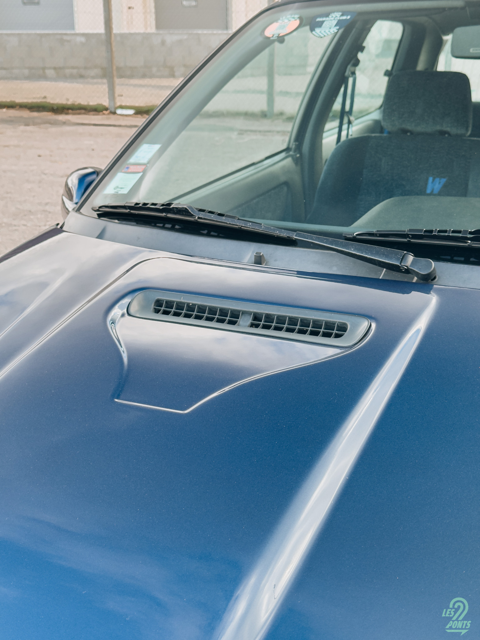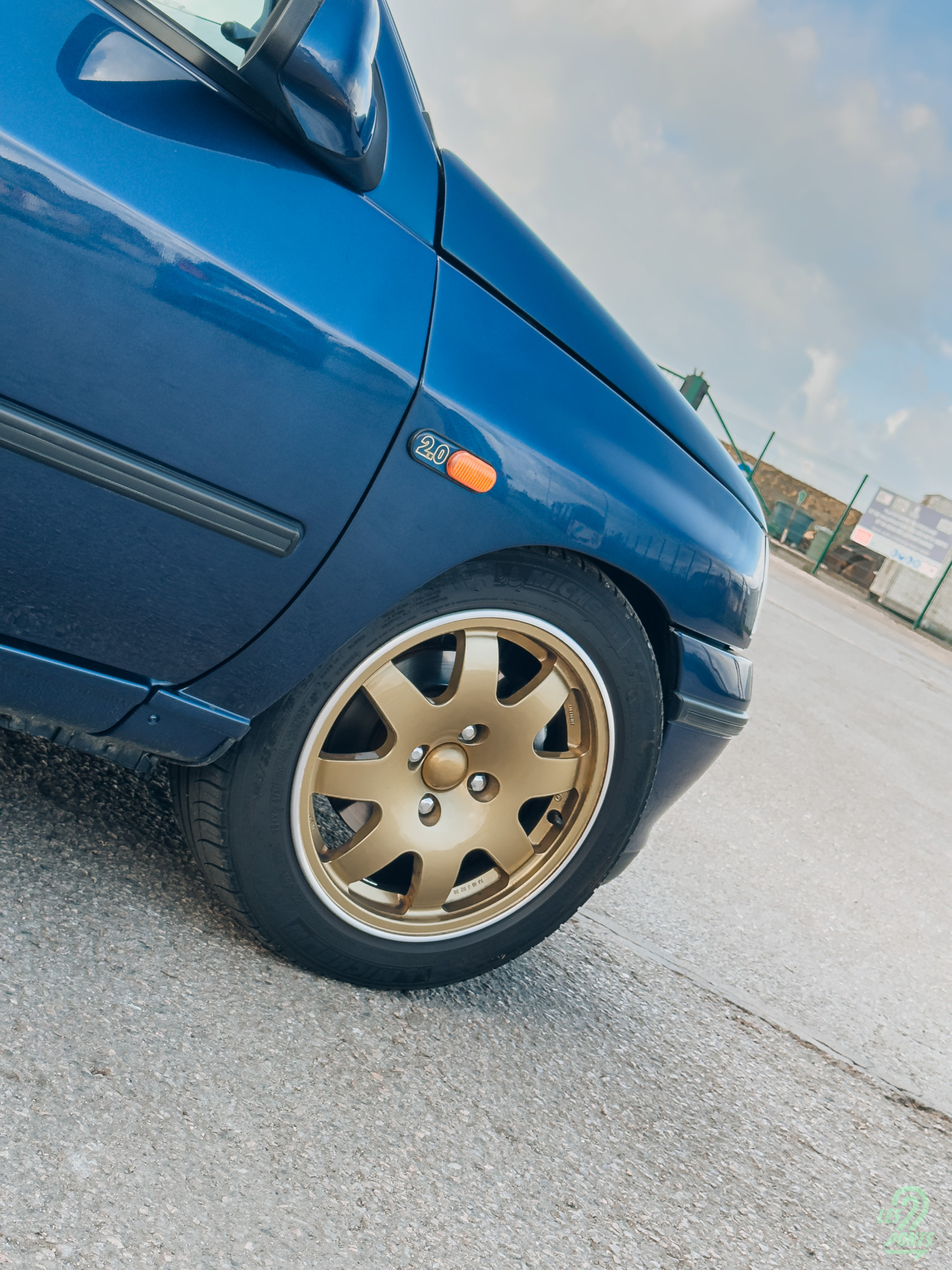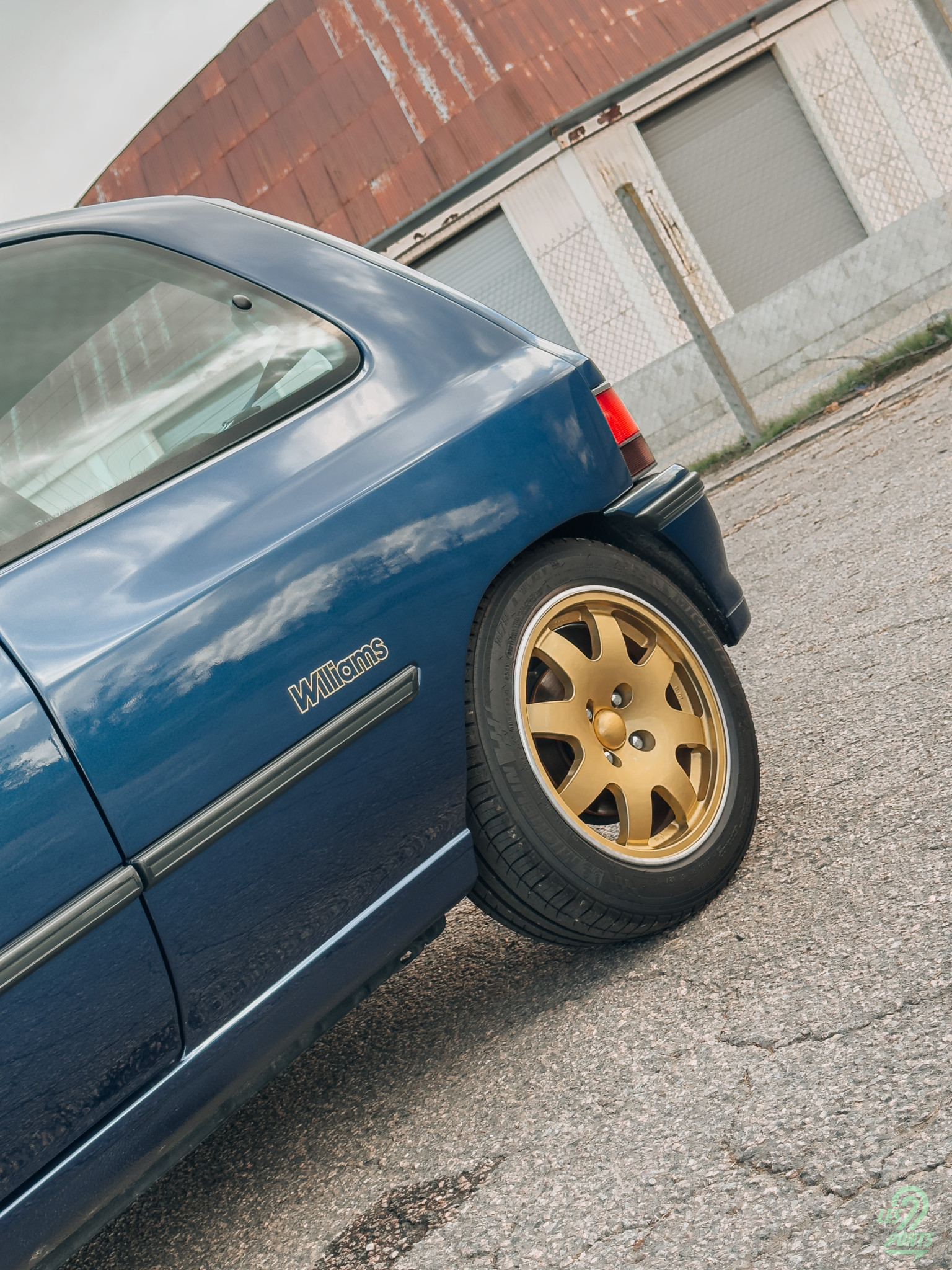 Alors que je m’approche de la voiture, mes yeux sont immédiatement attirés par cette teinte bleu profond nacré, le célèbre Bleu Sport, qui lui donne profondeur, nuances et élégance. Les jantes Speedline dorées de 15 pouces à bord argenté captent également mon attention. Elles font ressortir sa musculature naturelle tout en apportant une note sportive. Leur finition brillante contraste magnifiquement avec le bleu de la carrosserie, clin d’œil aux livrées des monoplaces ainsi qu’au logo Williams de l’époque, avec un W bi-colore en bleu et or.