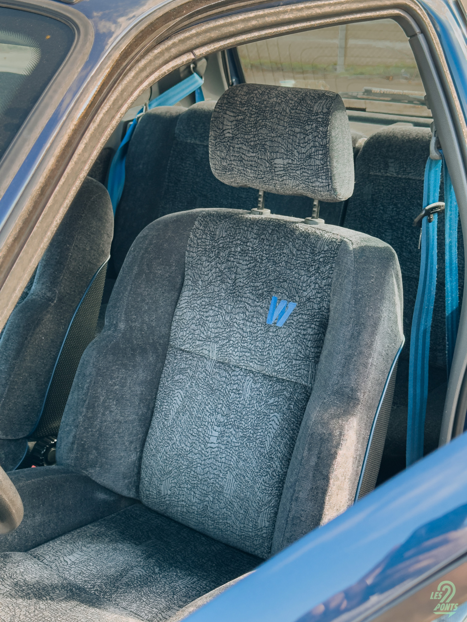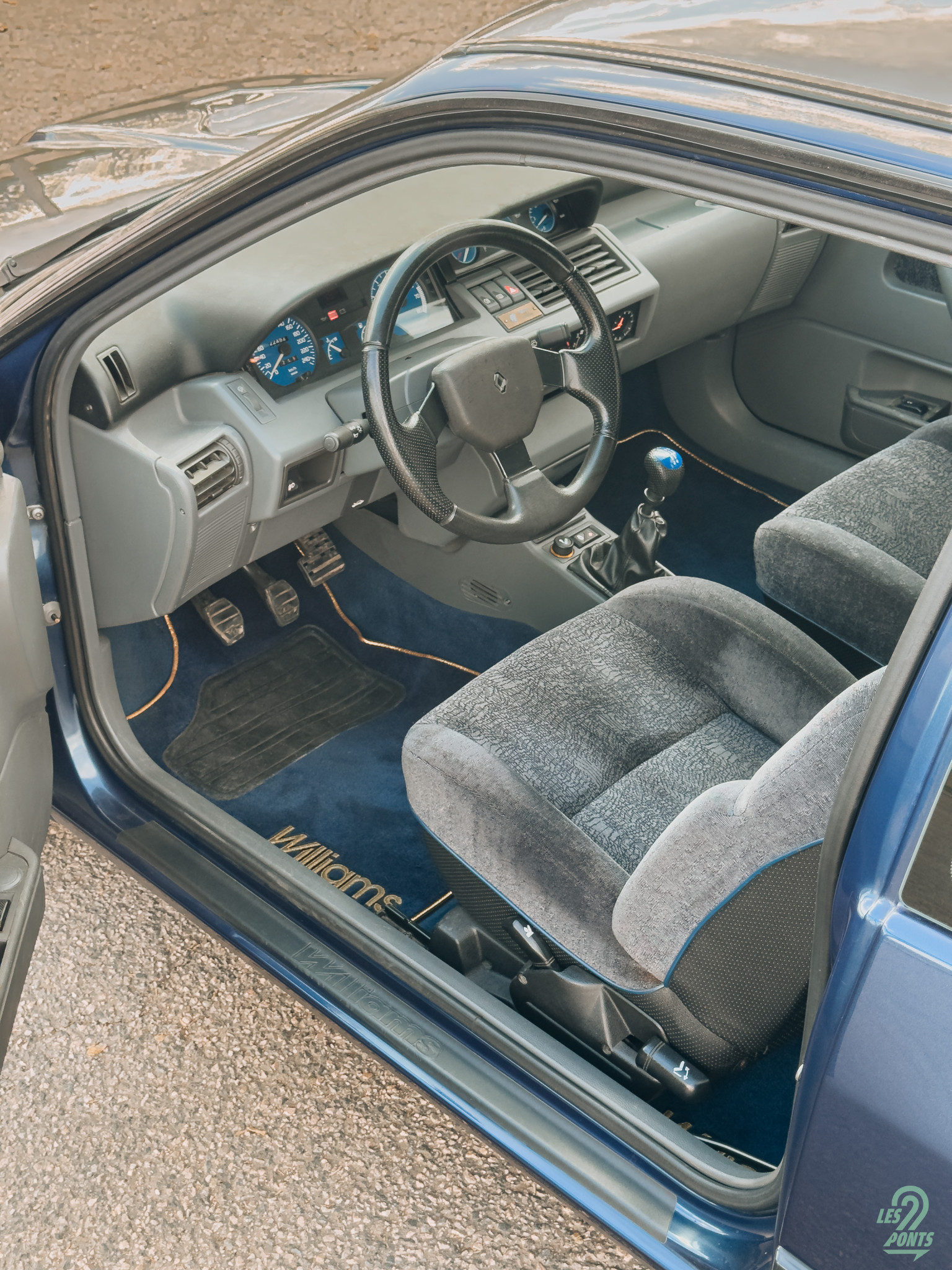 Après un tour complet de l’extérieur, passons dans l’habitacle. Dès que j’ouvre la porte, une légère odeur d’essence et de plastique vieilli me saisit. Un parfum authentique d’une youngtimer. Le logo Williams est présent sur le seuil de porte, il peut être perçu comme une invitation au pilotage. Je m’installe derrière le volant, et instantanément, je me téléporte en 1993, comme si je venais d’acquérir le modèle vu l’état clinique de l’intérieur. Bon, soyons honnêtes, il est impossible de parler d’originalité ici. Les plastiques noirs ne contrastent qu’avec les plastiques gris. Toutefois, des touches de bleu apparaissent sur le dossier des sièges, les ceintures de sécurité, les fonds de compteurs et de jauges, pommeau de levier de vitesses, tout comme sur les tapis. En plus de rendre identifiable le modèle, ça vient aussi rendre plus joyeux cet intérieur austère. Un atout de taille vient s’ajouter avec les sièges baquets en velours, empruntés à la R19 16S, ornés du célèbre “W” brodé. Cette fois, l’exclusivité tant attendue est bel et bien au rendez-vous. De plus, ces sièges offrent des réglages en hauteur et au niveau lombaire pour un confort optimal.