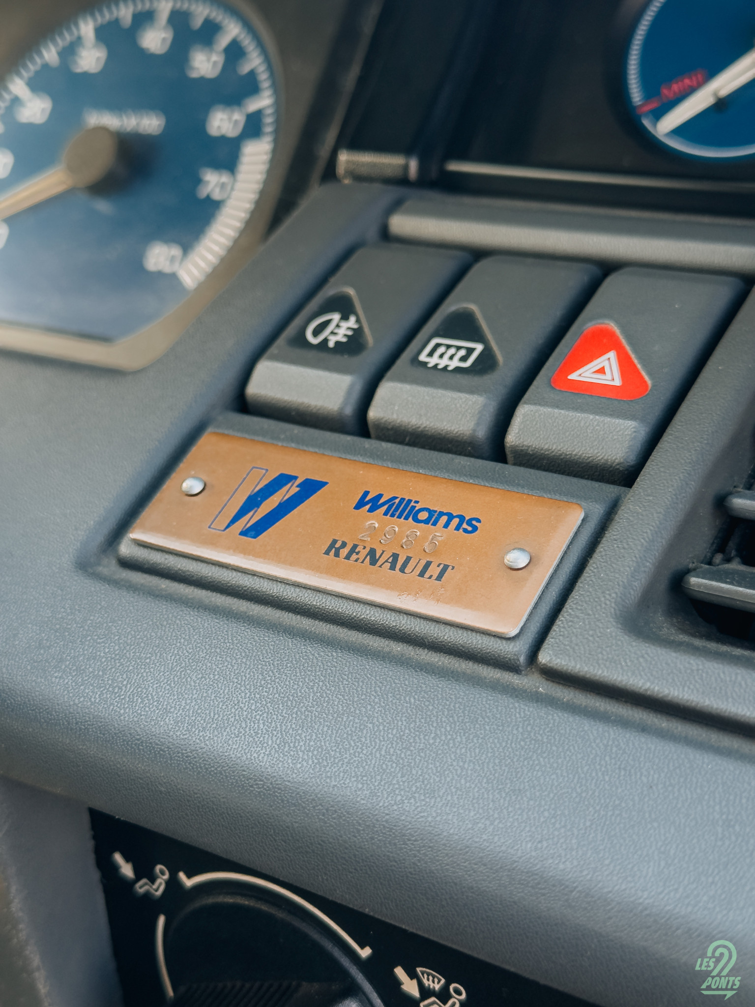 Pour la planche de bord, elle reprend trait pour trait celle de la version de base avec un design qui mélange les lignes angulaires et des lignes arrondies sans être dans le bio-design. La seule différence, une casquette élargie qui reçoit une instrumentation plus complète avec 3 manomètres supplémentaires : niveau, température et pression d’huile. En dessous des trois commandes supérieures et des buses de ventilation, on trouve la petite plaque de laiton rivetée qui porte fièrement le numéro 2985, poinçonnée entre les logos Williams et Renault. La partie centrale se compose des commandes de ventilation et de chauffage ainsi que d’une petite horloge. En dessous, on a un cache qui pivote vers le haut pour avoir accès à l’autoradio K7. Au-dessus de l’emplacement du levier de vitesse, on trouve la commande de centralisation des portes, l’allume-cigare et le cendrier. L’équipement de série est assez complet, comprenant, en plus des éléments déjà mentionnés, des vitres électriques, la fermeture centralisée et une direction assistée. Le dernier point, le volant sport à trois branches en cuir, très joli avec une bonne prise en main. Il me reste plus qu’à insérer la petite clef dans le neiman, position contact, et je démarre.