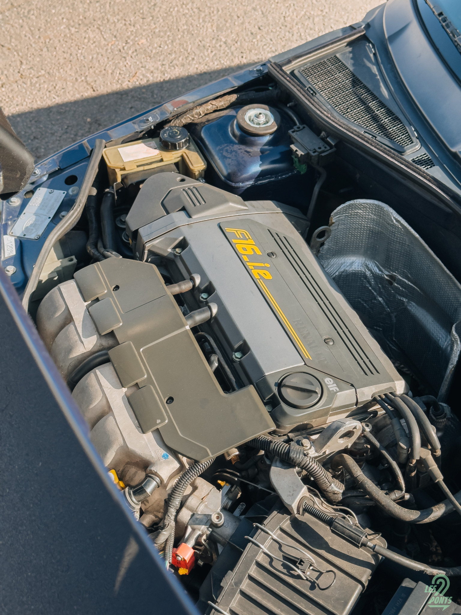 Découvrons ce qui se cache sous le capot. Pour l’ouvrir, je commence par actionner la tirette située sous le tableau de bord. Ensuite, comme sur les anciennes BMW, je le saisis par le haut, au niveau de la baie de pare-brise, et je le soulève. On découvre un moteur volumineux, avec un cache gris et noir, estampillé F16.ie en jaune. Le véritable atout de ce moteur réside dans ses performances, développant 150 ch à 6 100 tr/min et un couple de 179 Nm à 4 500 tr/min pour un poids total de 990 kg. Baptisé F7R, il est issu du F7P de 140 ch, présent sous le capot de la Clio 16S. Pour gagner en puissance, sa course a été allongée et l’alésage revu, nécessitant un renforcement du vilebrequin qui, pour l’anecdote, est emprunté à la Clio diesel, ainsi que des modifications sur les pistons, bielles et arbre à cames. Des soupapes de plus grand diamètre ont été installées, accompagnées d’un échappement allégé spécifique. Le moteur justifie sa filiation avec la F1 grâce à sa culasse trempée et résinée. Si ces caractéristiques peuvent sembler modestes aujourd’hui, elles étaient impressionnantes à l’époque.