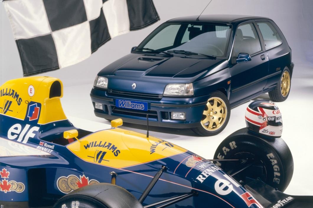 La monoplace Williams-Renault FW14B/08 avec laquelle Nigel Mansell conquit le titre de champion du monde des pilotes et constructeur de Formule 1 en 1992 et la Clio Williams sortie en 1993.