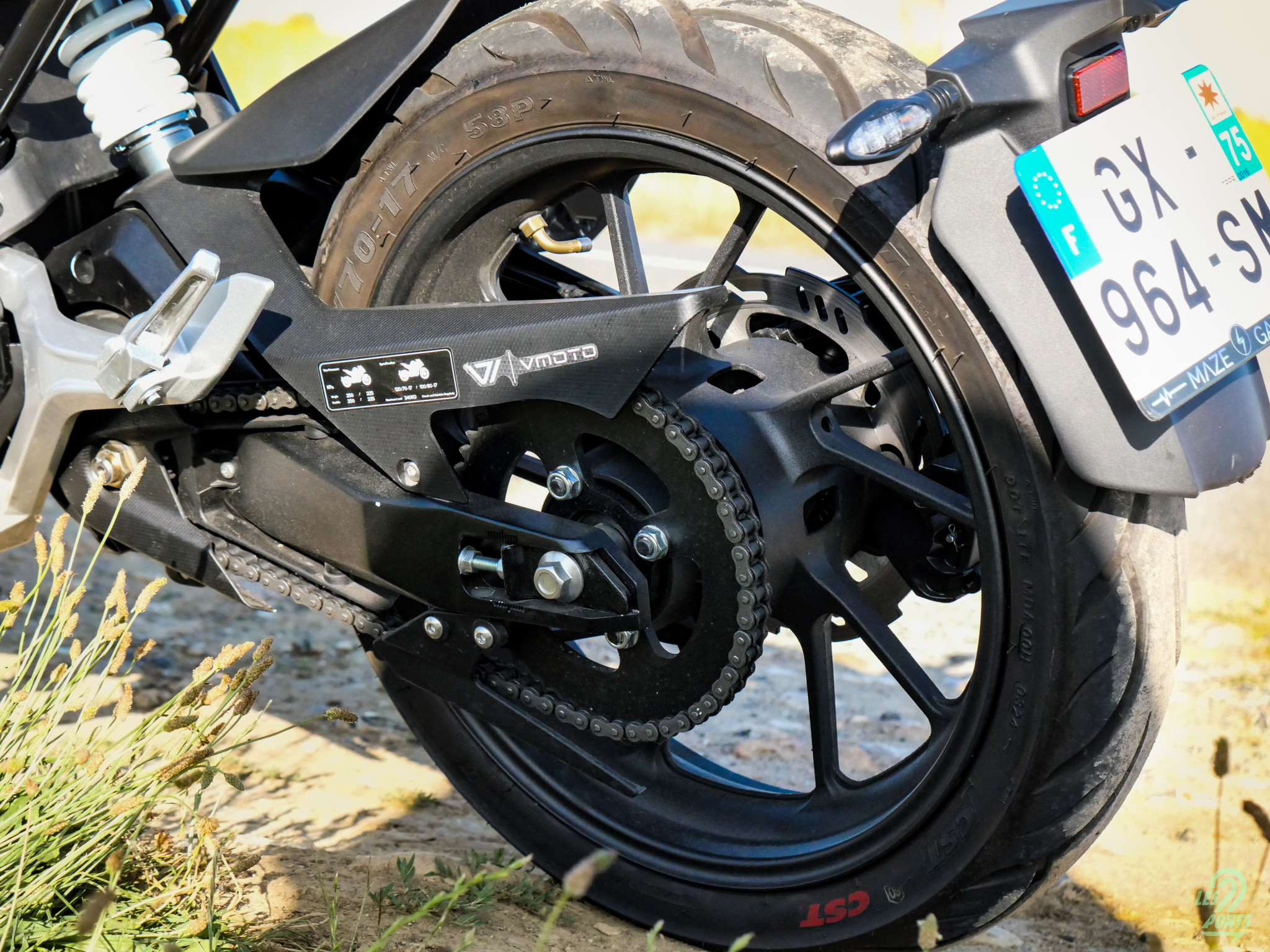 Les plus attentifs reprocheront également la présence d’une transmission par chaîne, bien qu’on ne l’entende franchement pas souvent, au contraire d’autres bruits parasites propres à l’électrique. Ainsi, les plaquettes avant de notre modèle d’essai frottent à chaque décélération : peut-être le symbole d’un disque légèrement voilé. Cela peut finir par être gênant. Notre meilleur conseil ? Réaccélérer ! La VMoto Stash se laisse manier avec facilité. Il ne faudra cependant pas trop la pencher, au risque de rapidement faire frotter les cale-pieds. Une fois encore, on reste sur une moto assurément urbaine. Mais l’amusement est indéniable. Nous n’avons pas eu l’occasion de la tester sous la pluie. L’ABS et l’antipatinage devraient faire l’affaire mais le couple immédiat n’invite pas à la folie sur routes humides. Par curiosité, nous avons mis la Stash sur des chemins rocailleux. Son apparence proche d’un roadster n’a pas suffi à limiter le guidonnage. Pas grave : retour en ville.