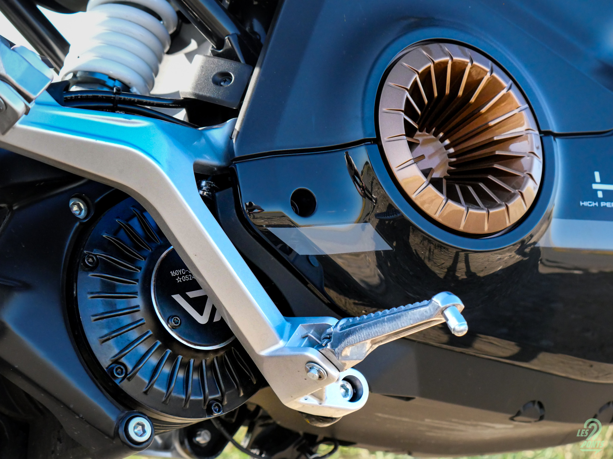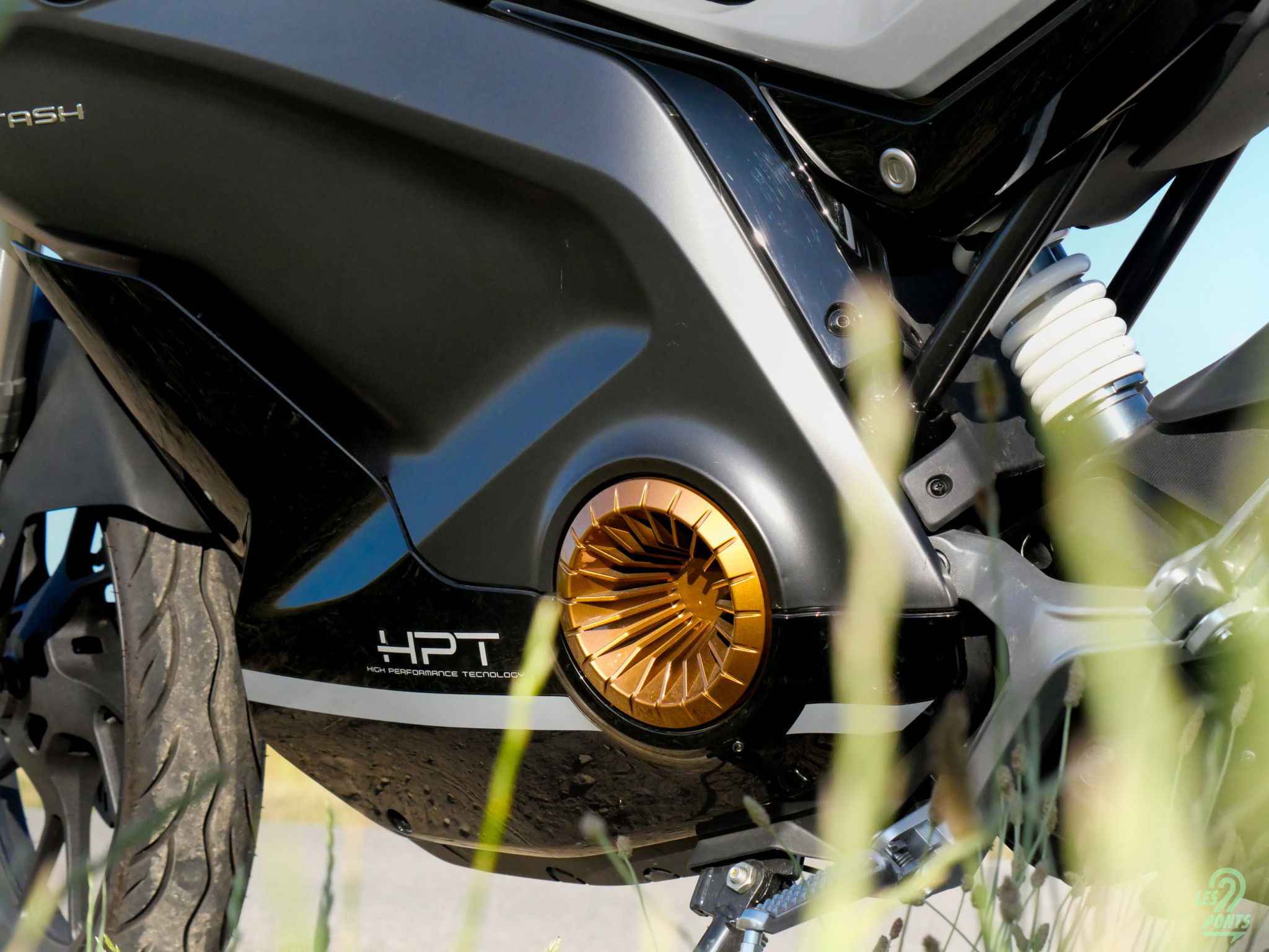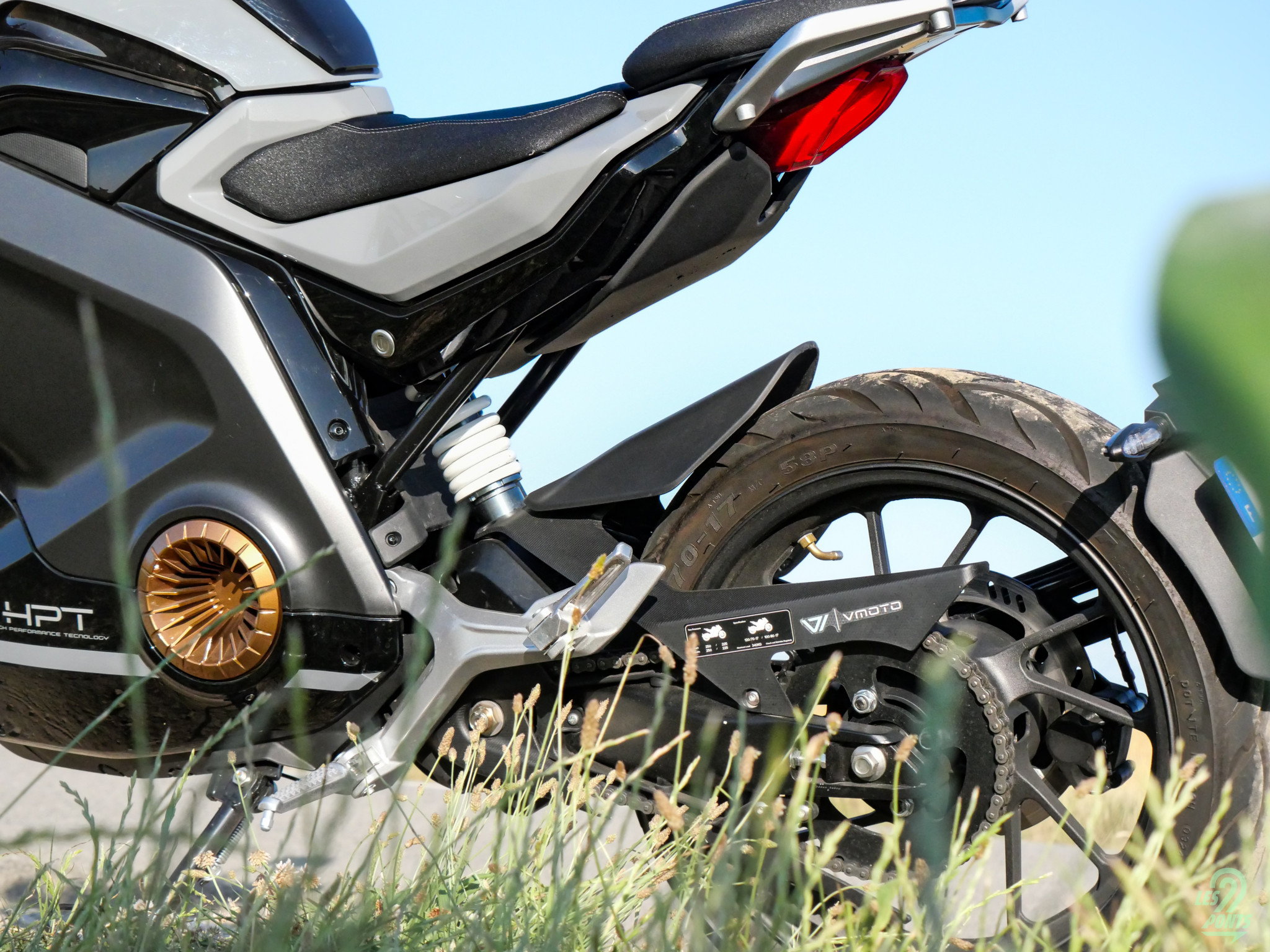 Notre moto électrique, équivalent 125cc et donc accessible avec un permis B si la formation obligatoire de sept heures a bien été effectuée, a de la gueule ! Elle a été dessinée par le studio italien C-Creative. Chez VMoto, l’apparence est particulièrement travaillée. Le secret de polichinelle veut que la version de série du (futur) maxi-scooter APD soit d’ailleurs dessinée par Pininfarina. Concernant la Stash, elle reprend tout d’abord les fausses prises d’air typiques de Super Soco sur ses parties inférieures. De couleur bronze peu importe la livrée de la moto, ces rappels apportent le style sportif revendiqué par la marque. Fourche hydraulique inversée pour l’avant, mono-amortisseur réglable à l’arrière, disques de frein percés et étrier radial à l’avant, la Stash n’est pas avare d’équipements pour la partie cycle. Elle a tout d’une grande.