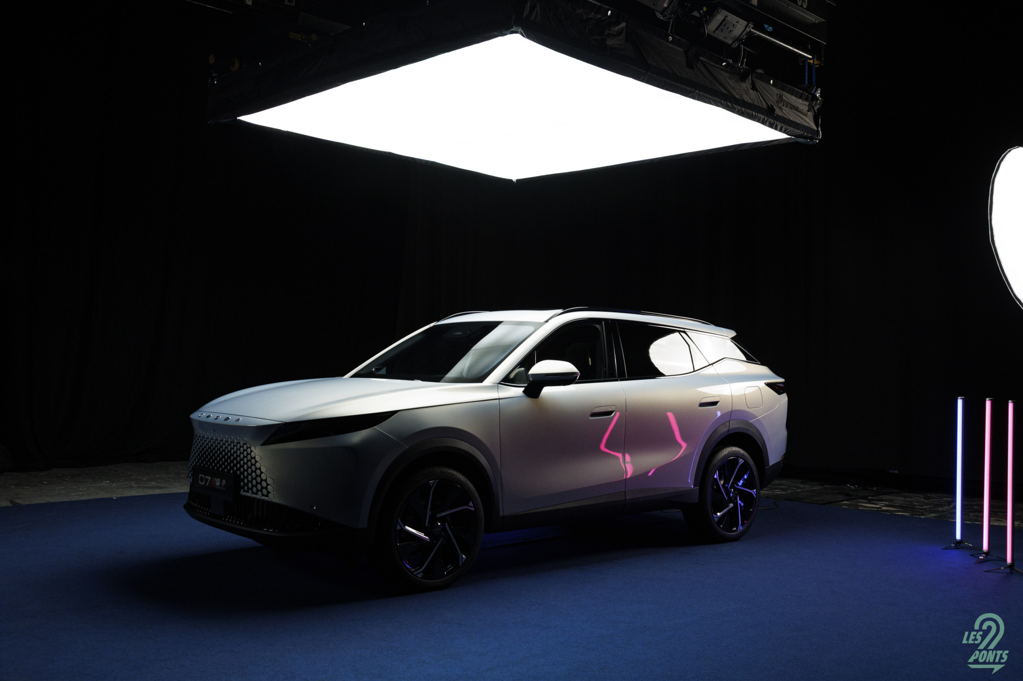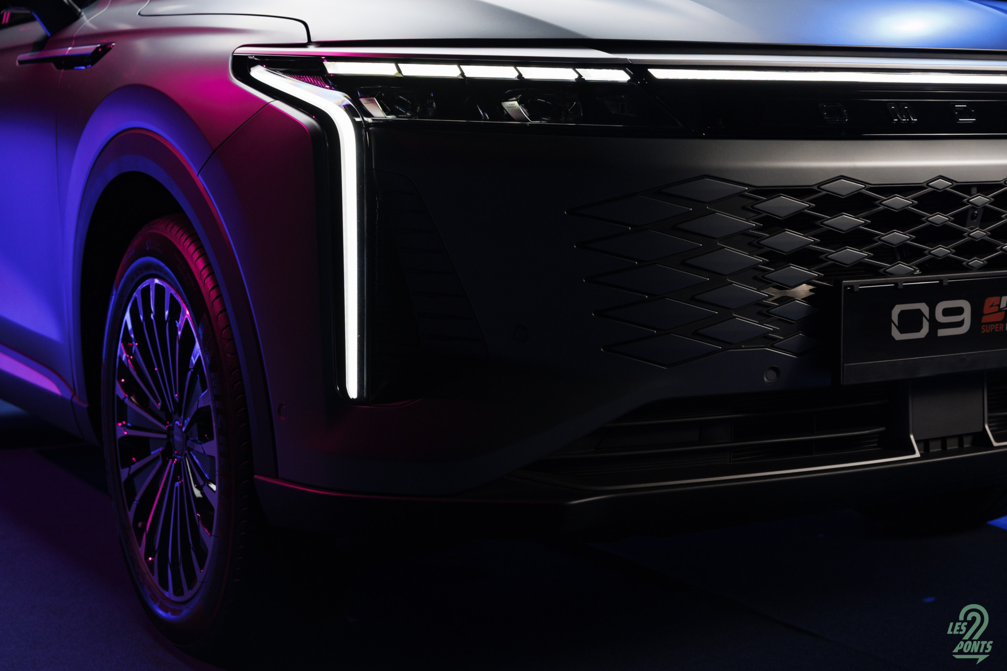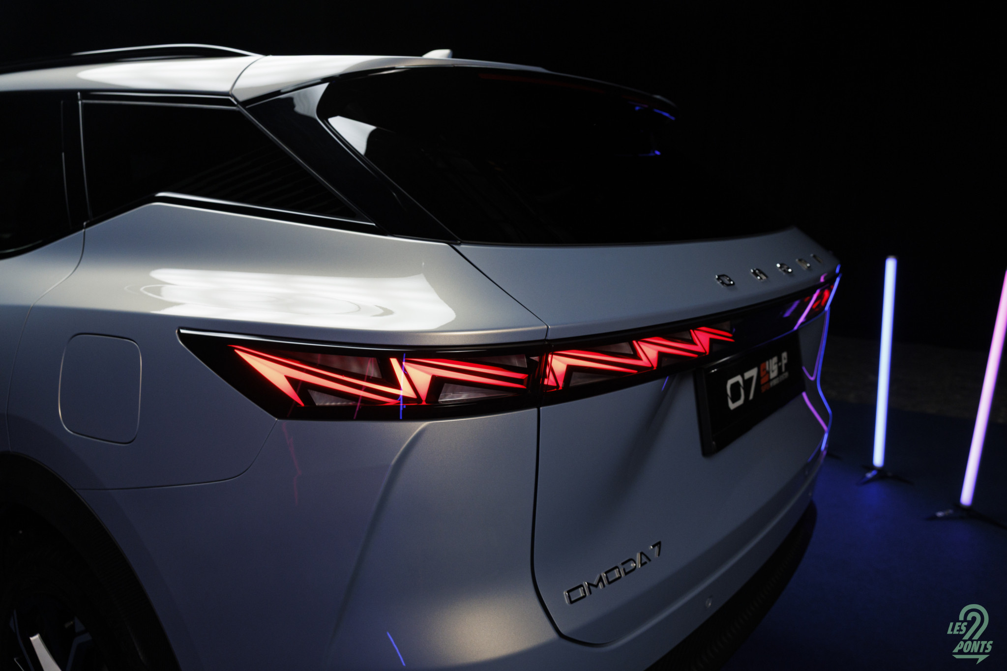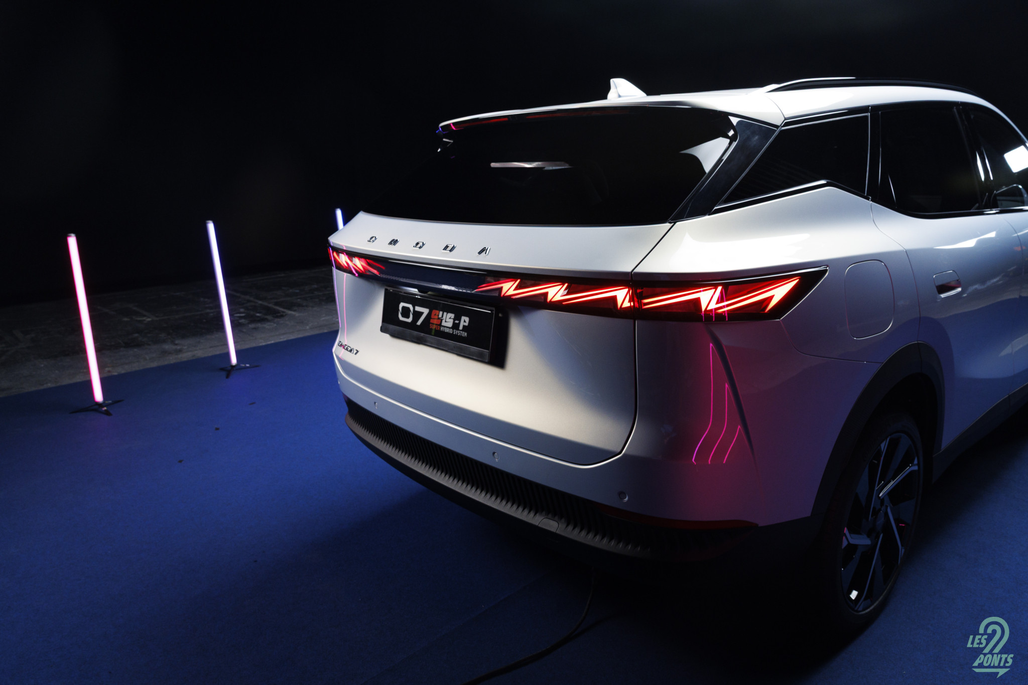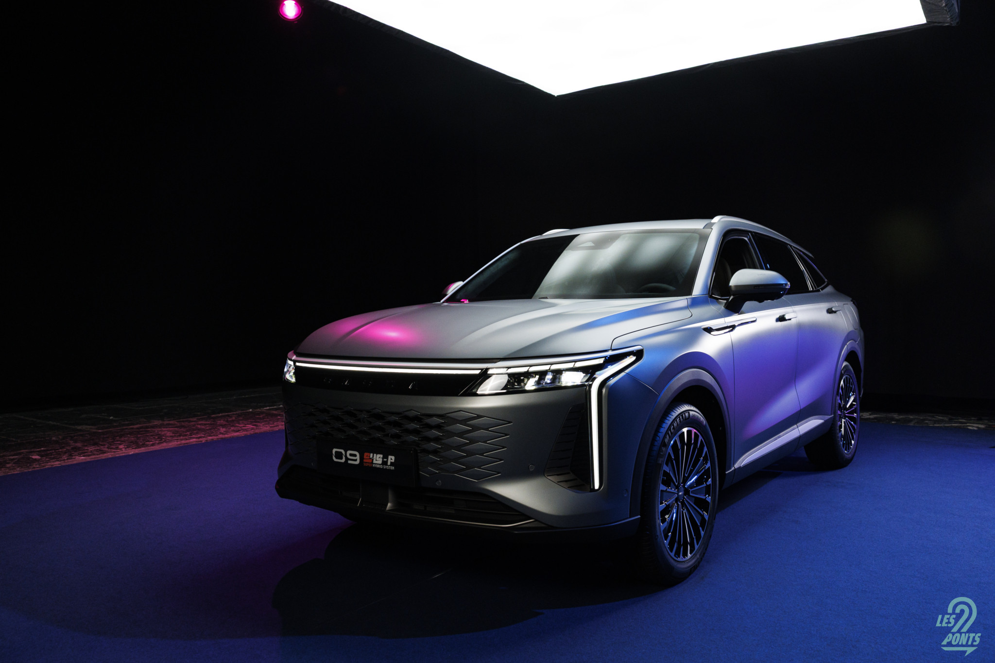 Voici mon petit favori ! Avec l’âge, on prend des goûts de luxe … Peut-être que les éclairages multiples, leds de couleur, projecteurs, agrémentant cette séance photo, le mettait spécialement en valeur, aussi ! L’auto développe donc 4,77 m et forme l’actuel haut de gamme d’Omoda & Jaecoo. On le disait, l’extérieur s’inspire de quelques jolies références européennes, le volume est équilibré. Voici une auto véritablement valorisante, avec des jantes classiques, mais ne cédant pas à la fameuse mode des jantes noires … une bonne chose ! La signature leds à l’avant s’inspire quelque peu des français, DS au départ, puis Peugeot et Renault et leur partage de designer en la personne de Gilles Vidal. La première impression extérieure semble donc positive.