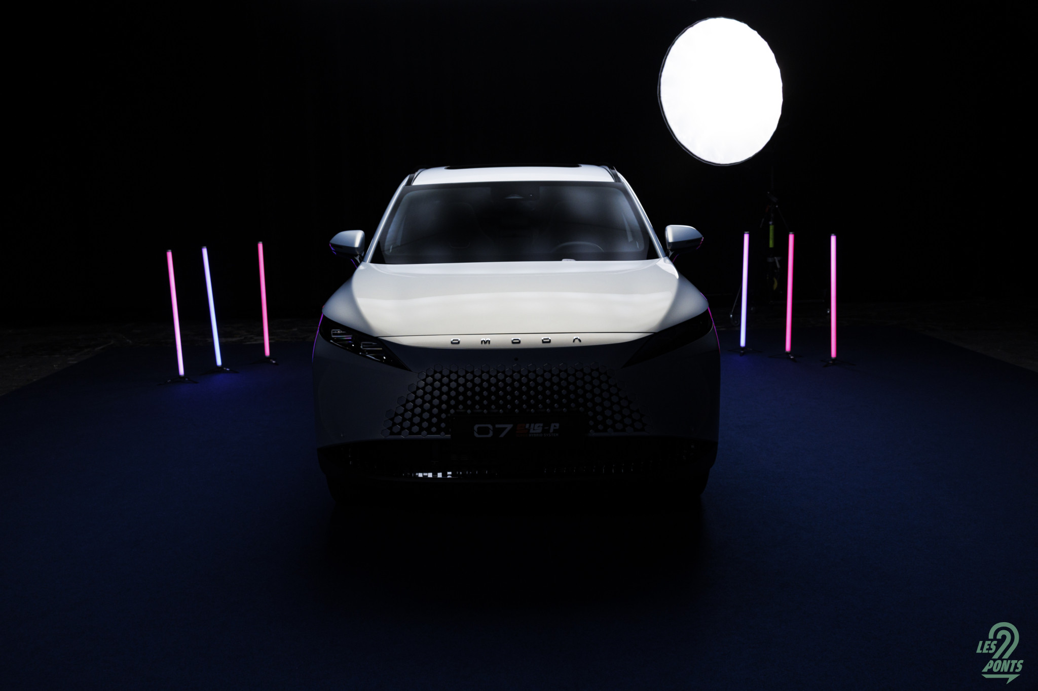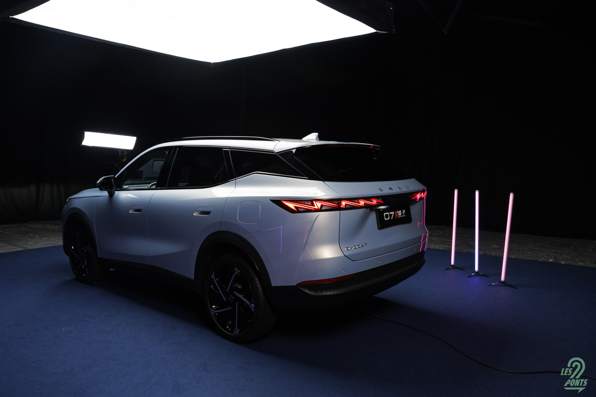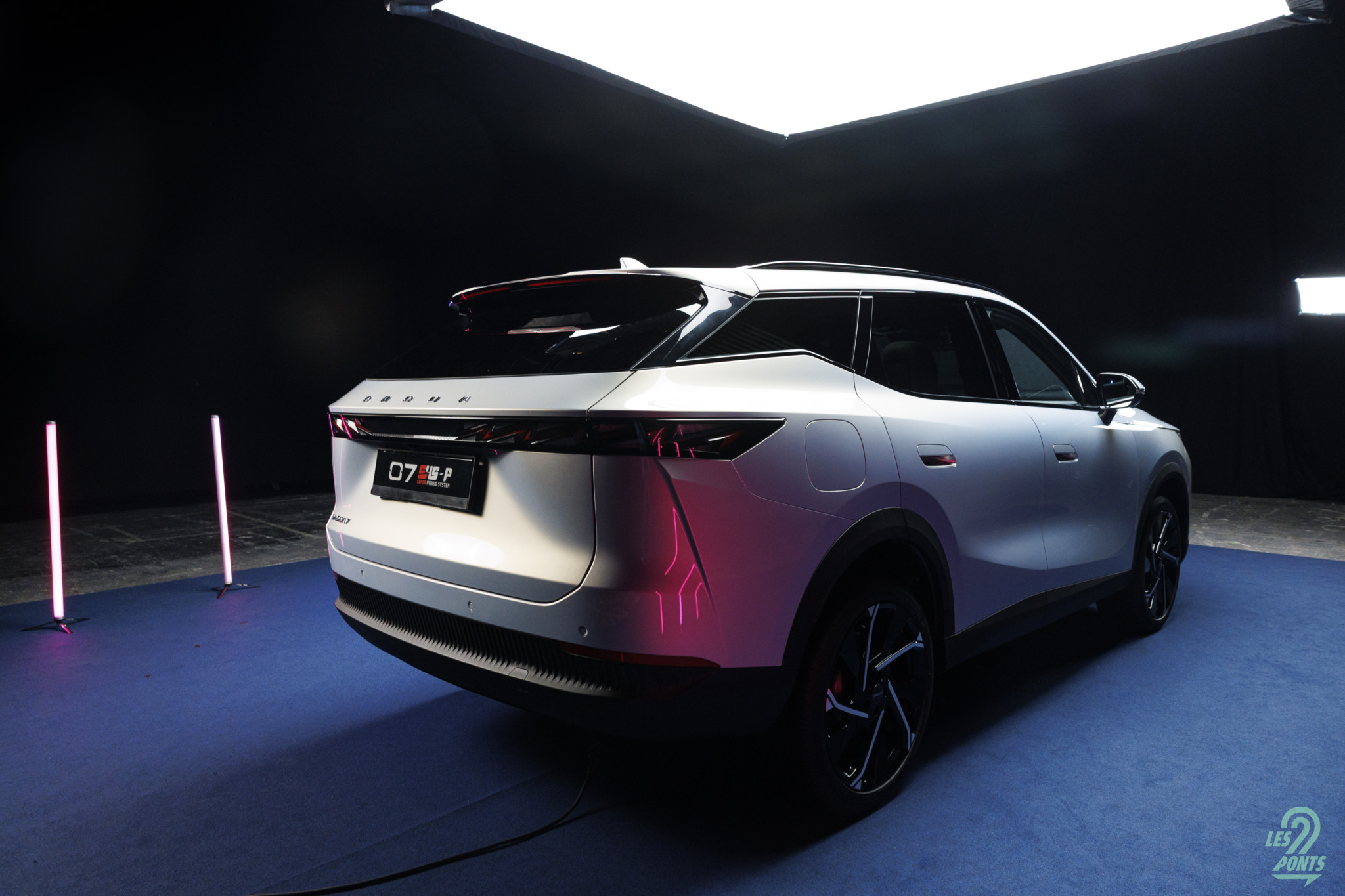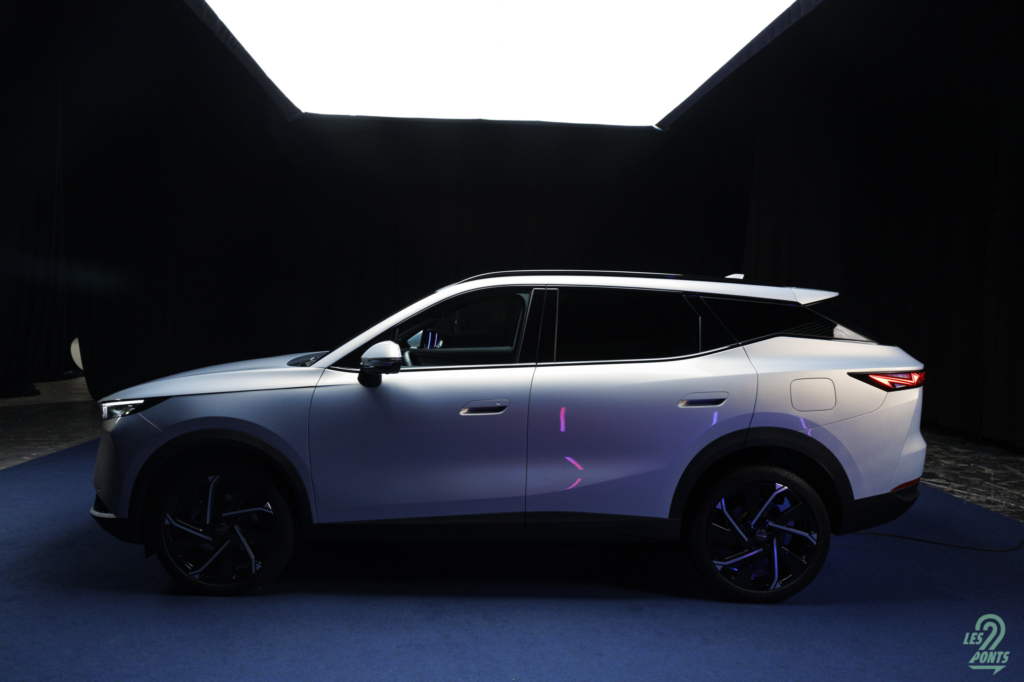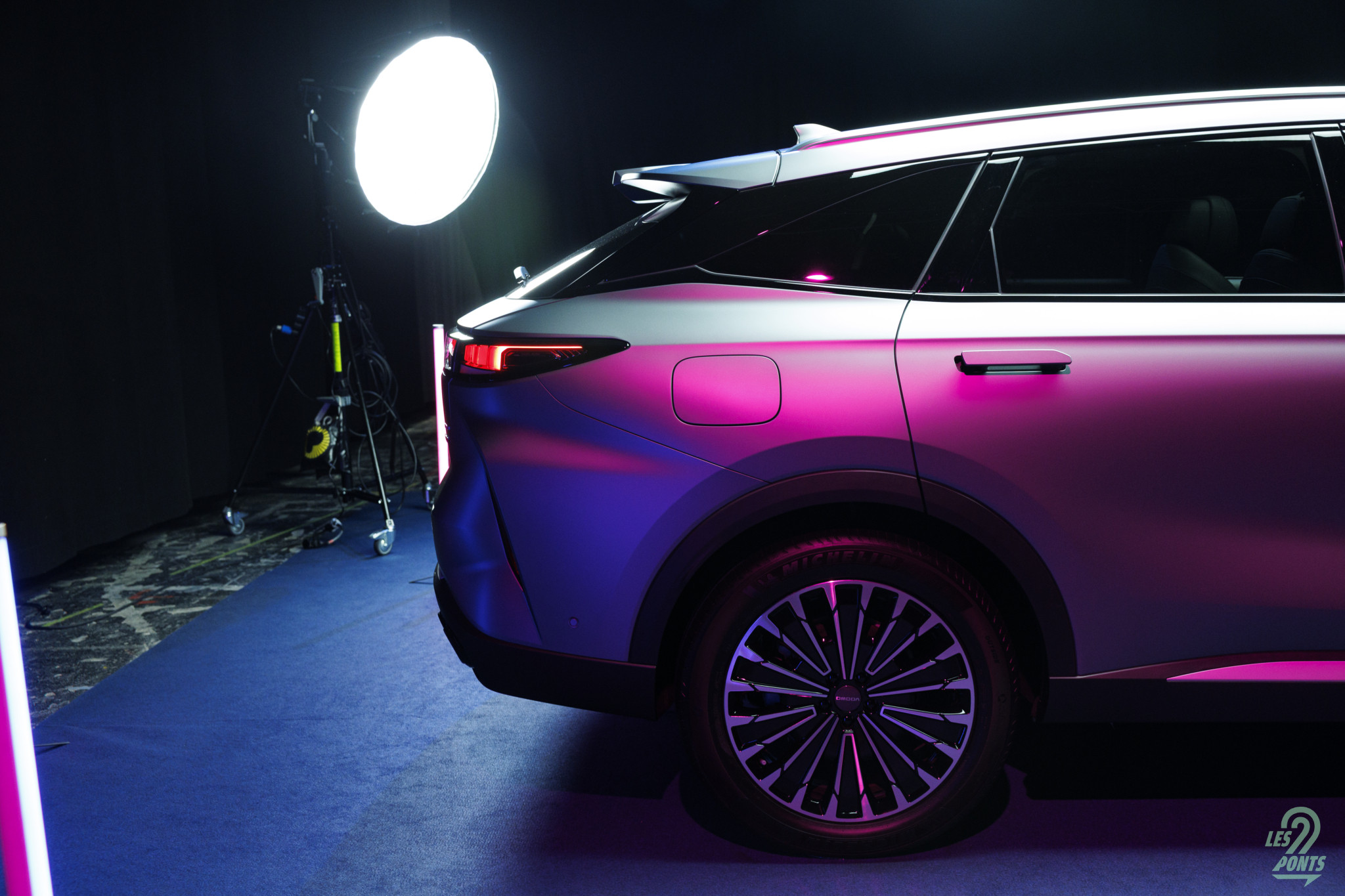 Voici mon petit favori ! Avec l’âge, on prend des goûts de luxe … Peut-être que les éclairages multiples, leds de couleur, projecteurs, agrémentant cette séance photo, le mettait spécialement en valeur, aussi ! L’auto développe donc 4,77 m et forme l’actuel haut de gamme d’Omoda & Jaecoo. On le disait, l’extérieur s’inspire de quelques jolies références européennes, le volume est équilibré. Voici une auto véritablement valorisante, avec des jantes classiques, mais ne cédant pas à la fameuse mode des jantes noires … une bonne chose ! La signature leds à l’avant s’inspire quelque peu des français, DS au départ, puis Peugeot et Renault et leur partage de designer en la personne de Gilles Vidal. La première impression extérieure semble donc positive.