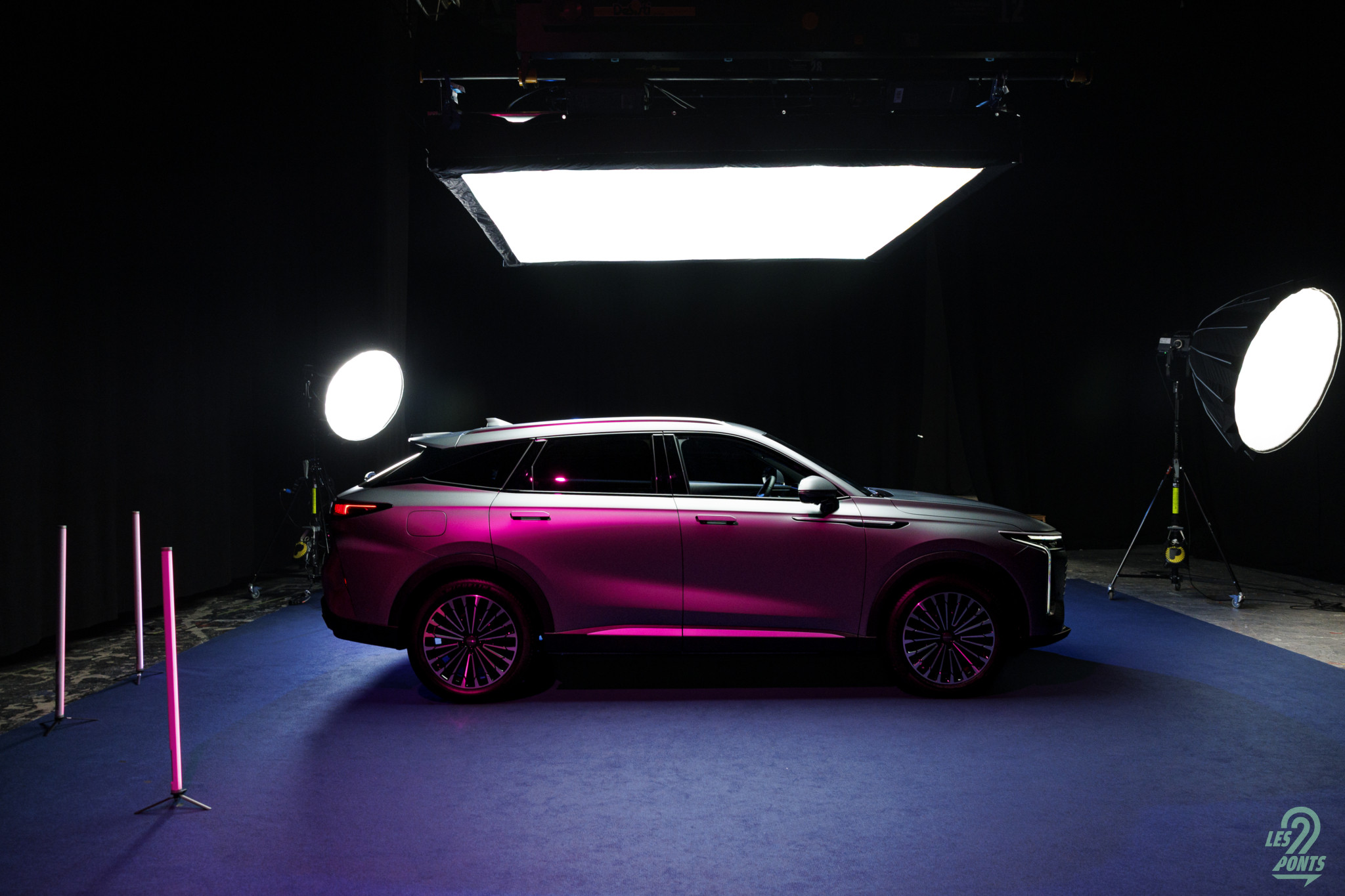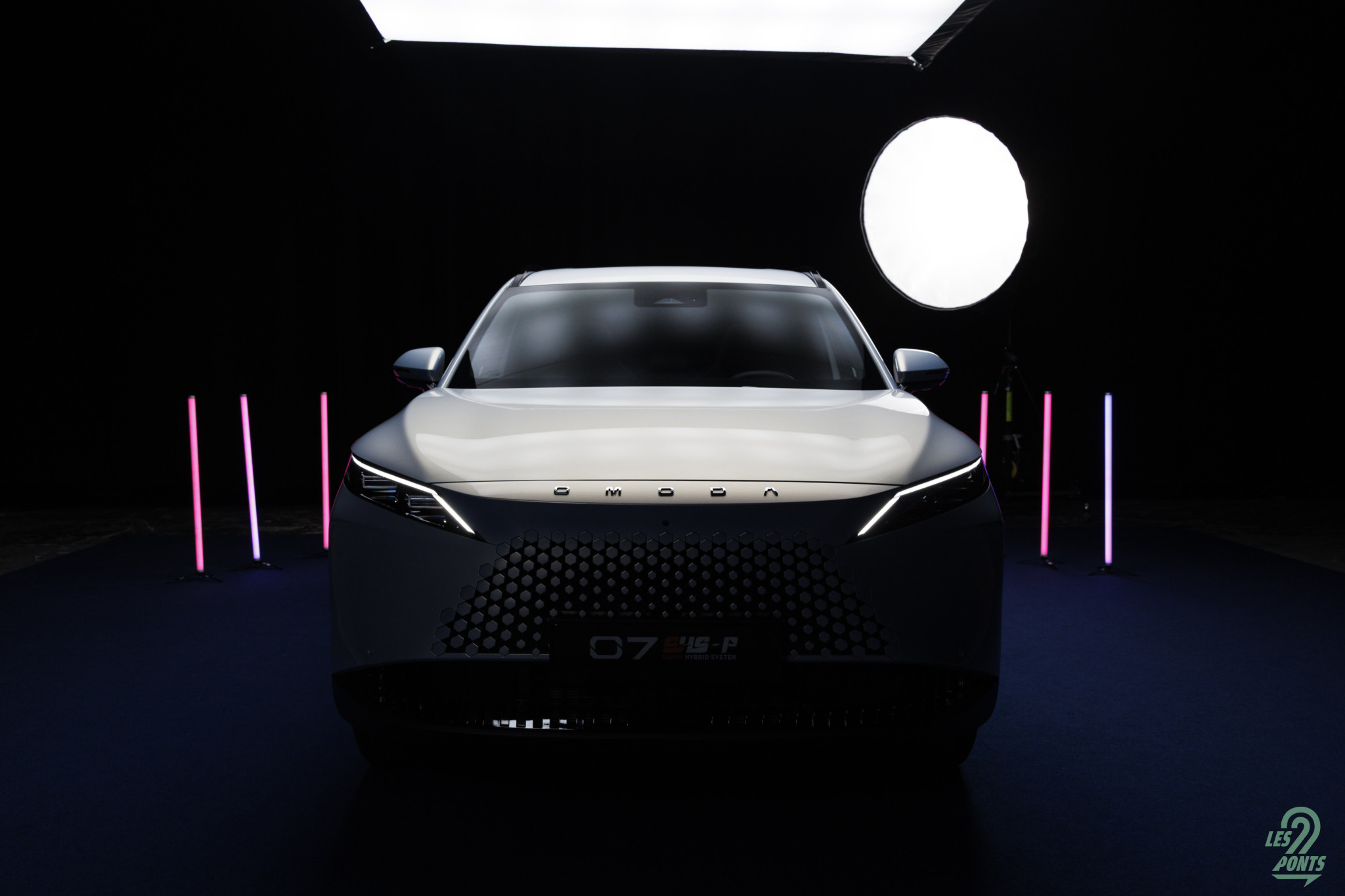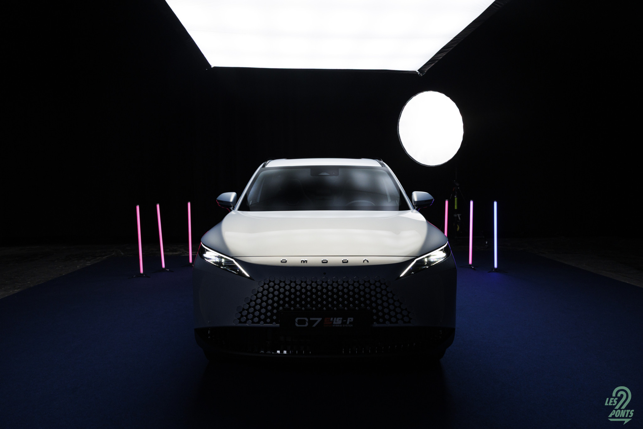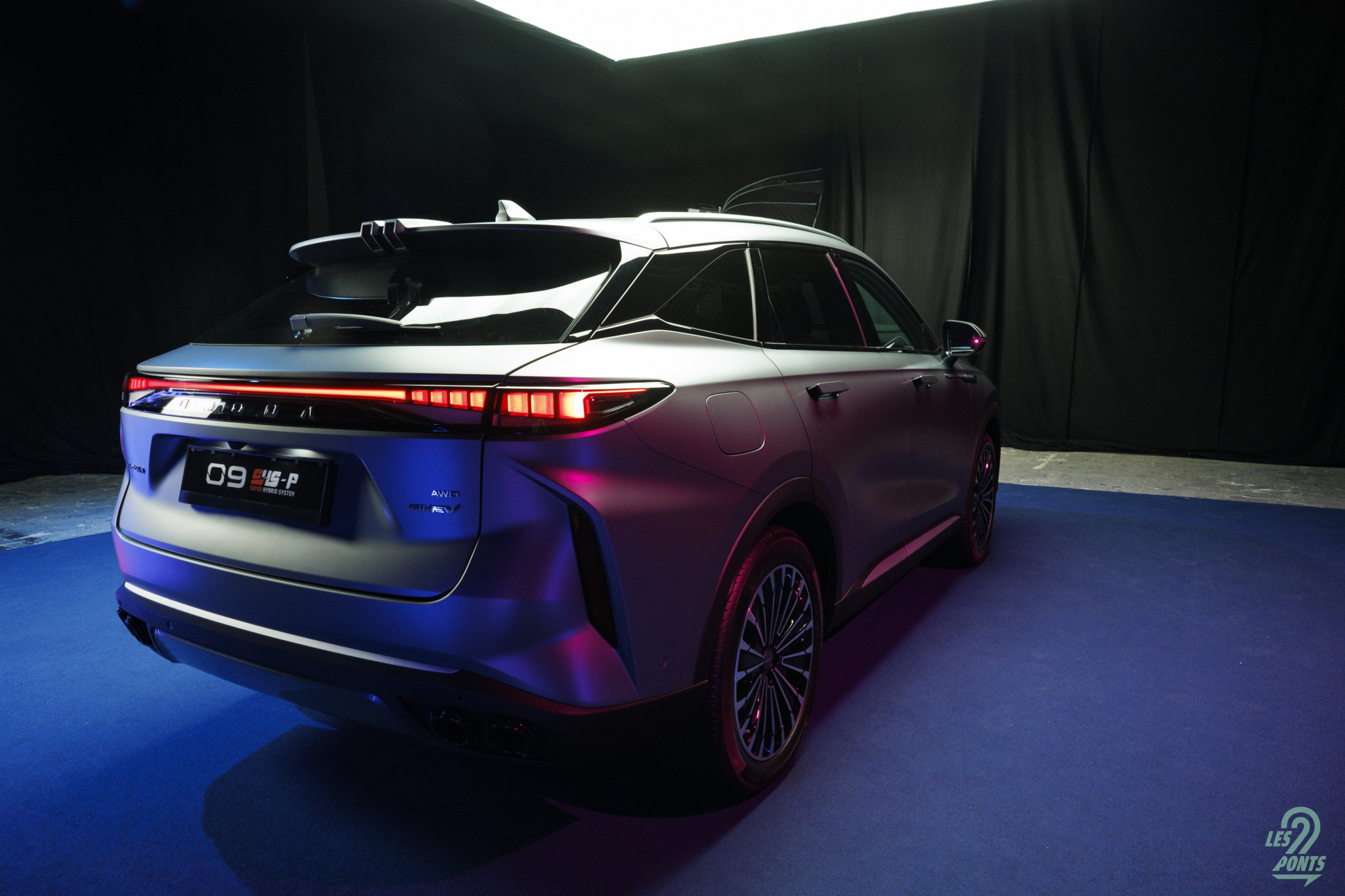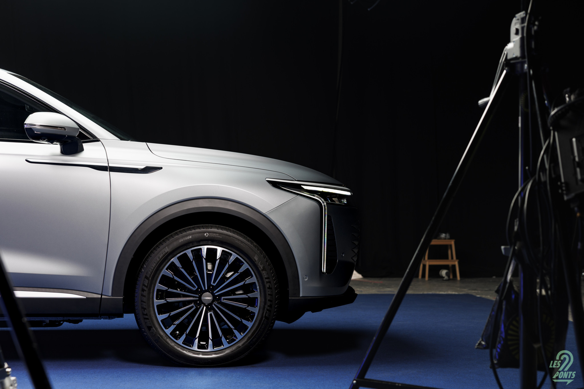 Voici mon petit favori ! Avec l’âge, on prend des goûts de luxe … Peut-être que les éclairages multiples, leds de couleur, projecteurs, agrémentant cette séance photo, le mettait spécialement en valeur, aussi ! L’auto développe donc 4,77 m et forme l’actuel haut de gamme d’Omoda & Jaecoo. On le disait, l’extérieur s’inspire de quelques jolies références européennes, le volume est équilibré. Voici une auto véritablement valorisante, avec des jantes classiques, mais ne cédant pas à la fameuse mode des jantes noires … une bonne chose ! La signature leds à l’avant s’inspire quelque peu des français, DS au départ, puis Peugeot et Renault et leur partage de designer en la personne de Gilles Vidal. La première impression extérieure semble donc positive.