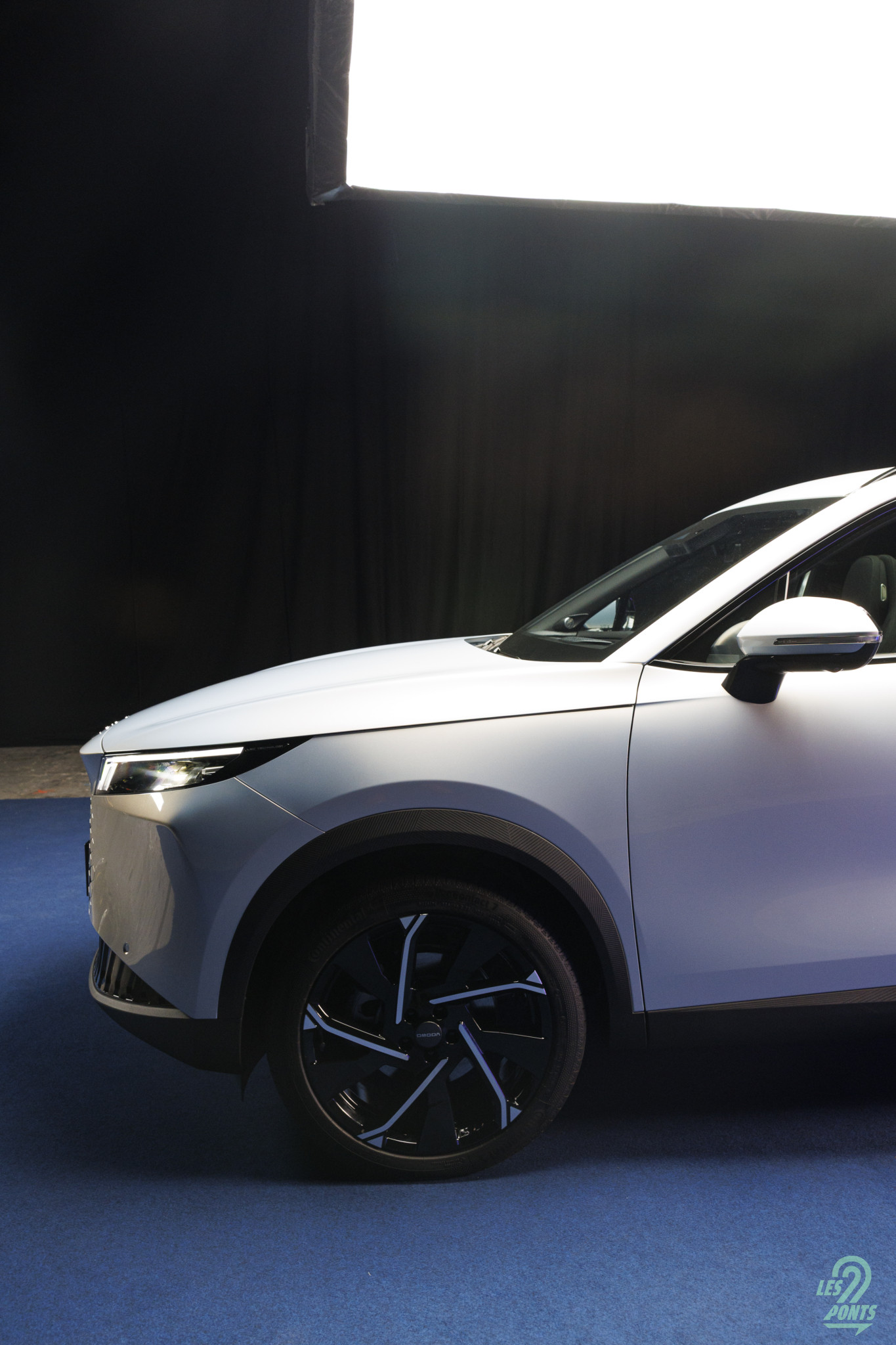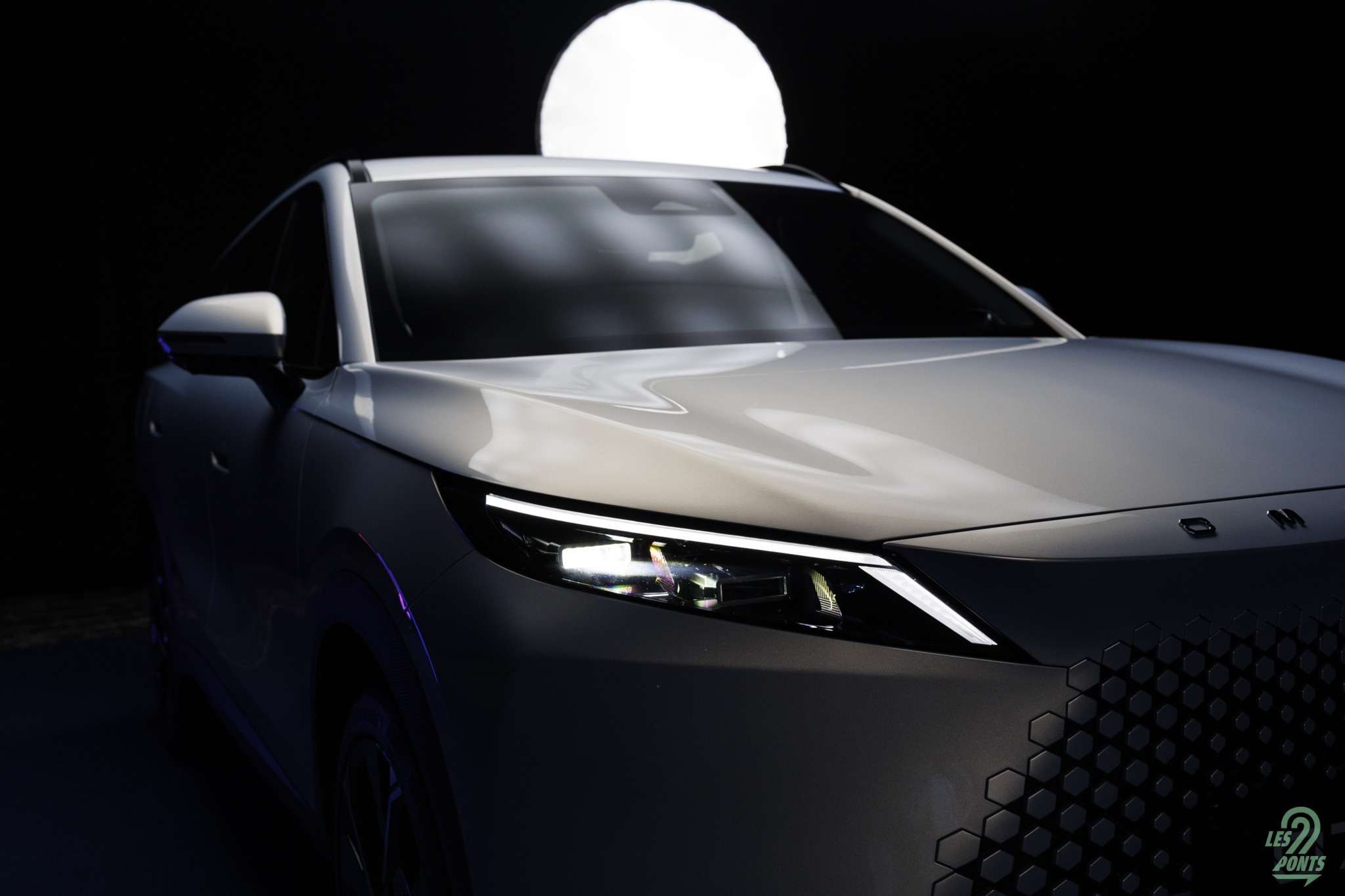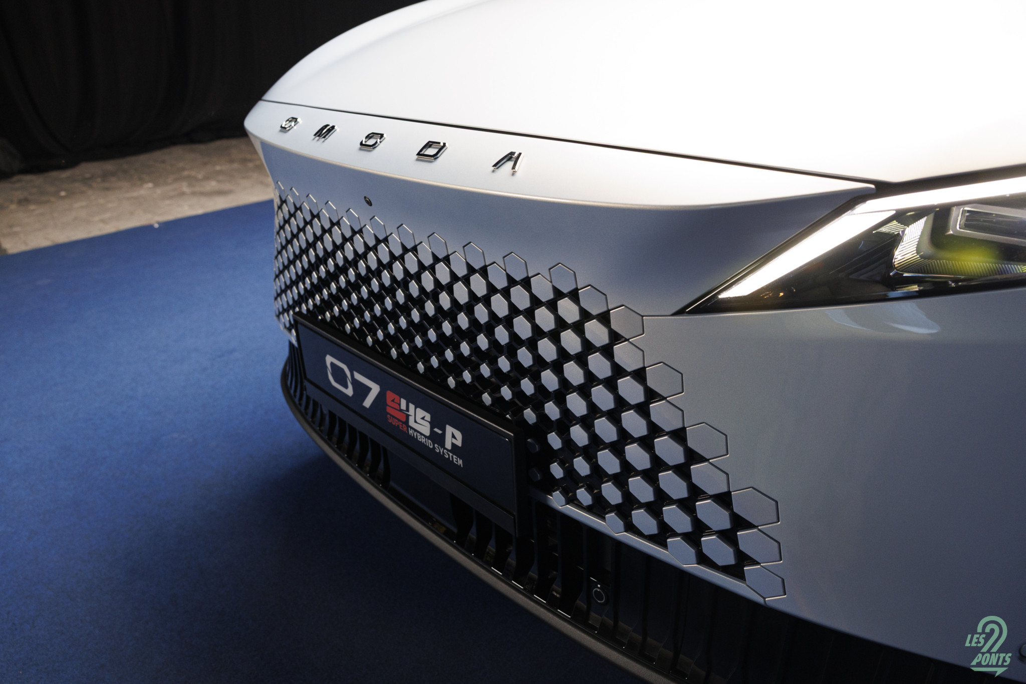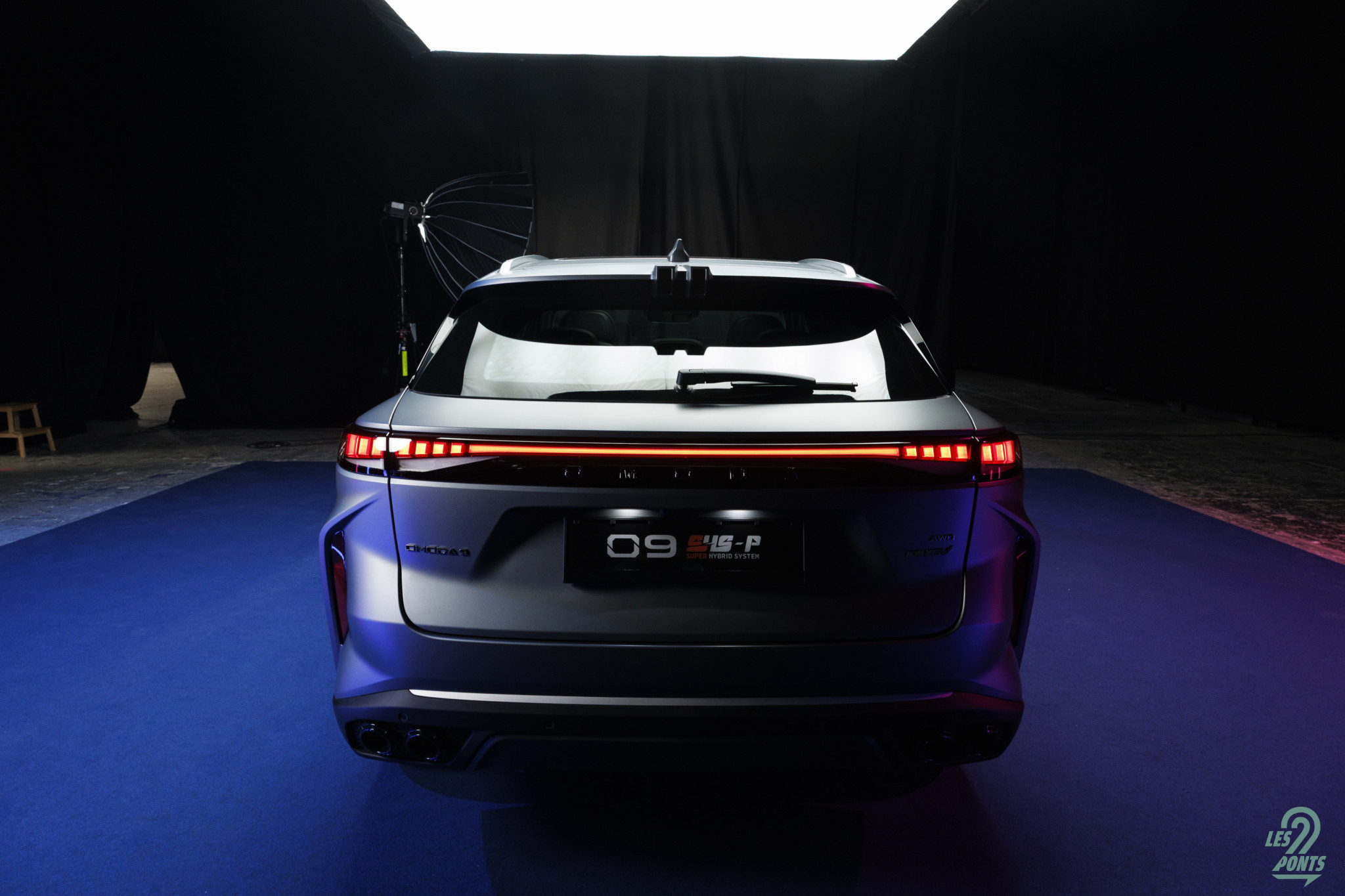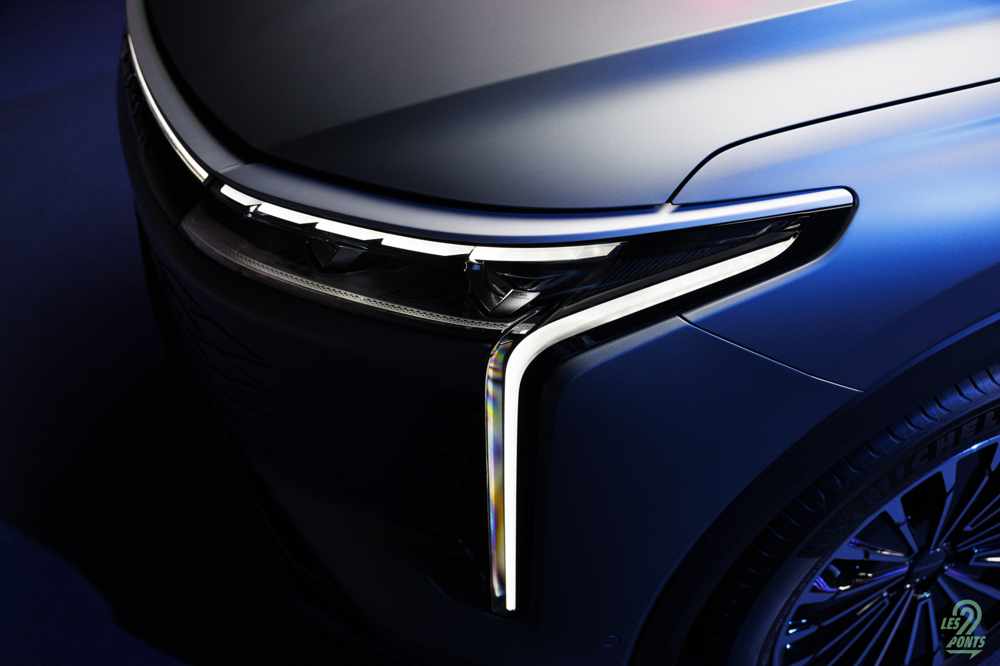 Voici mon petit favori ! Avec l’âge, on prend des goûts de luxe … Peut-être que les éclairages multiples, leds de couleur, projecteurs, agrémentant cette séance photo, le mettait spécialement en valeur, aussi ! L’auto développe donc 4,77 m et forme l’actuel haut de gamme d’Omoda & Jaecoo. On le disait, l’extérieur s’inspire de quelques jolies références européennes, le volume est équilibré. Voici une auto véritablement valorisante, avec des jantes classiques, mais ne cédant pas à la fameuse mode des jantes noires … une bonne chose ! La signature leds à l’avant s’inspire quelque peu des français, DS au départ, puis Peugeot et Renault et leur partage de designer en la personne de Gilles Vidal. La première impression extérieure semble donc positive.