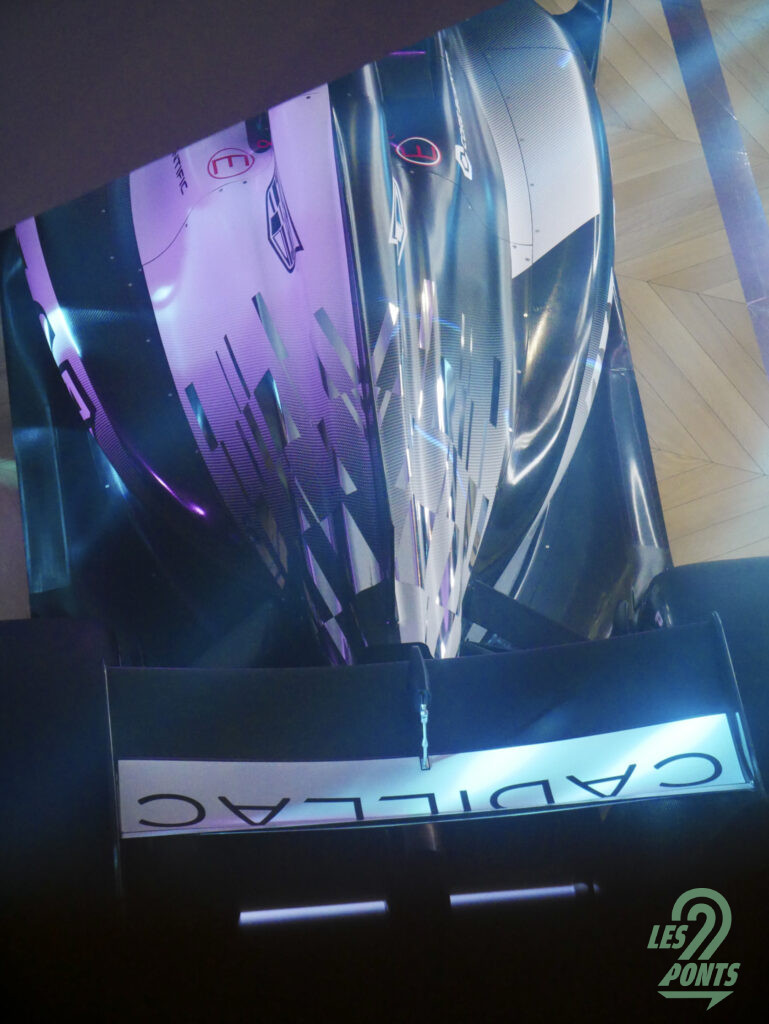 A l’avant, l’aileron de la monoplace est donc asymétrique, avec la moitié droite en noir, et une trame en partie chromée, reprenant le motif du logo Cadillac, sur l’extrémité. L’autre moitié est blanche, tout en conservant le même motif.