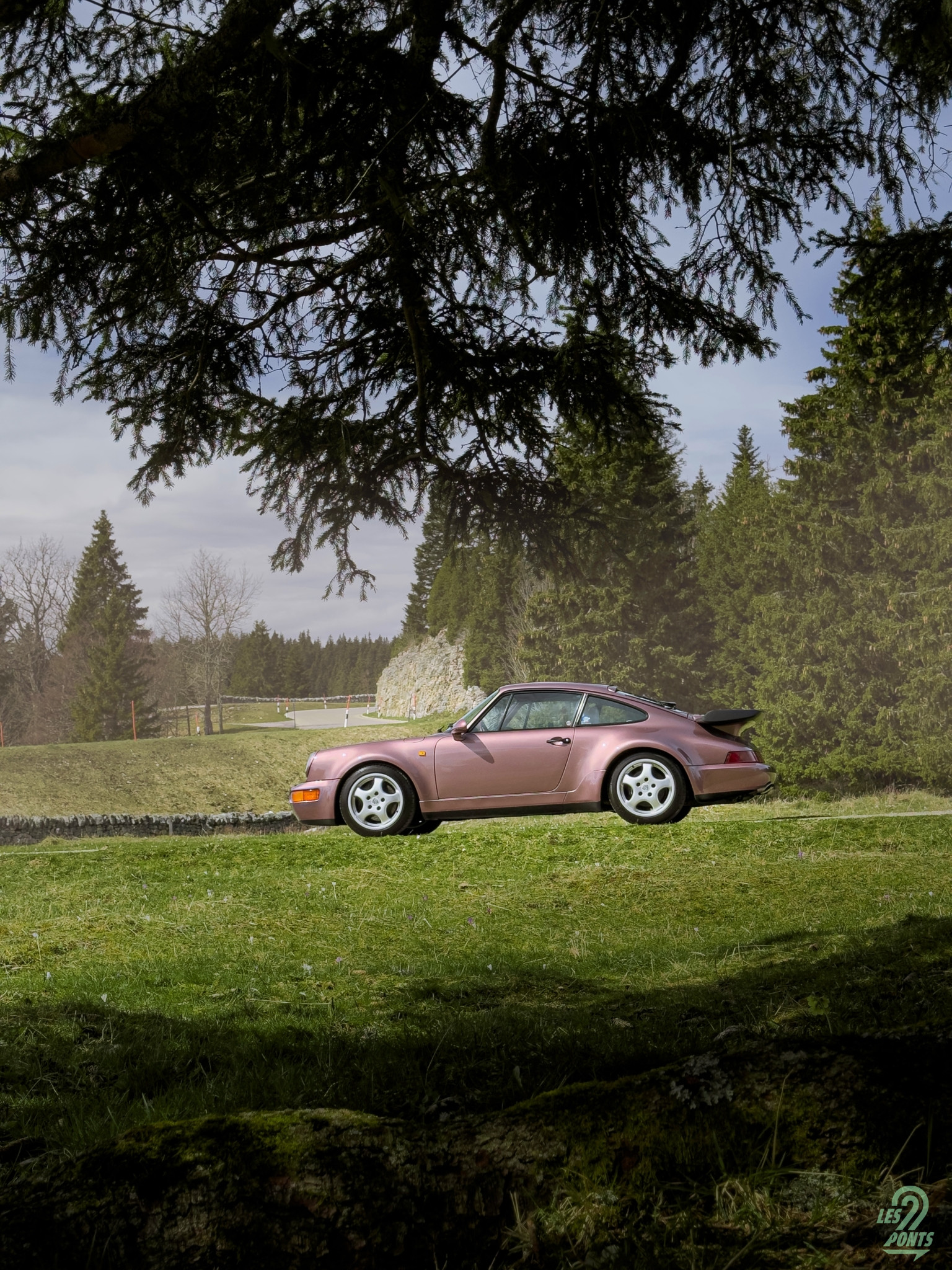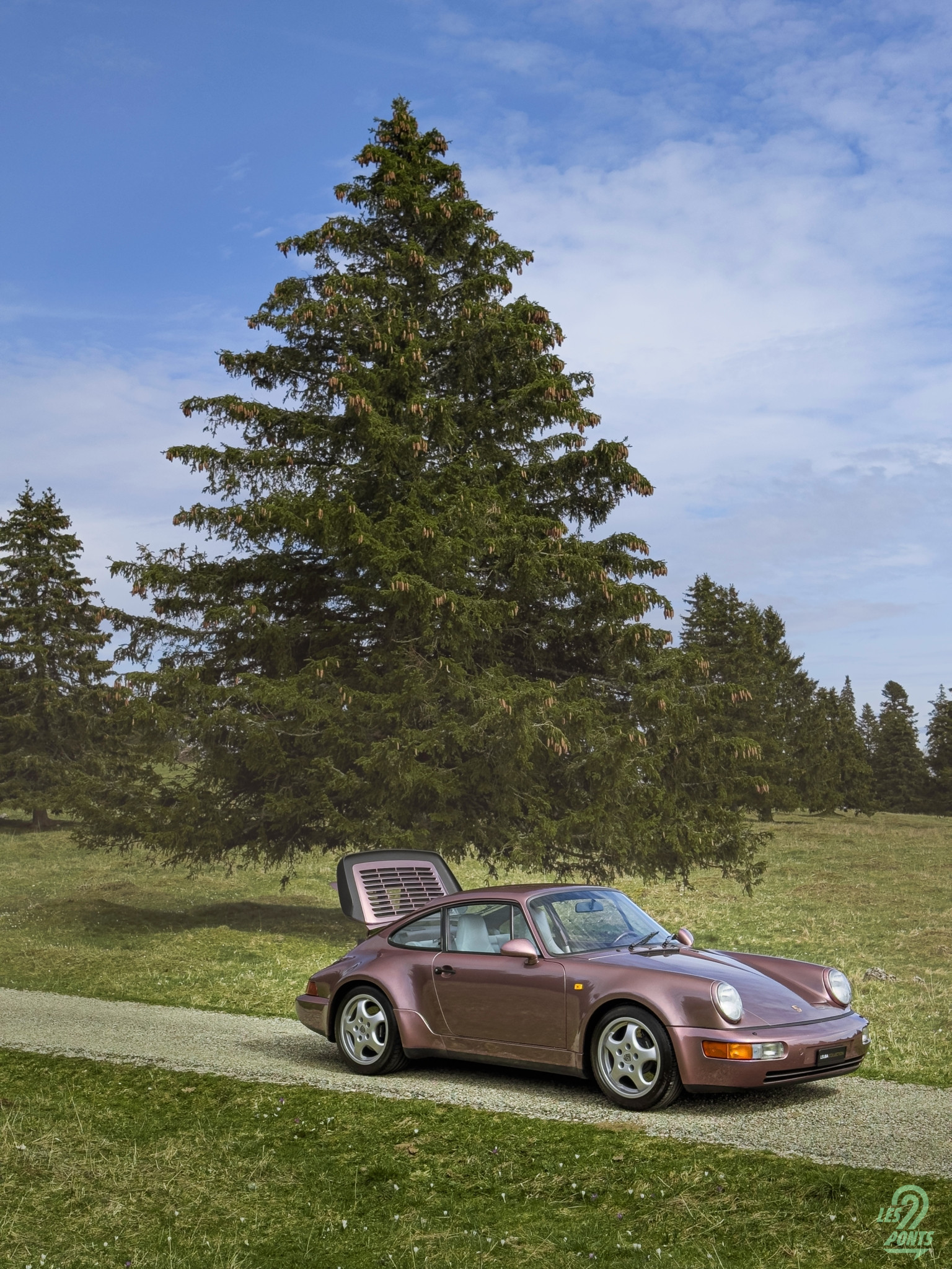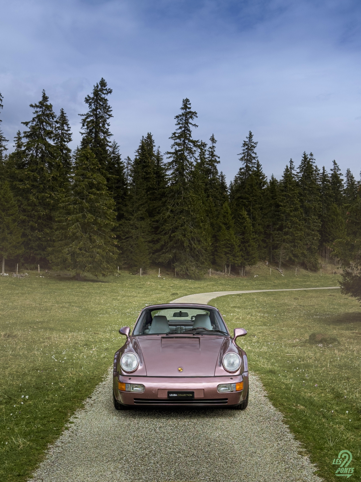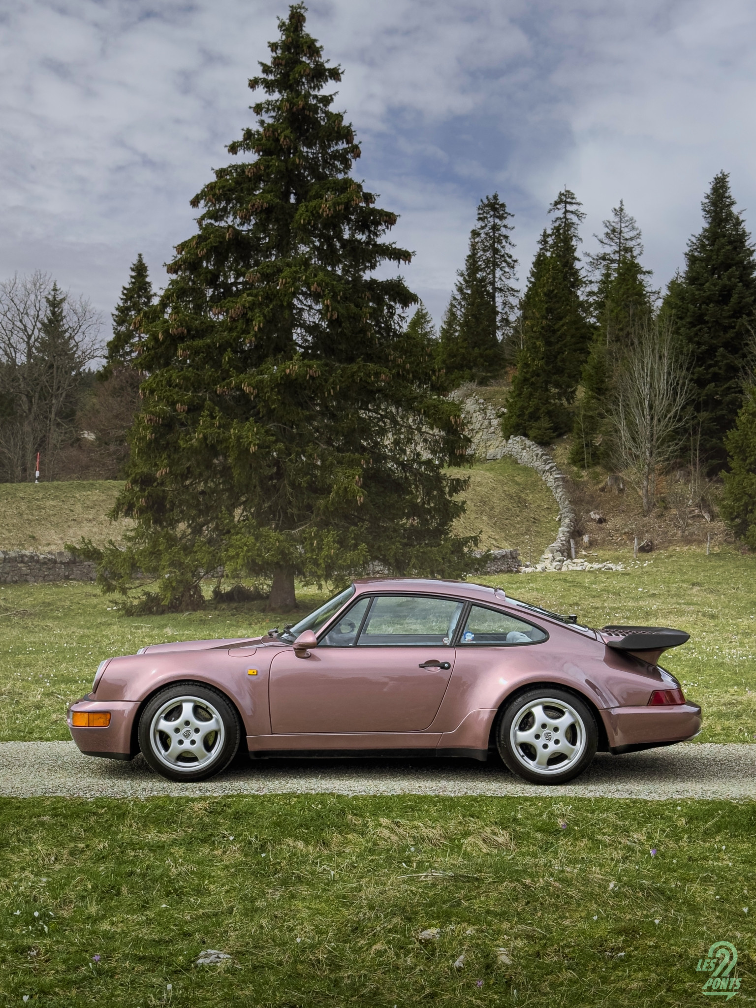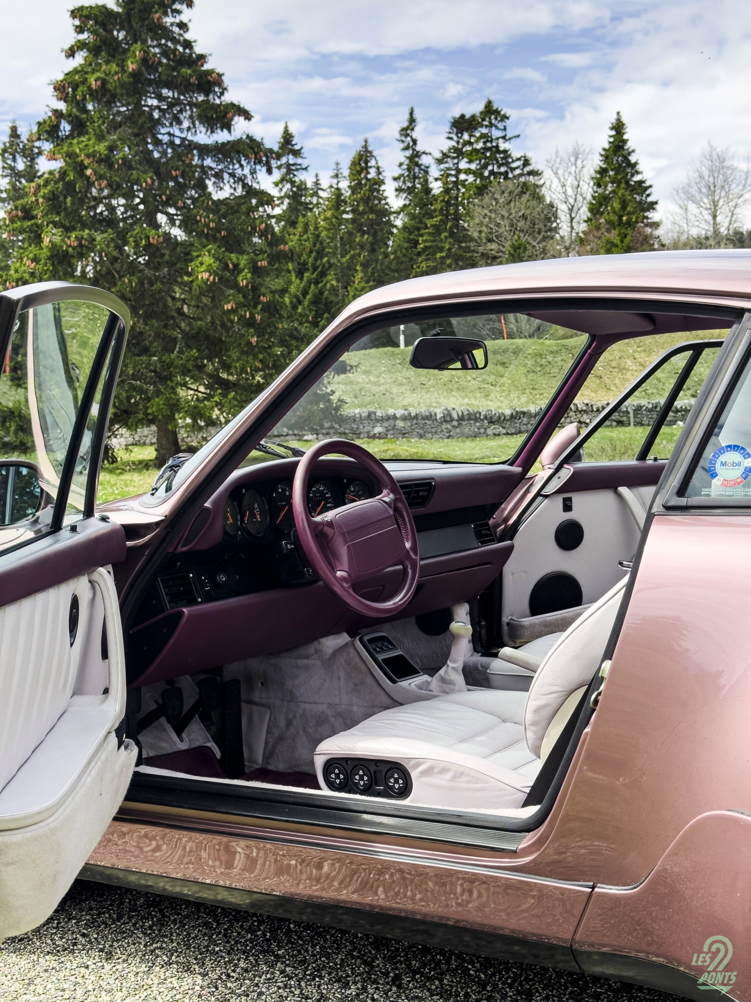 Véritable beauté fatale, cette 964 Turbo possède une teinte rare, le Cassis Red, qui est semblable à un rose poudré avec un intérieur blanc avec des touches de violets. Pour la petite histoire, cet exemplaire a été commandé par une ancienne propriétaire de 930 Turbo ayant la même teinte qui était disponible au catalogue, hors sur la 964 cette teinte n’était pas proposée, il s’agit donc d’une commande spéciale.