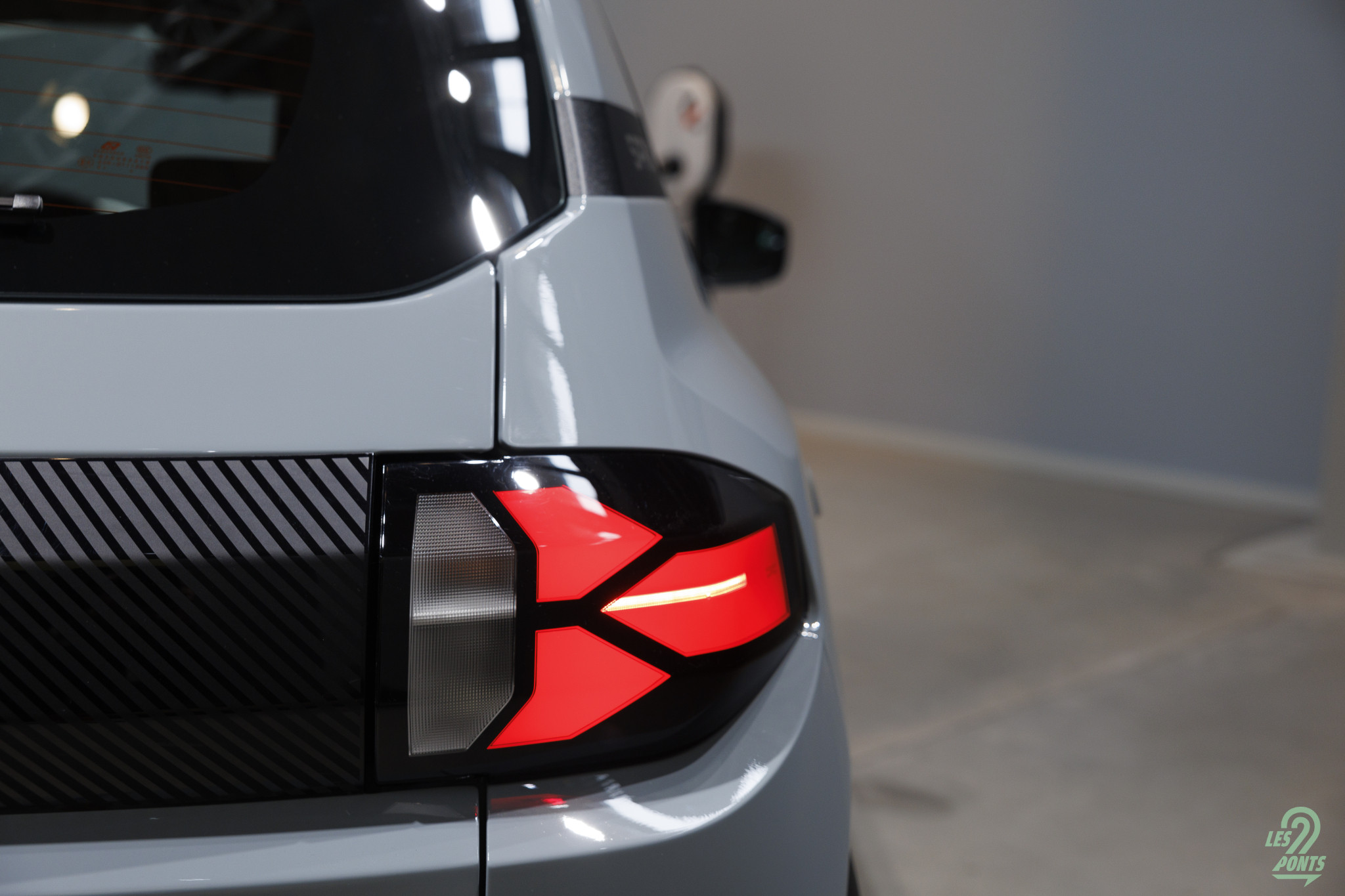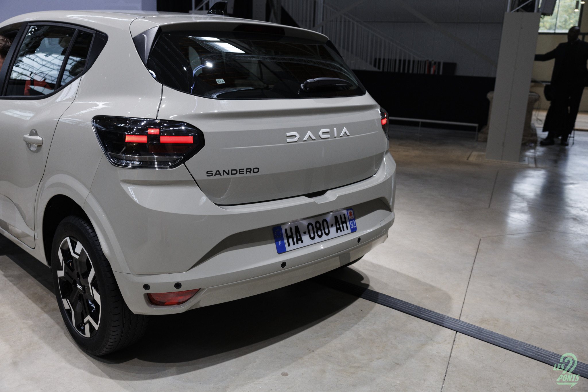 On note que la Sandero Stepway, variante baroudeuse et plus haut de gamme de l’auto, cherche à se distinguer davantage : les éléments en plastique brut adoptent le matériau Starkle issu des Duster et Bigster, formé de 20% de matériaux recyclés. Aussi, le bouclier arrière est redessiné, et l’auto adopte un bandeau noir sous forme de sticker reliant les deux optiques arrière. L’effet est … étonnant, notamment par le fait que le sticker laisse un jour assez important de chaque côté ! A revoir.