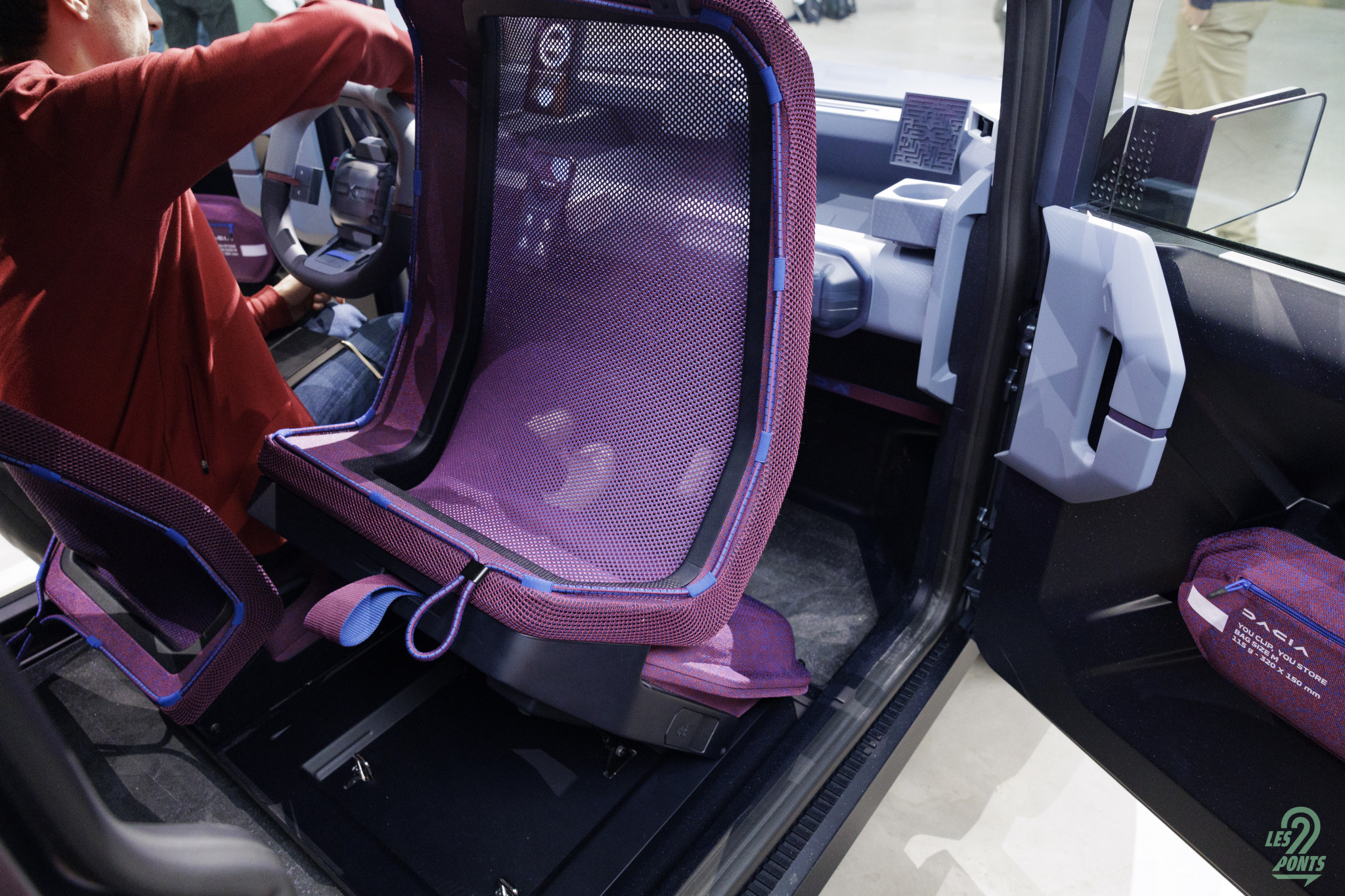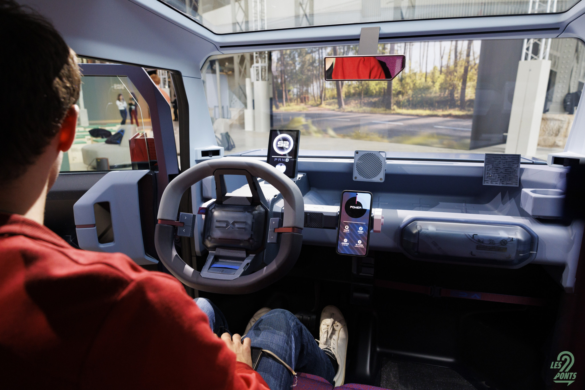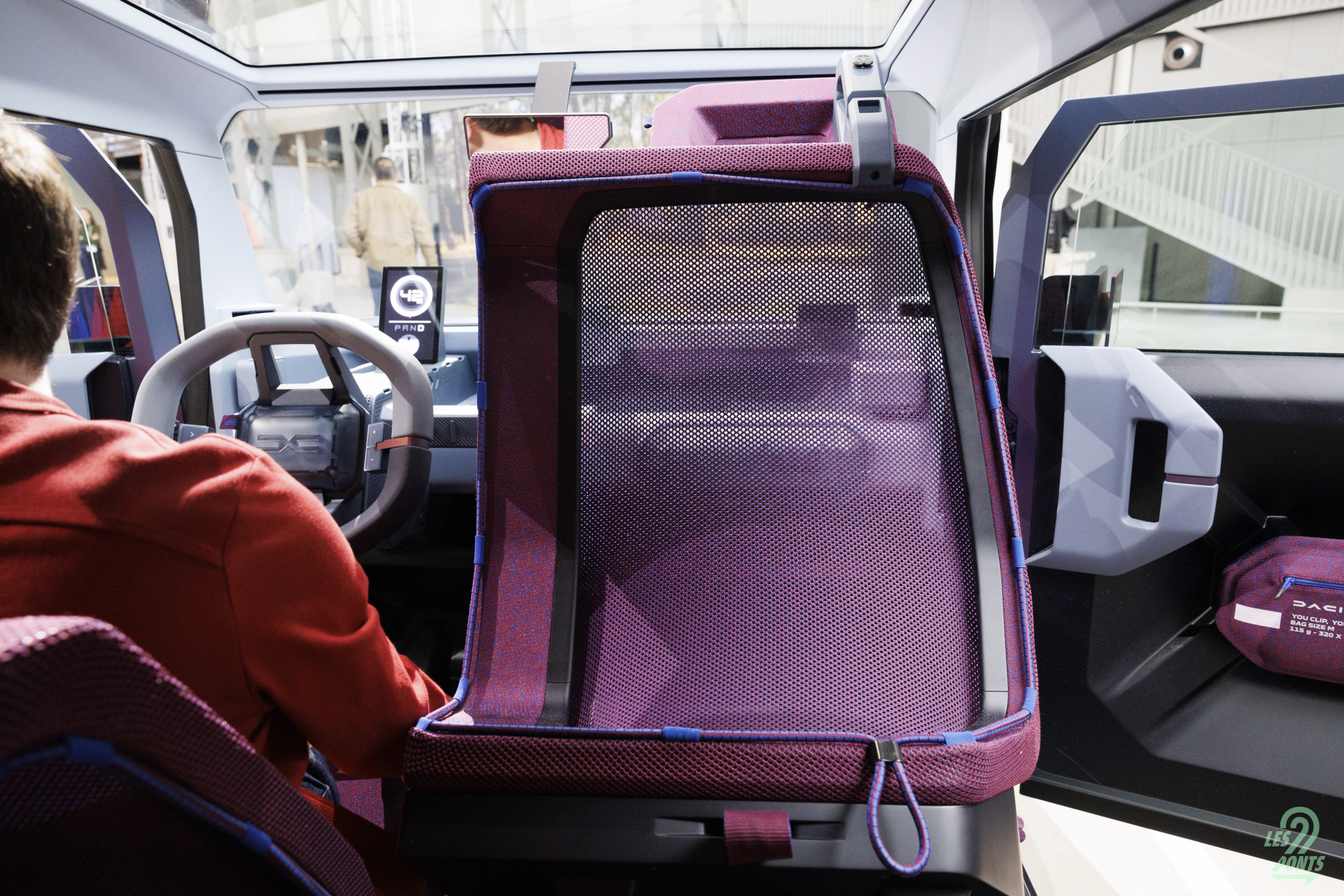 On évoquait les astuces Dacia, ce concept en fourmille. Poignées de portes remplacées par des sangles (cela fonctionne bien !), sièges extrêmement fins et pourtant confortables, pas d’écran tactile mais un support de téléphone et une application générale dédiée (déjà répandu en entrée de gamme sur la globalité des Dacia), toutes les commandes regroupées autour de la colonne de direction pour simplifier l’intégration des composants, et le poids final. Dacia justement parle de moins de 800 kg !! Colin Chapman valide à coup sûr.