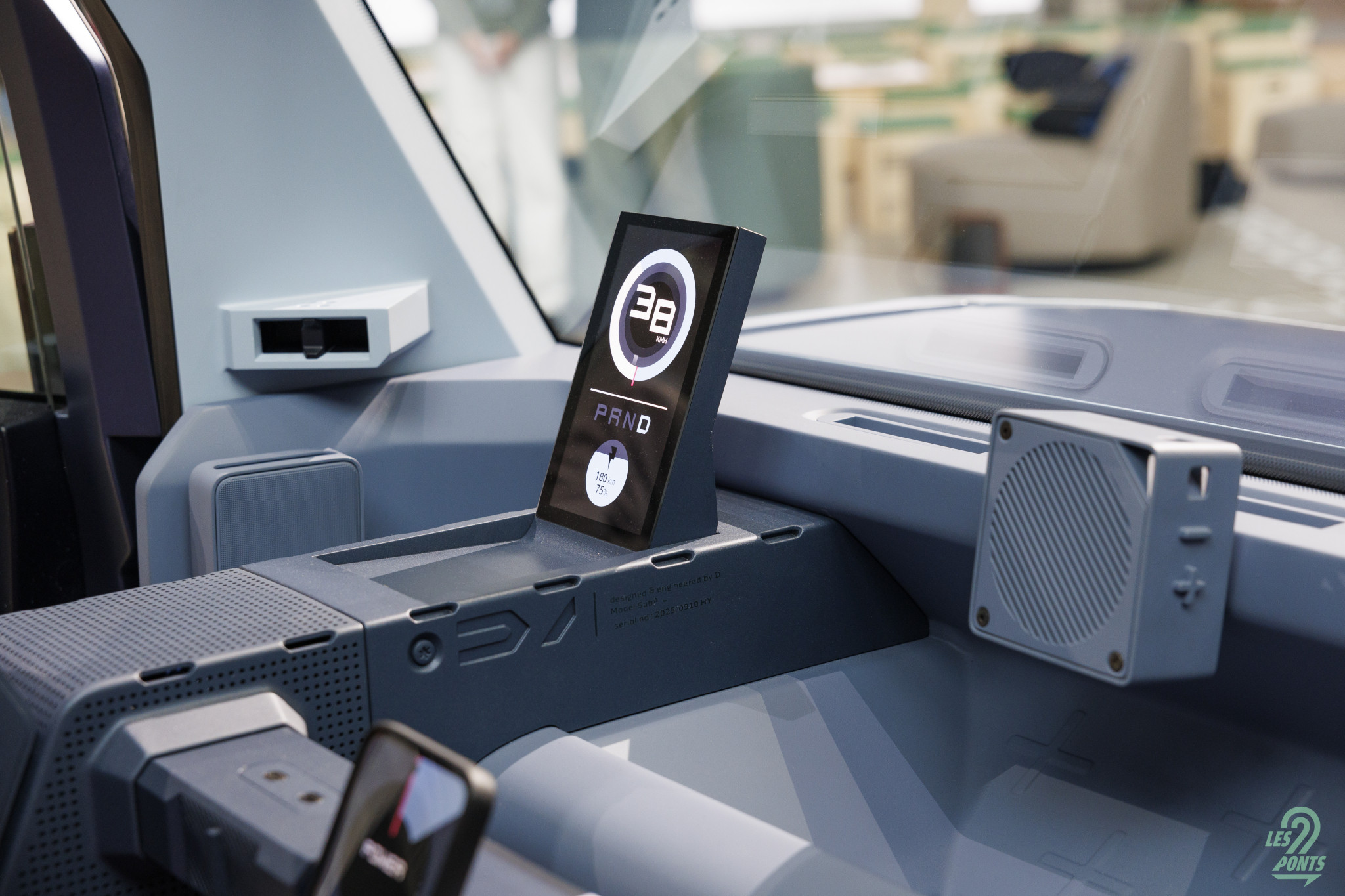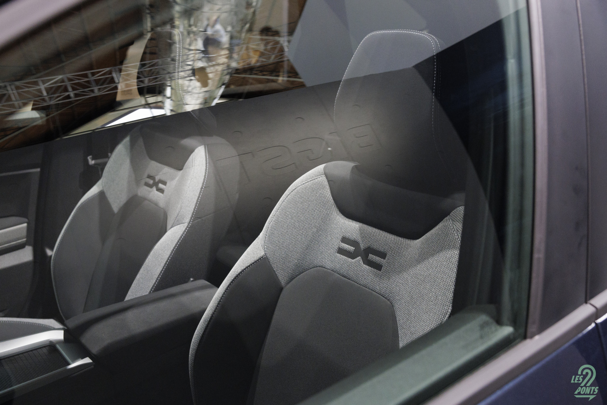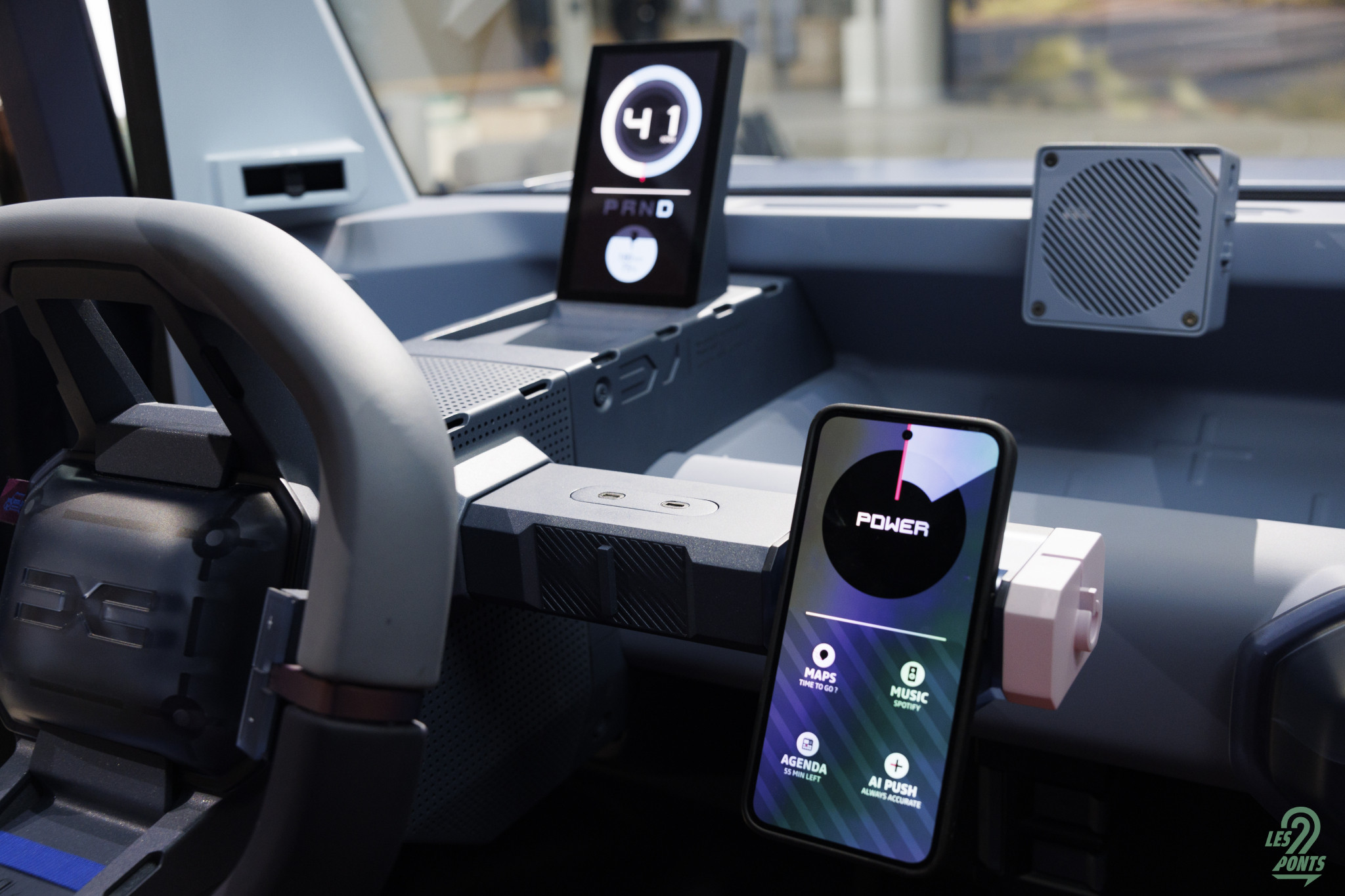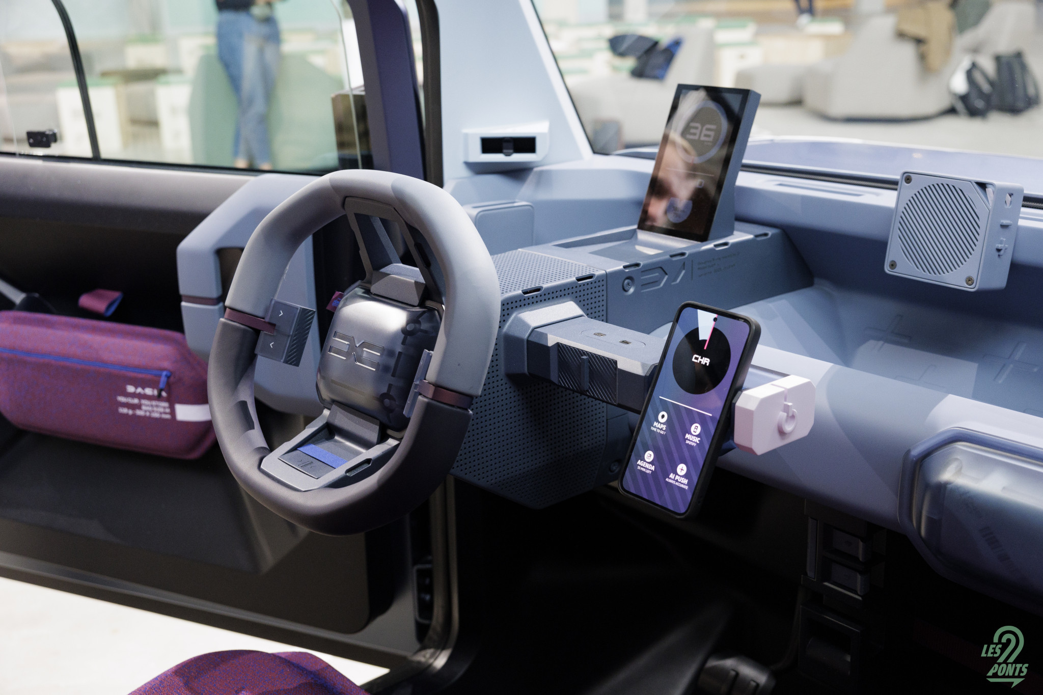 On évoquait les astuces Dacia, ce concept en fourmille. Poignées de portes remplacées par des sangles (cela fonctionne bien !), sièges extrêmement fins et pourtant confortables, pas d’écran tactile mais un support de téléphone et une application générale dédiée (déjà répandu en entrée de gamme sur la globalité des Dacia), toutes les commandes regroupées autour de la colonne de direction pour simplifier l’intégration des composants, et le poids final. Dacia justement parle de moins de 800 kg !! Colin Chapman valide à coup sûr.