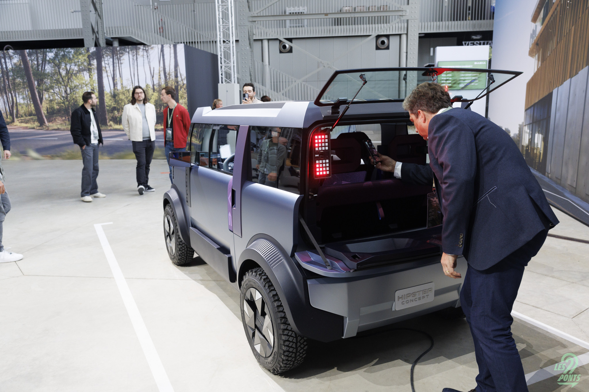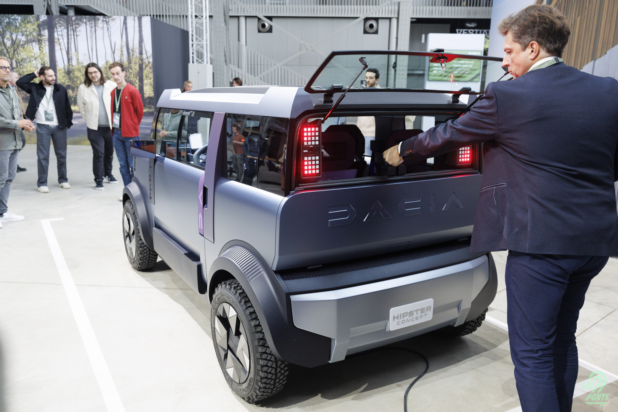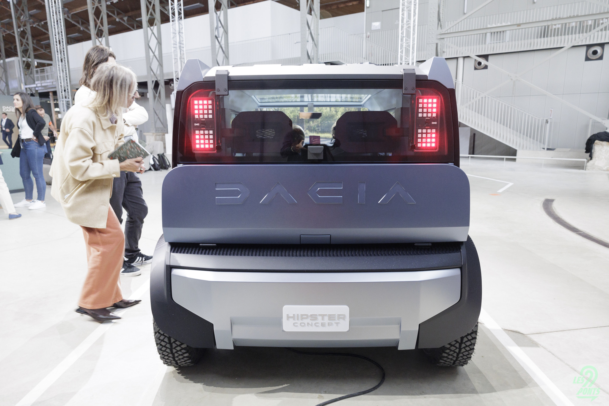 Le meilleur pour la fin ? Le Hipster Concept ! Selon le discours des hautes têtes pensantes de la marque présentées en début d’évènement, voilà la vision d’avenir ultime de Dacia comme auto électrifiée et “essentielle”. Quel est le strict nécessaire pour l’extra-urbain de demain ? Quatre places dans un gabarit ultra contenu de 3 m de long (1,53 de haut, 1,55 m de large, deux recharges électrique pour une semaine de trajets du quotidien / domicile-travail, et de quoi occasionnellement transporter une machine à laver (!) : le coffre passe d’un volume limité de 70 à 500 L en rabattant les deux sièges arrière.