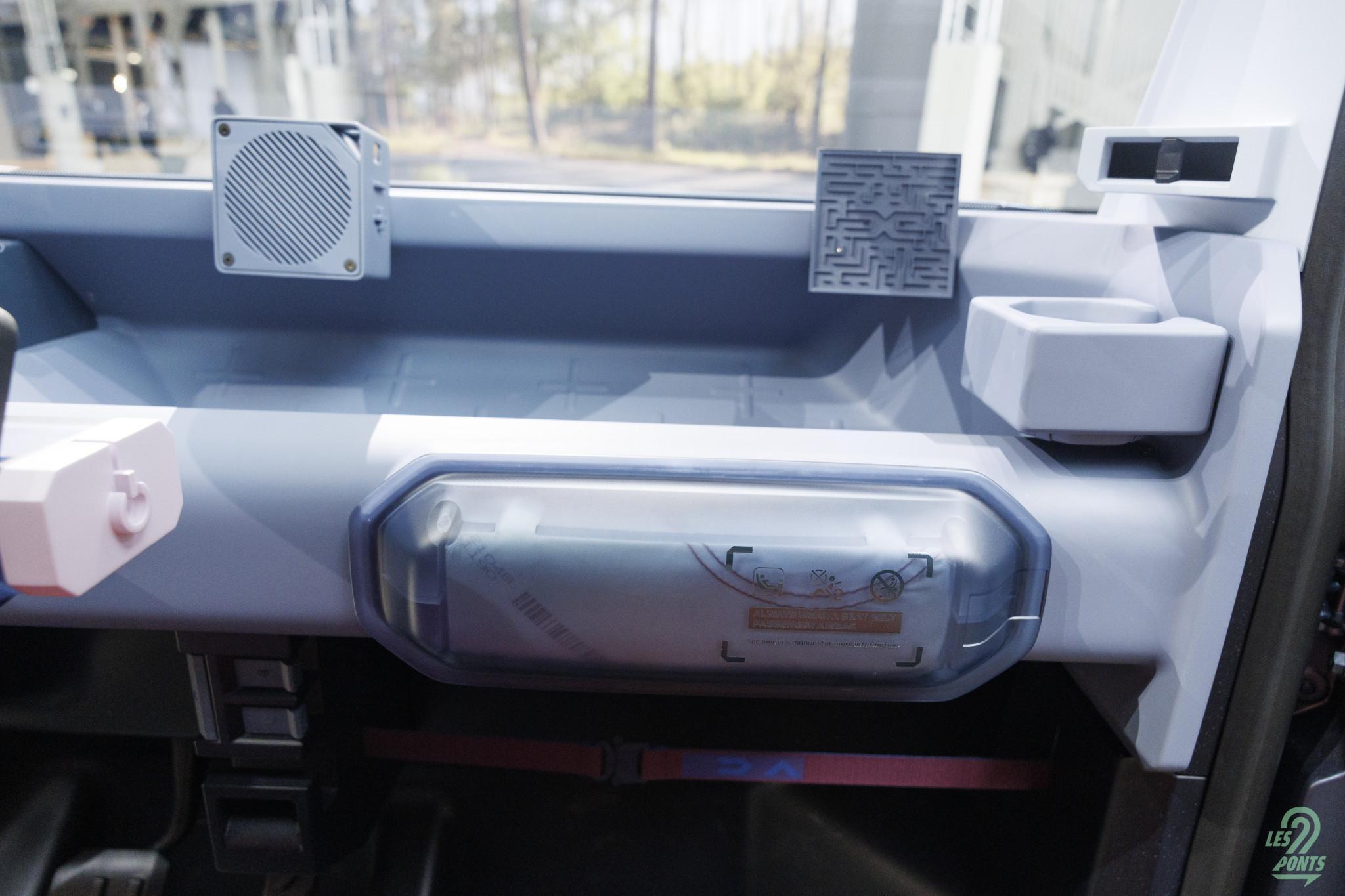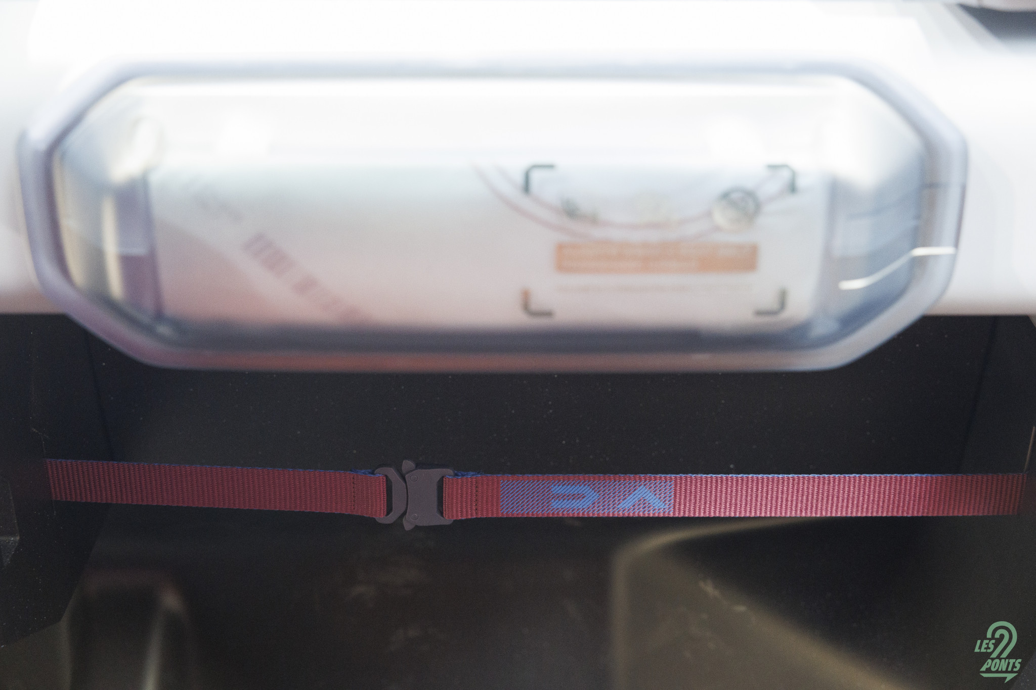 - Une sangle pour maintenir des valises imposantes côté passager. Cela rappelle la Citroën Ami.