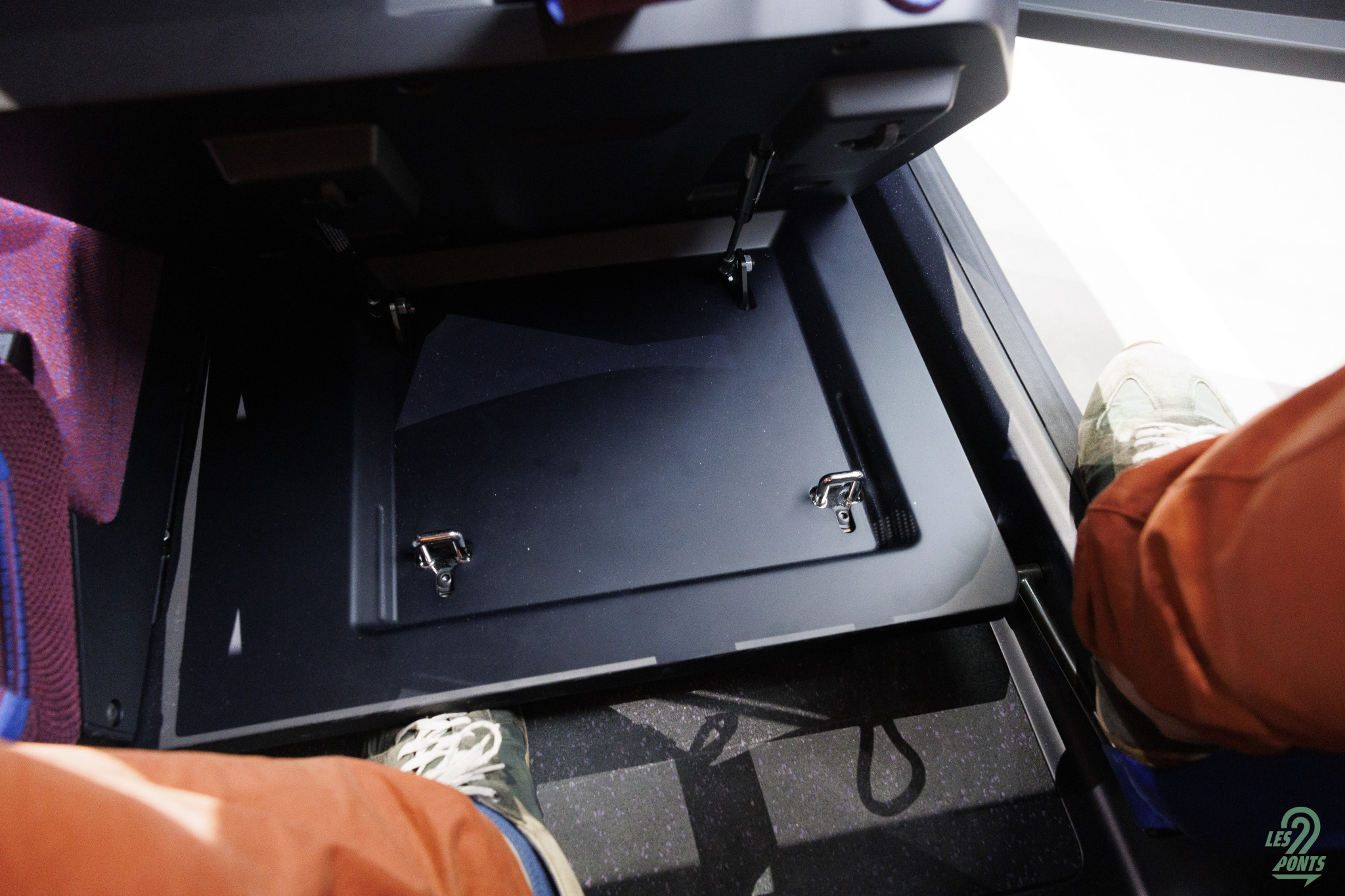 - On peut glisser ses pieds sous cette plaque, qui fait sinon reposer les sièges avant.