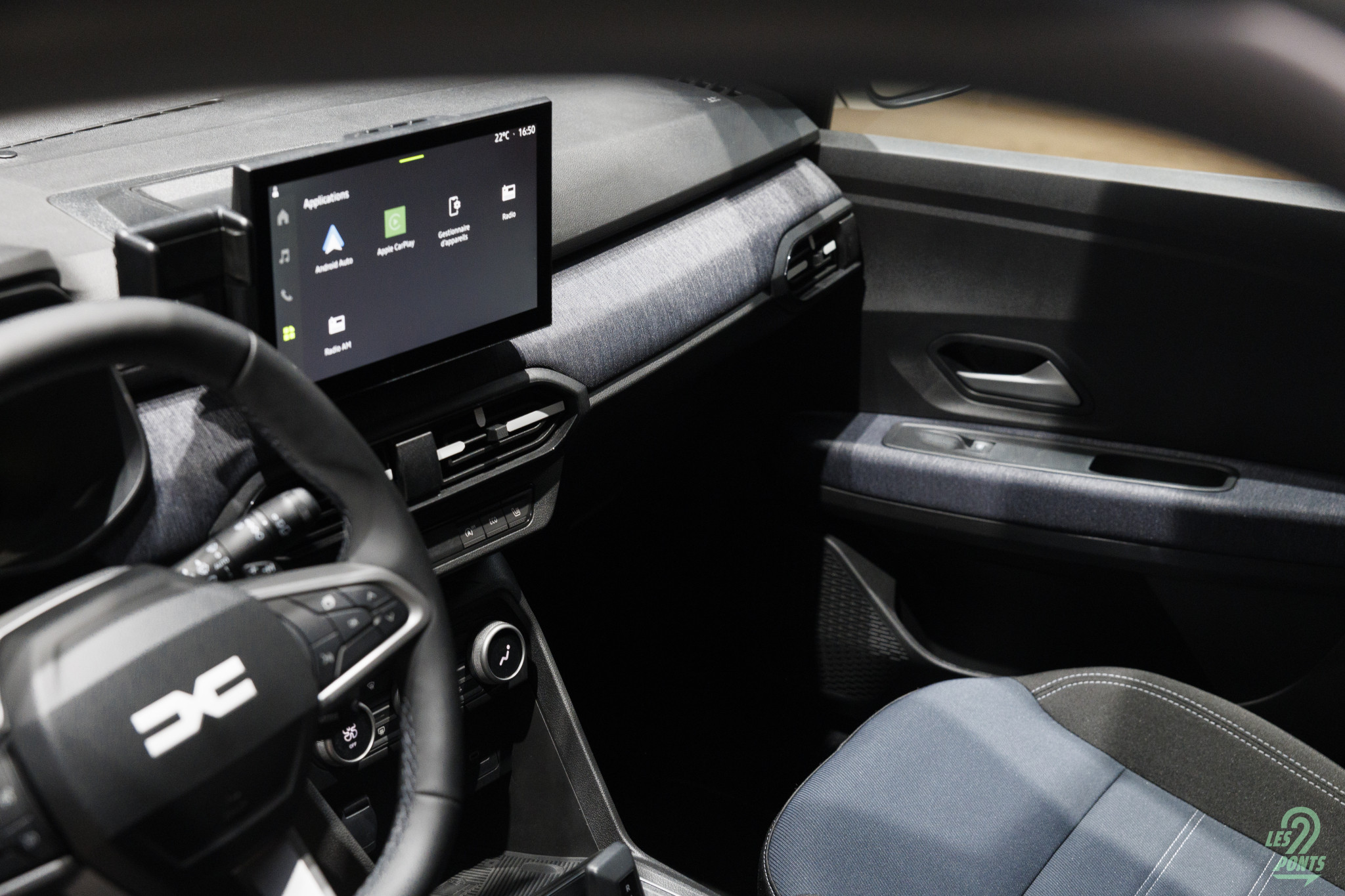 L’auto accueille le combiné d’instrumentation couleur des Duster et Bigster, et un nouvel écran central tactile de 10 pouces. La récente finition haut de gamme de la Sandero, Journey, accueille de nouveaux habillages : biton noir et bleu pour les sièges, et un tissu façon jean sur la console centrale et les contreportes, qui rappelle dans l’esprit ce qui est fait sur les cousines star Renault 4 et 5 E-Tech ! Si on était tâtillons, on pourrait penser qu’hélas les deux tons de bleus s’accordent moyennement : à revoir avec la lumière du jour.